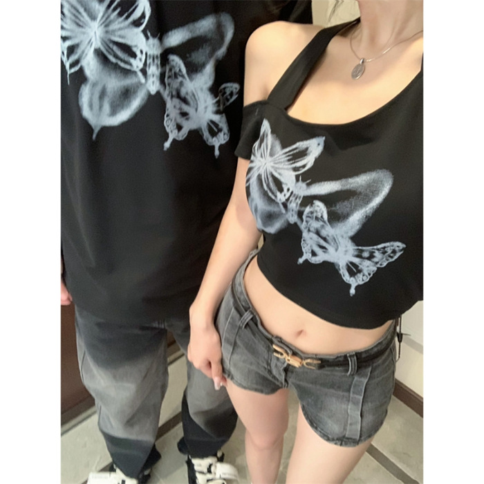미국 레트로 스파이스 소녀 어깨 목면 반팔 티셔츠 여성 여름 디자인 나비 인쇄 짧은 상단