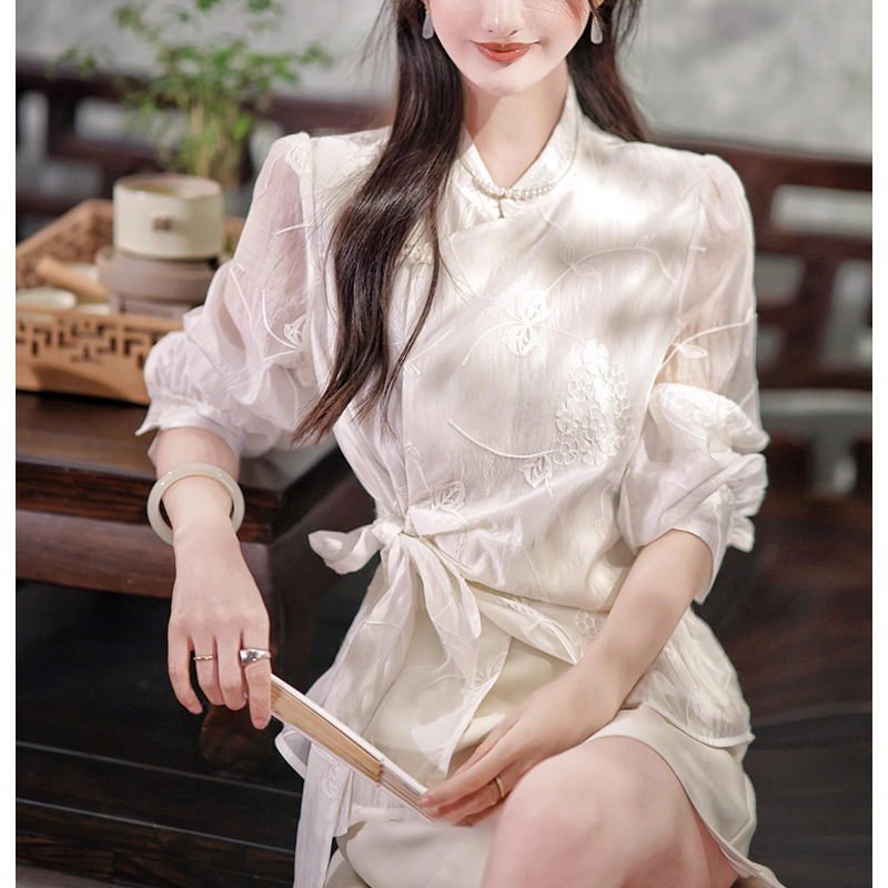 | 화이트 옥. 요정 탑 | 새로운 중국 셔츠 2024 여름 새로운 텐셀 쉬폰 수 놓은 국가 스타일 여성용