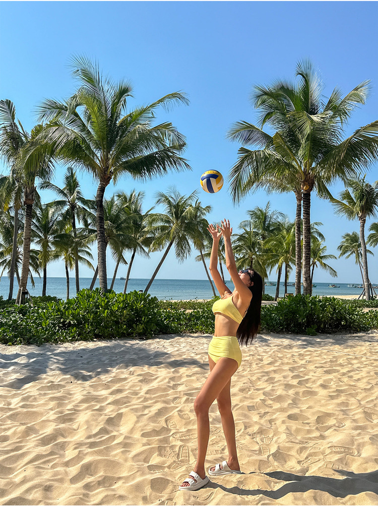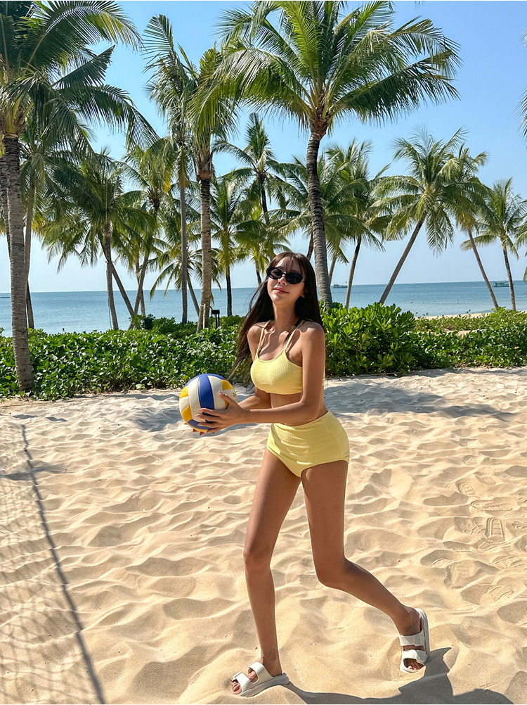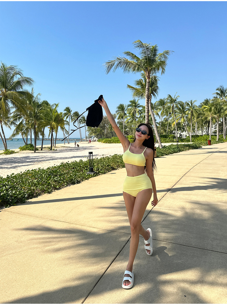 소스 공장 솔리드 컬러 화이트 하이 허리 타이트 슬림 스트랩 개더 보수적 인 소녀 스파 휴일 분할 수영복