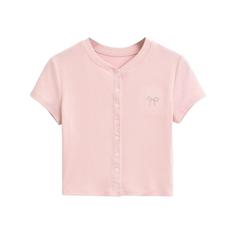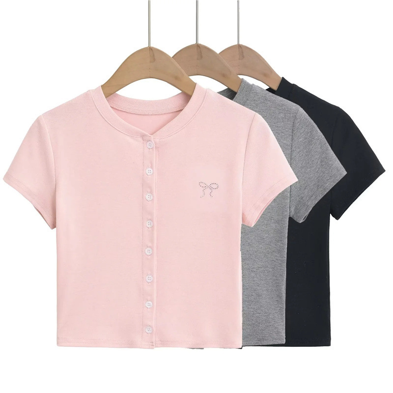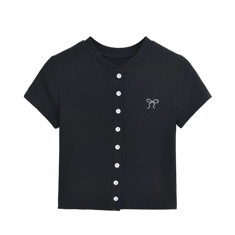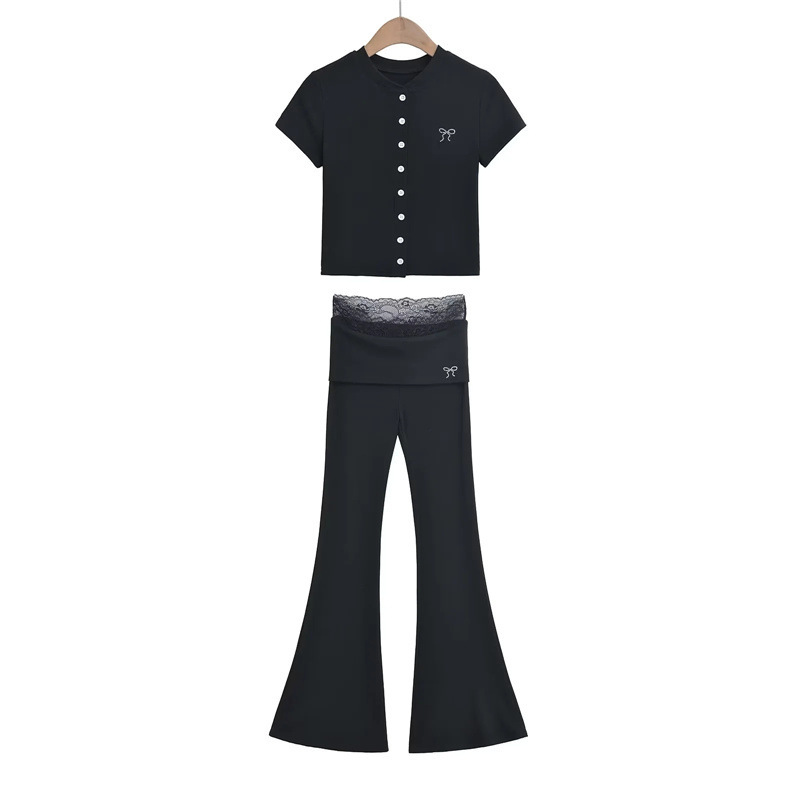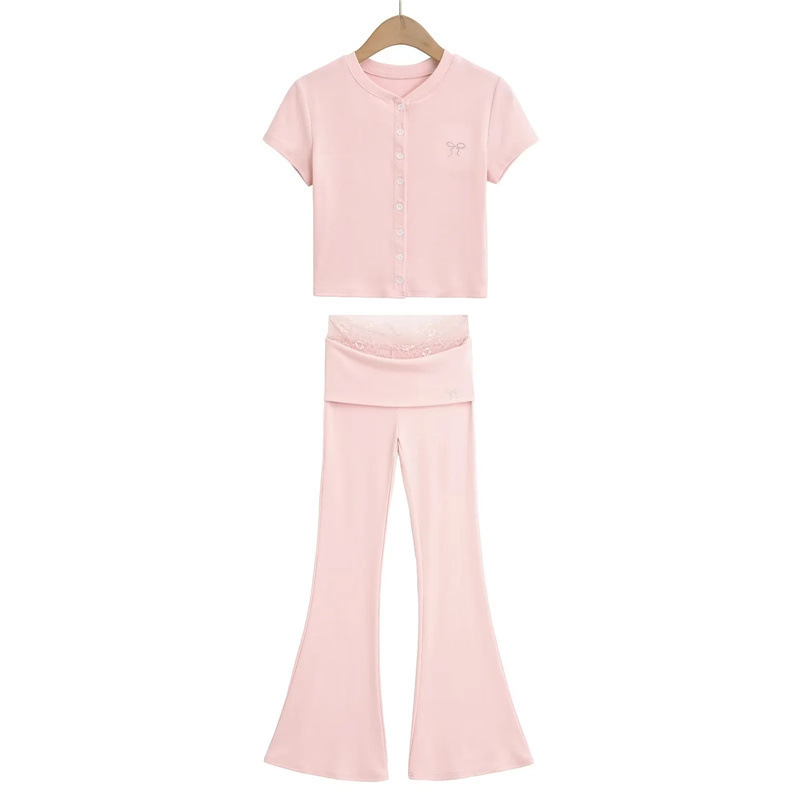 아메리칸 스타일 핫 라인스톤 라운드 넥 싱글 브레스트 하이 웨이스트 배벨 반팔 티셔츠 카디건 레이스 스티칭 플레어 바지 스파이스 걸스 세트