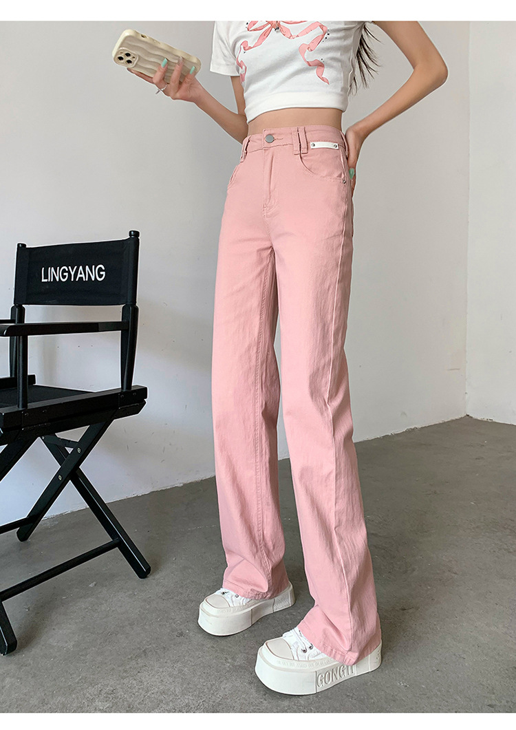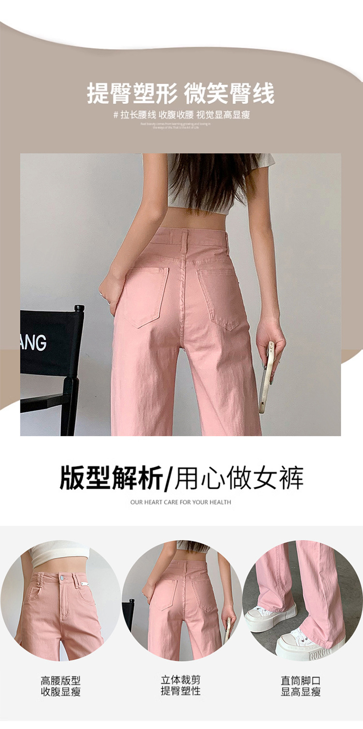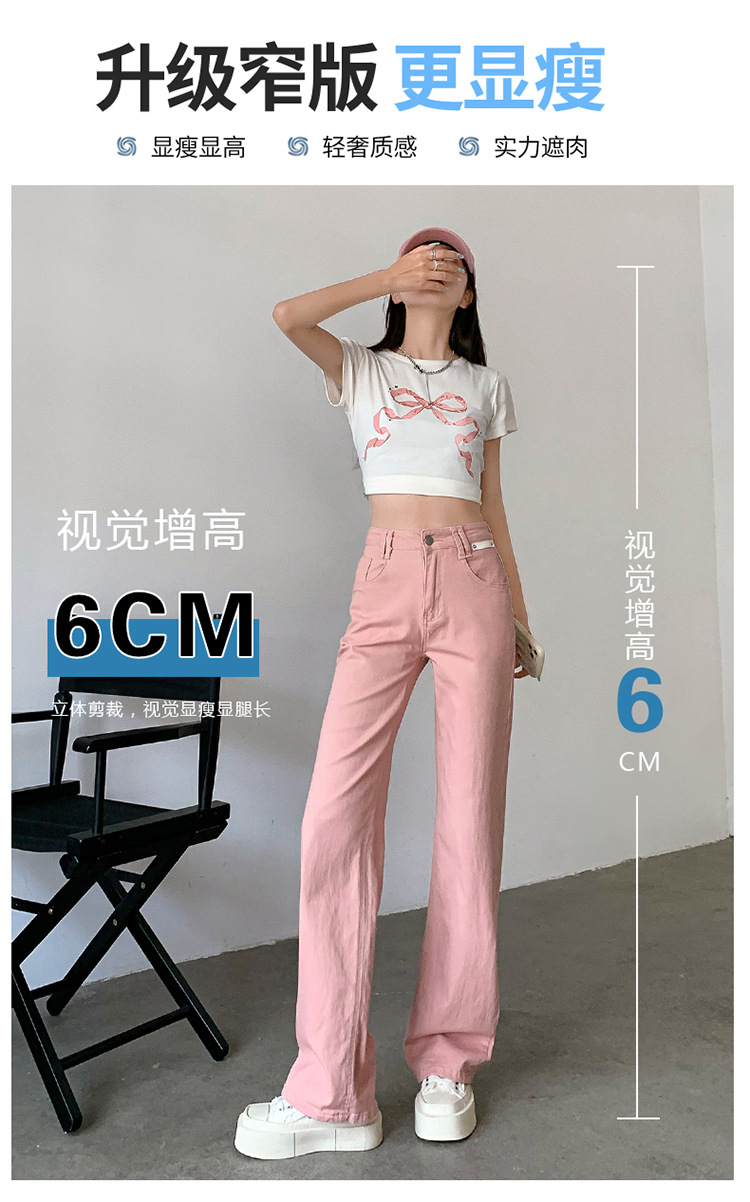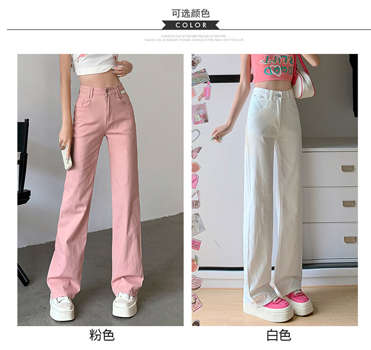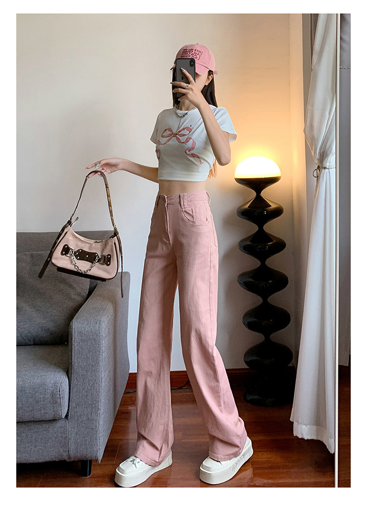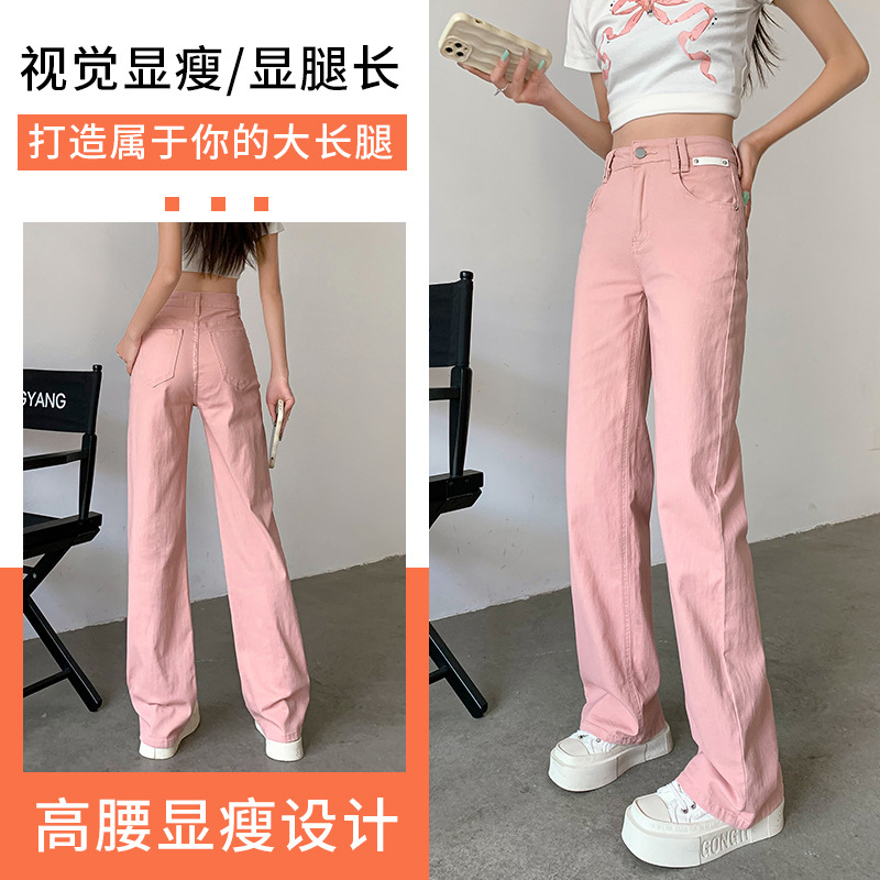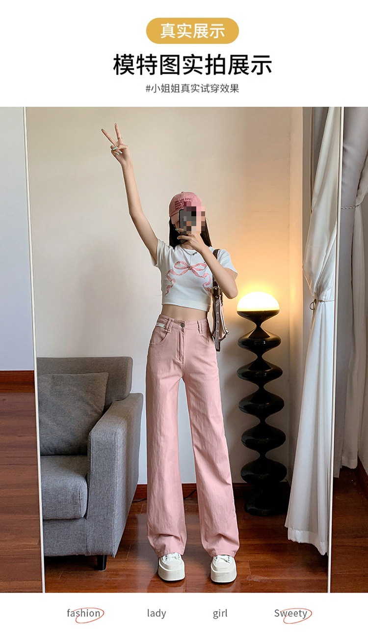 2024 여름 올매치 캐주얼 신선한 핑크 데님 와이드 레그 팬츠 여성의 새로운 하이 웨이스트 슬리밍 스트레이트 팬츠스토어 가기