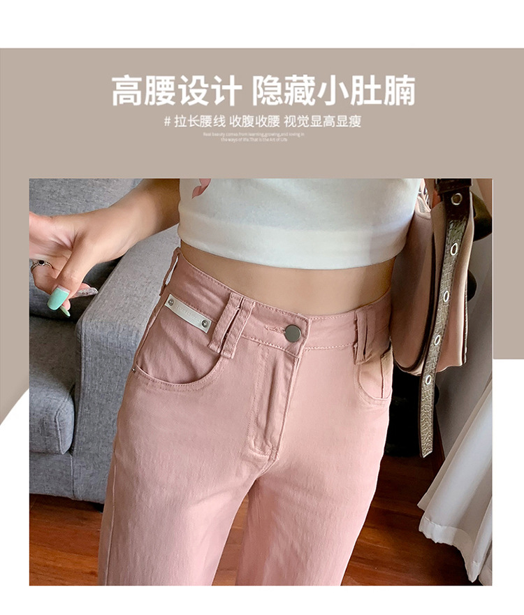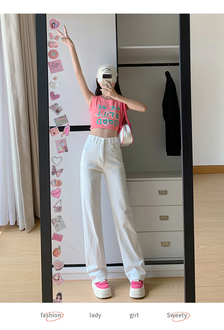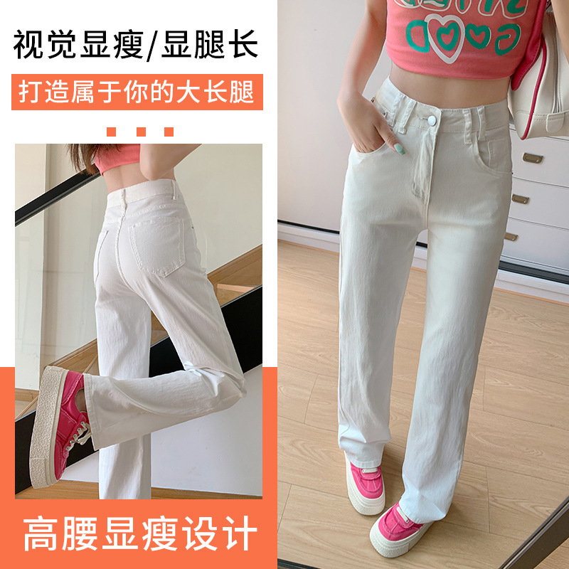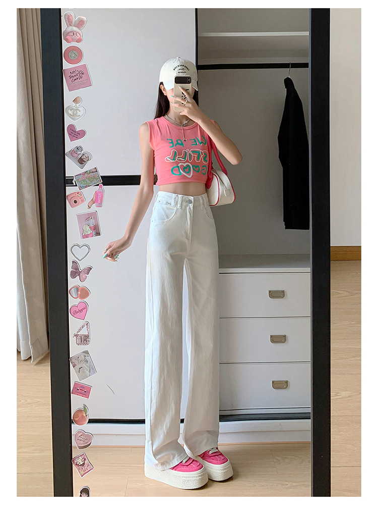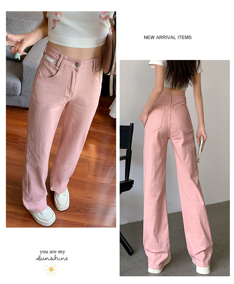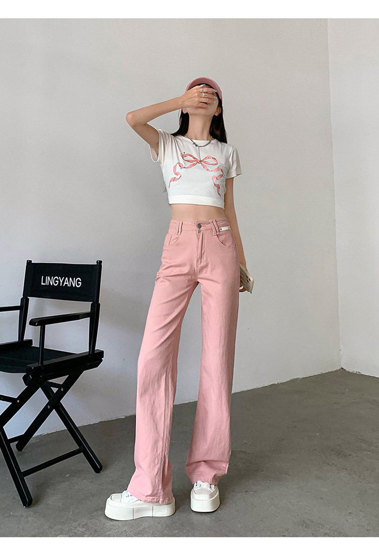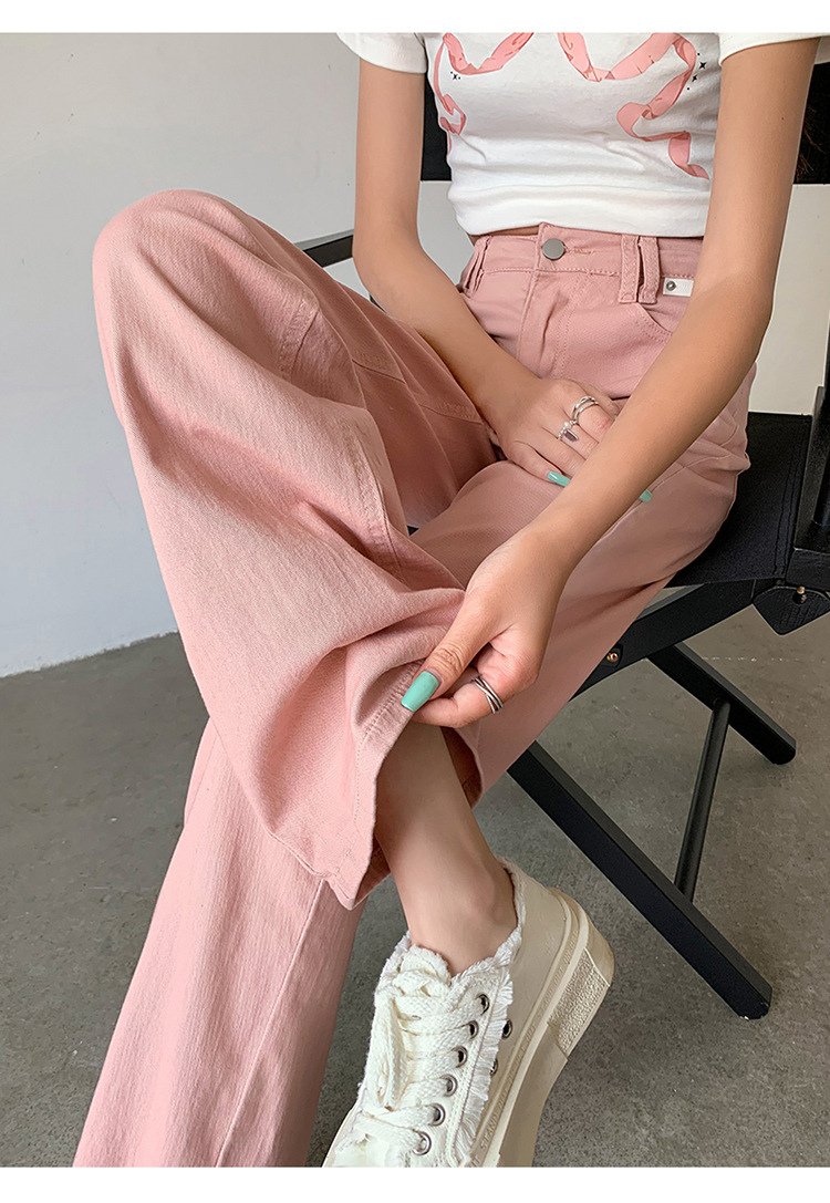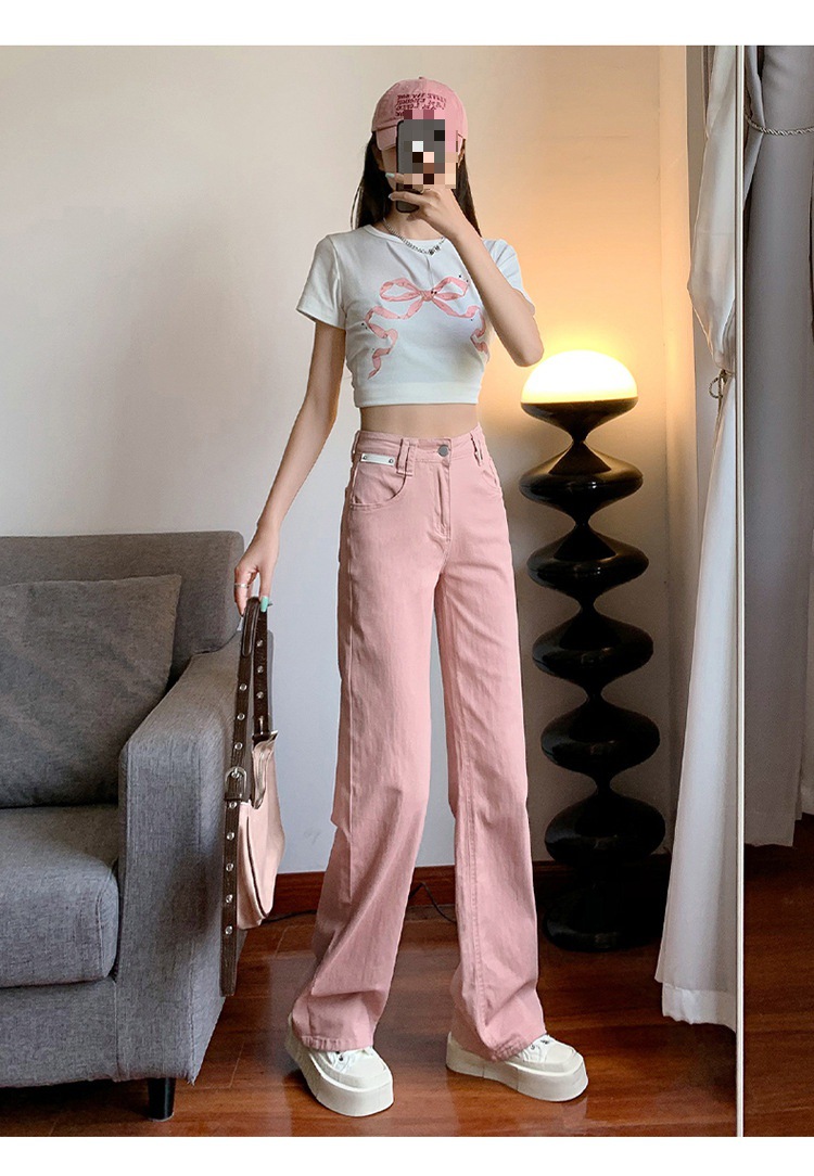 2024 여름 올매치 캐주얼 신선한 핑크 데님 와이드 레그 팬츠 여성의 새로운 하이 웨이스트 슬리밍 스트레이트 팬츠스토어 가기