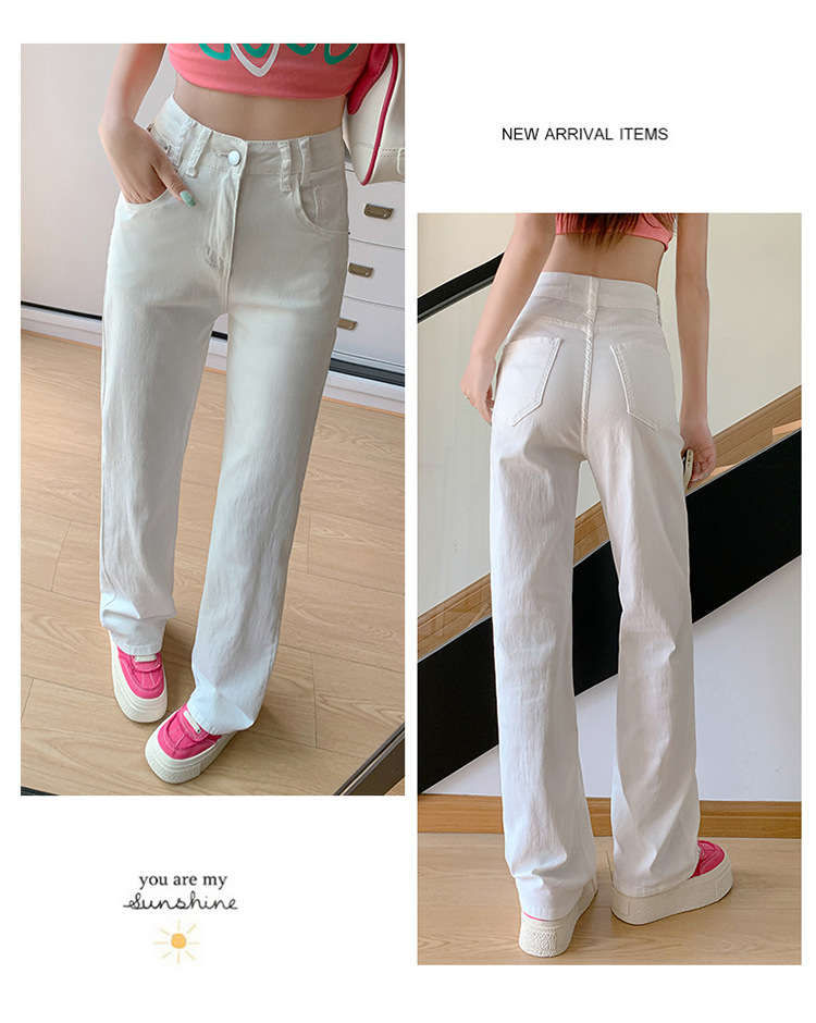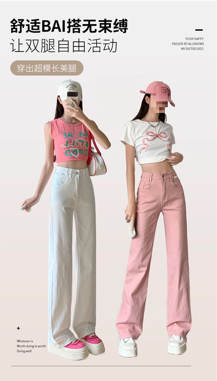 2024 여름 올매치 캐주얼 신선한 핑크 데님 와이드 레그 팬츠 여성의 새로운 하이 웨이스트 슬리밍 스트레이트 팬츠