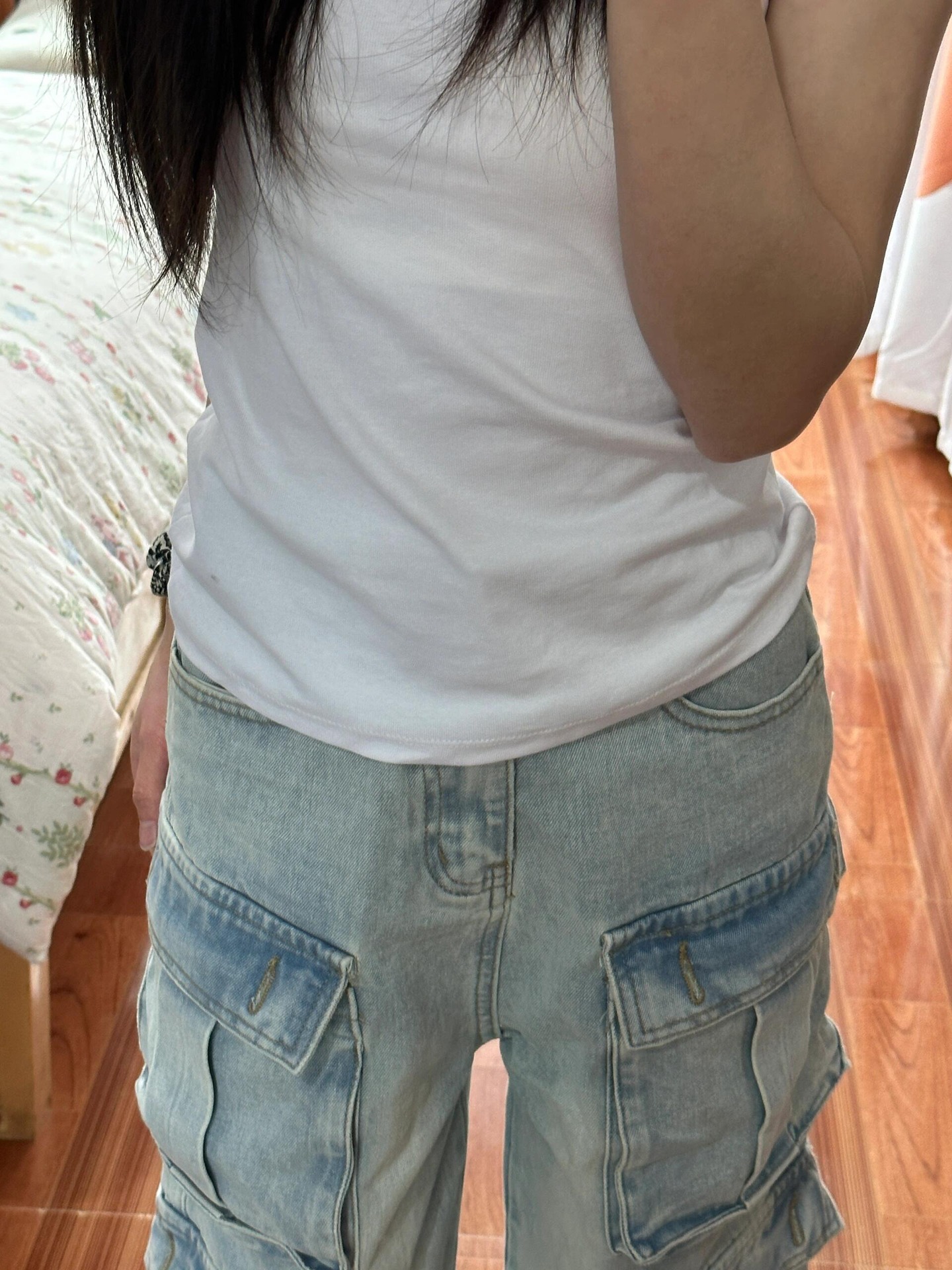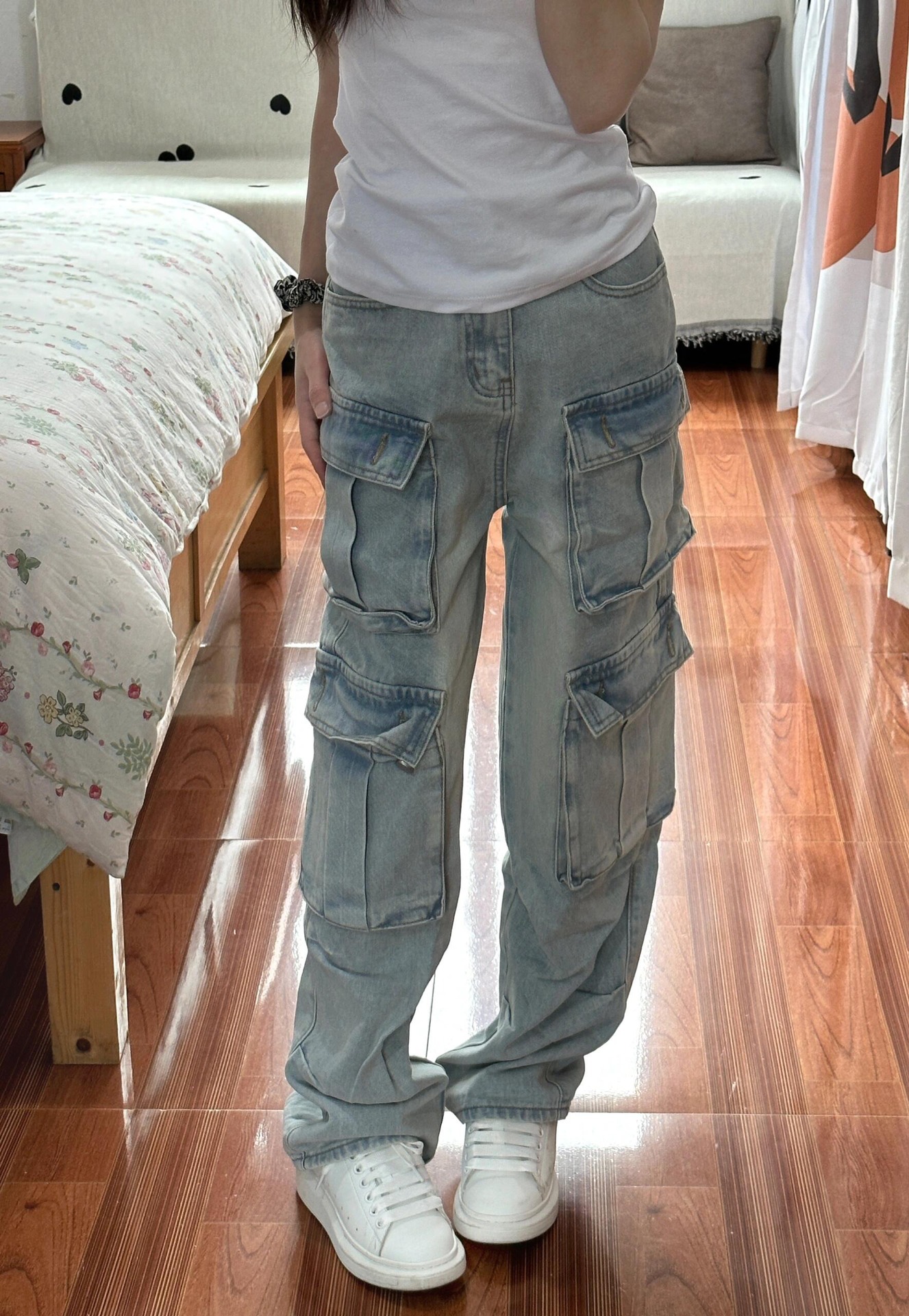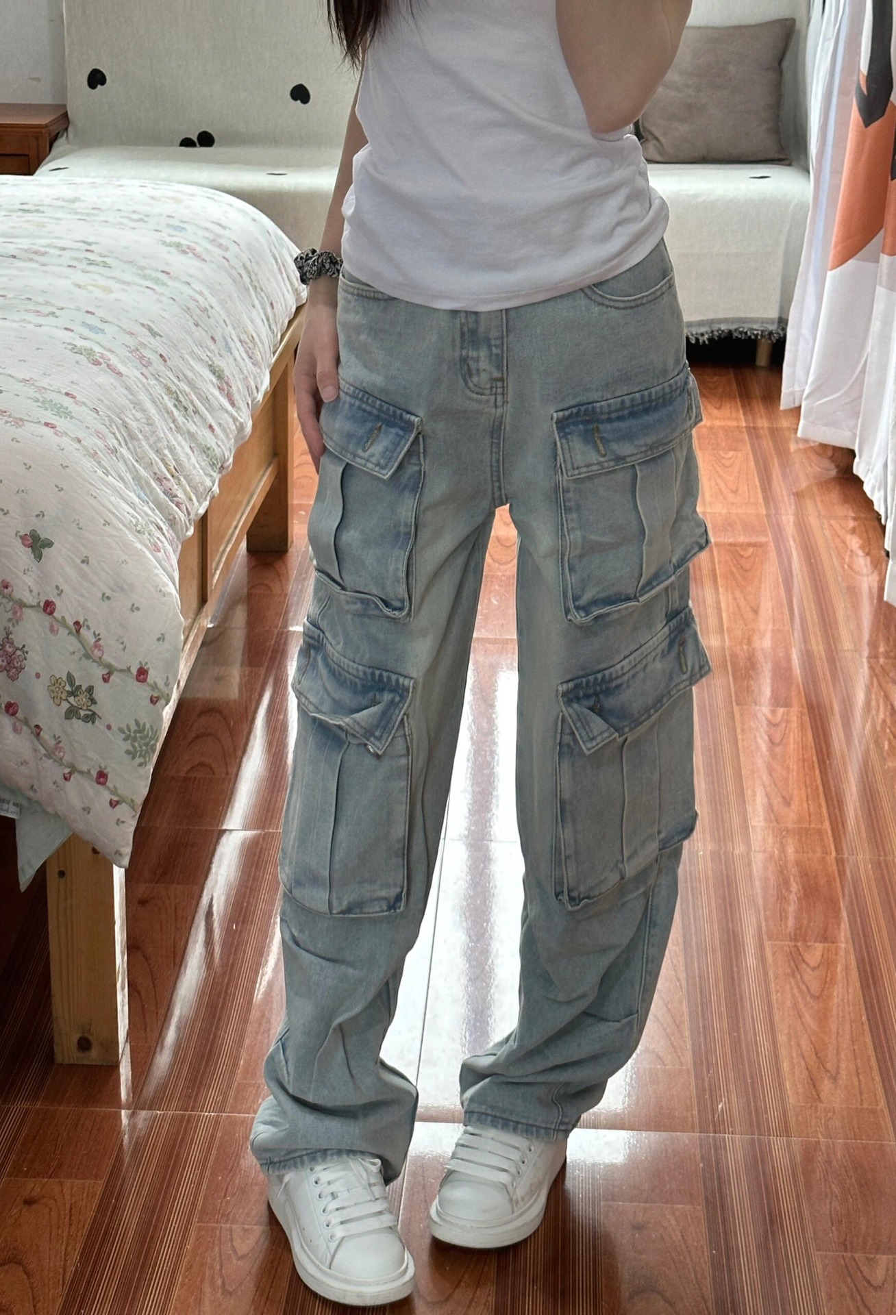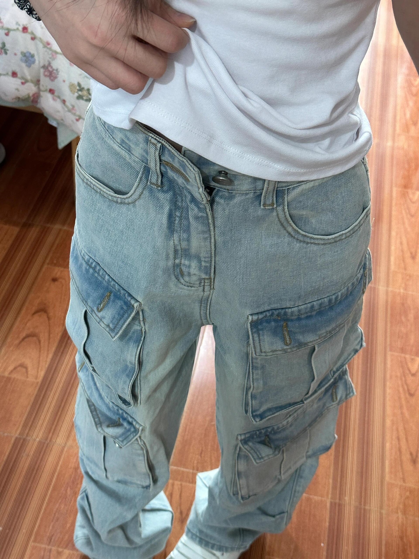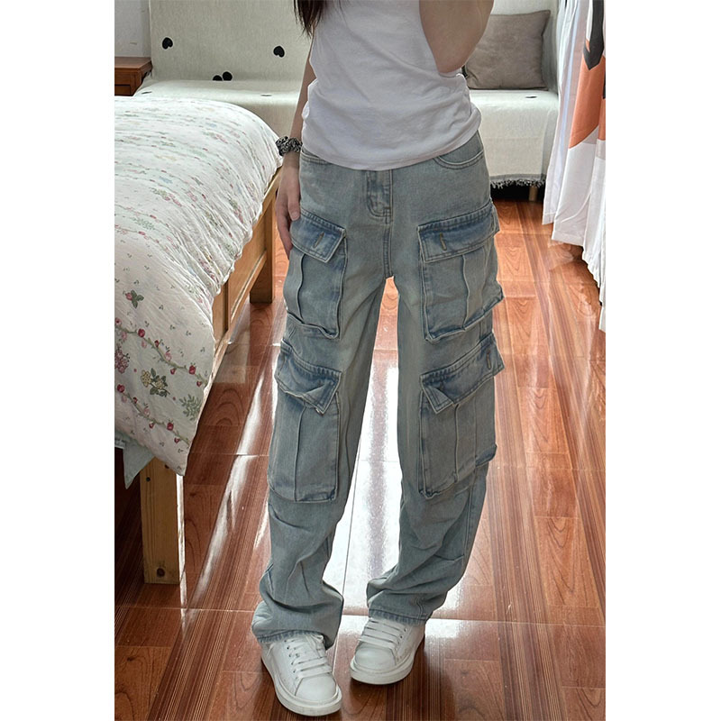 아메리칸 스타일 레트로 라이트 블루 청바지 여성 여름 디자인 센스 멀티 포켓 하이 웨이스트 스트레이트 툴링 와이드 레그 바지스토어 가기