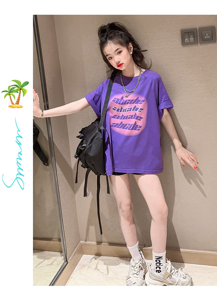 여자 티셔츠 반소매 여름 2024 새로운 어린이 트렌디 루즈 탑 걸스 여름 반소매 롱 티셔츠스토어 가기