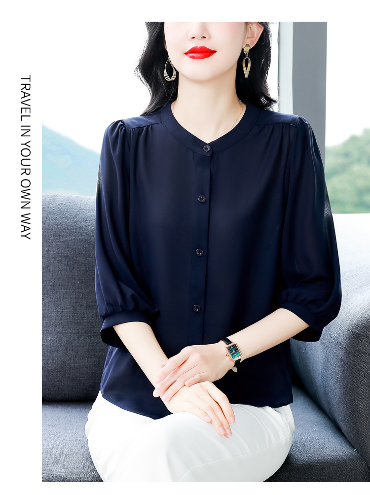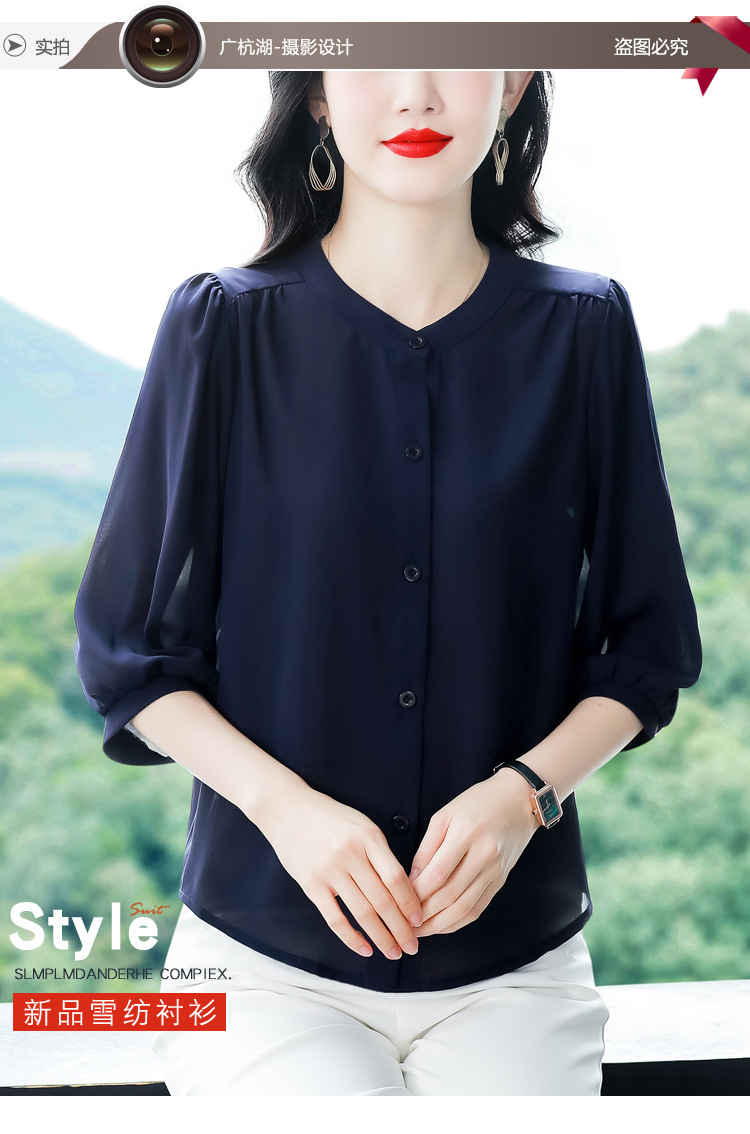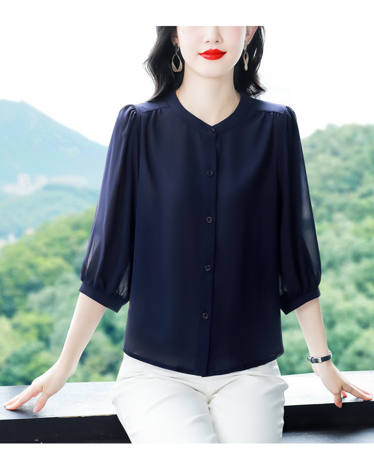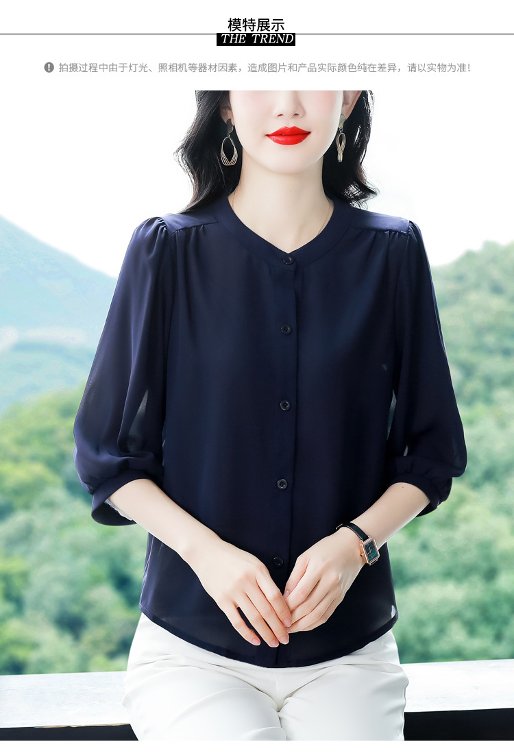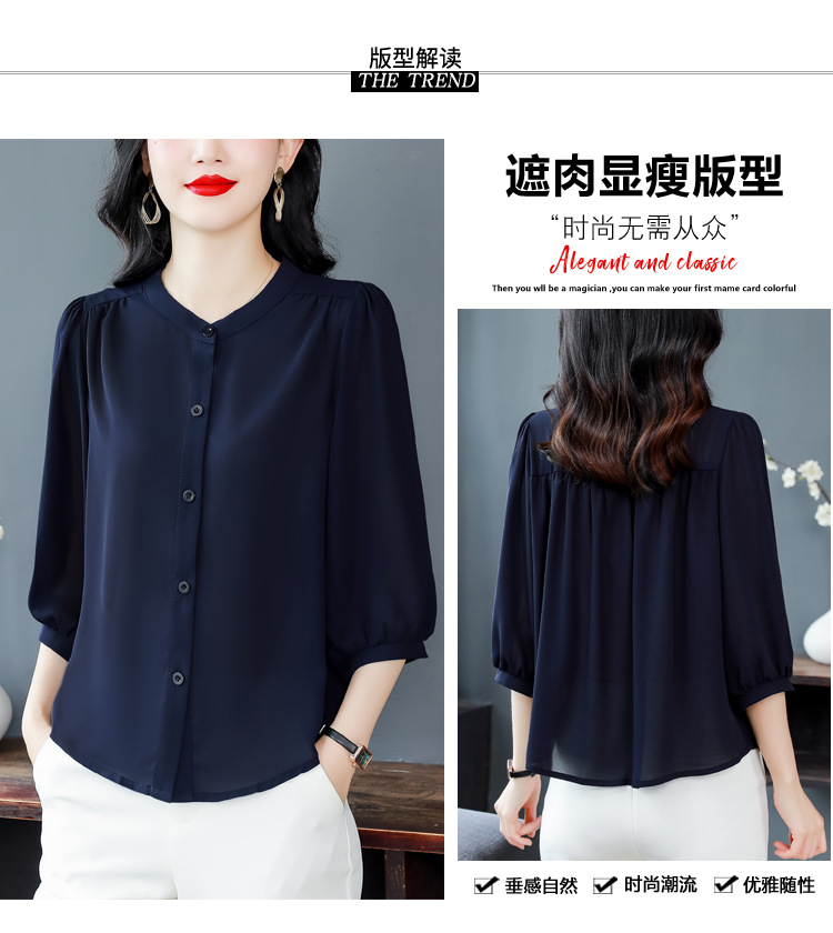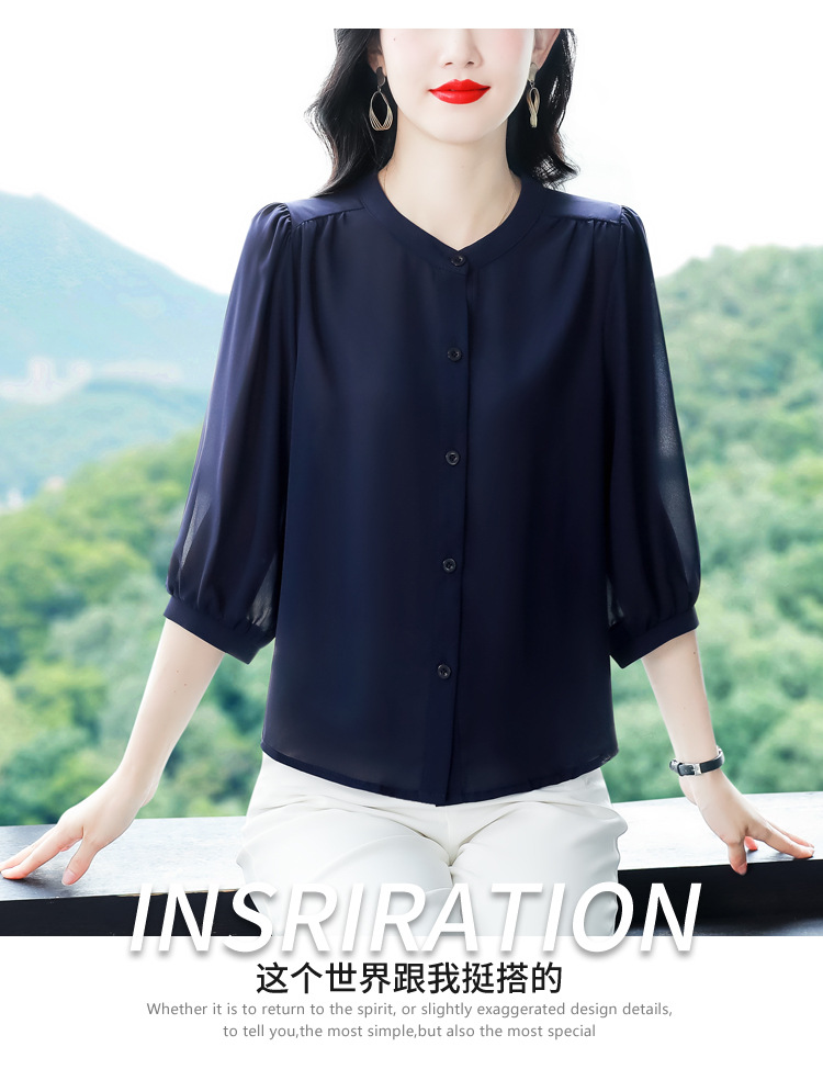 2024 새로운 여름 스타일 여성용 중간 소매 탑, 7부 소매 느슨한 배를 덮는 쉬폰 셔츠, 기질 및 연령 감소 셔츠