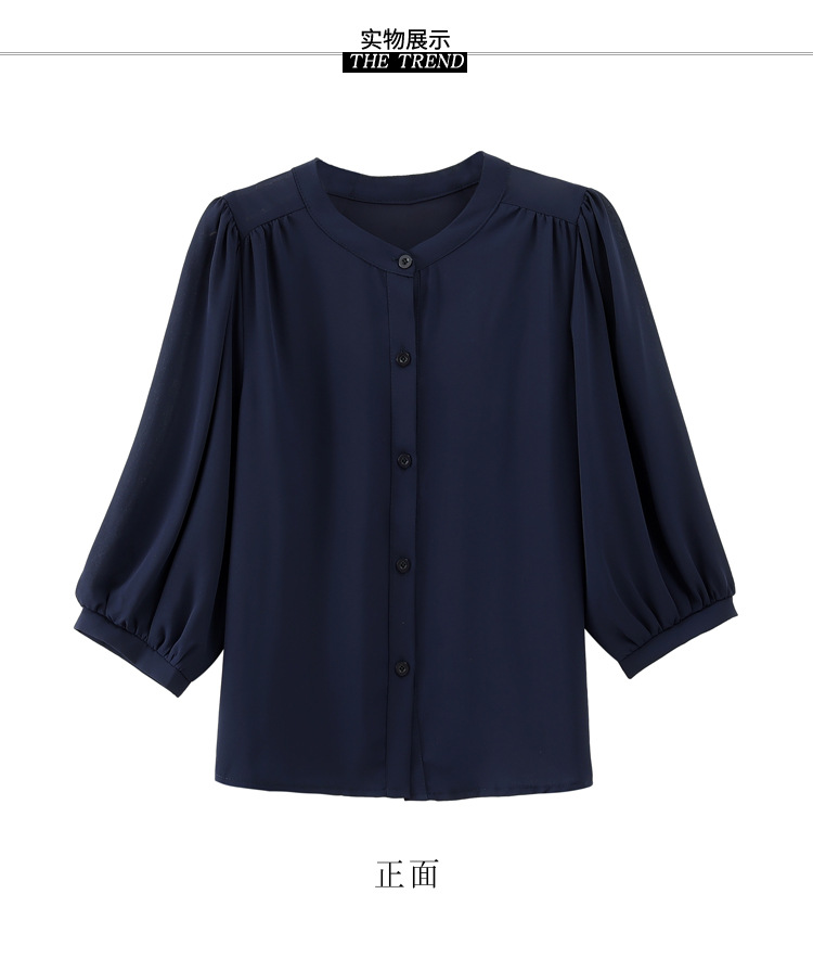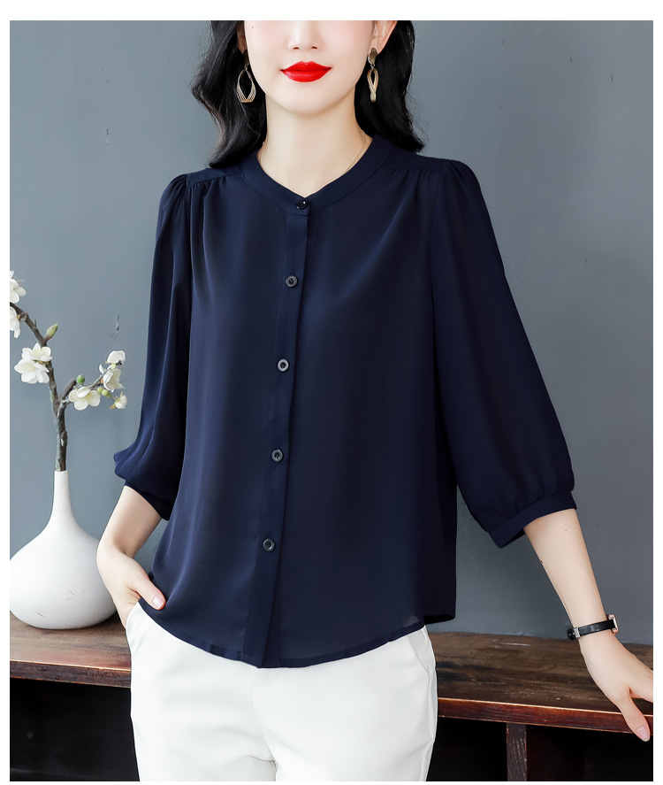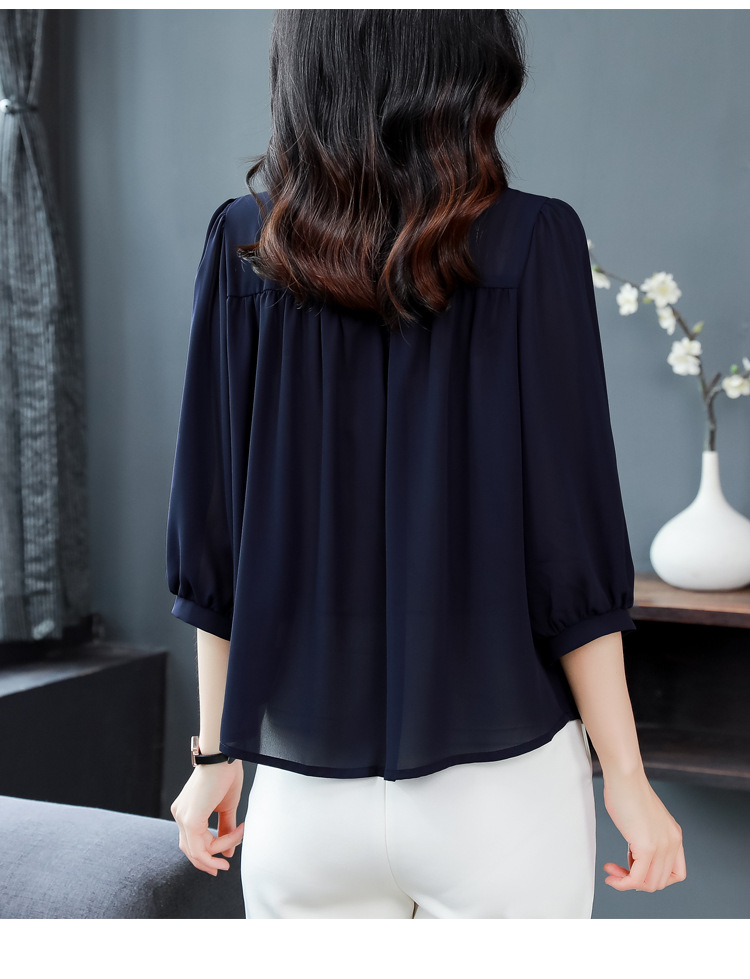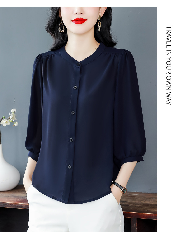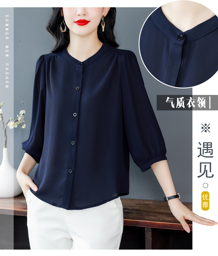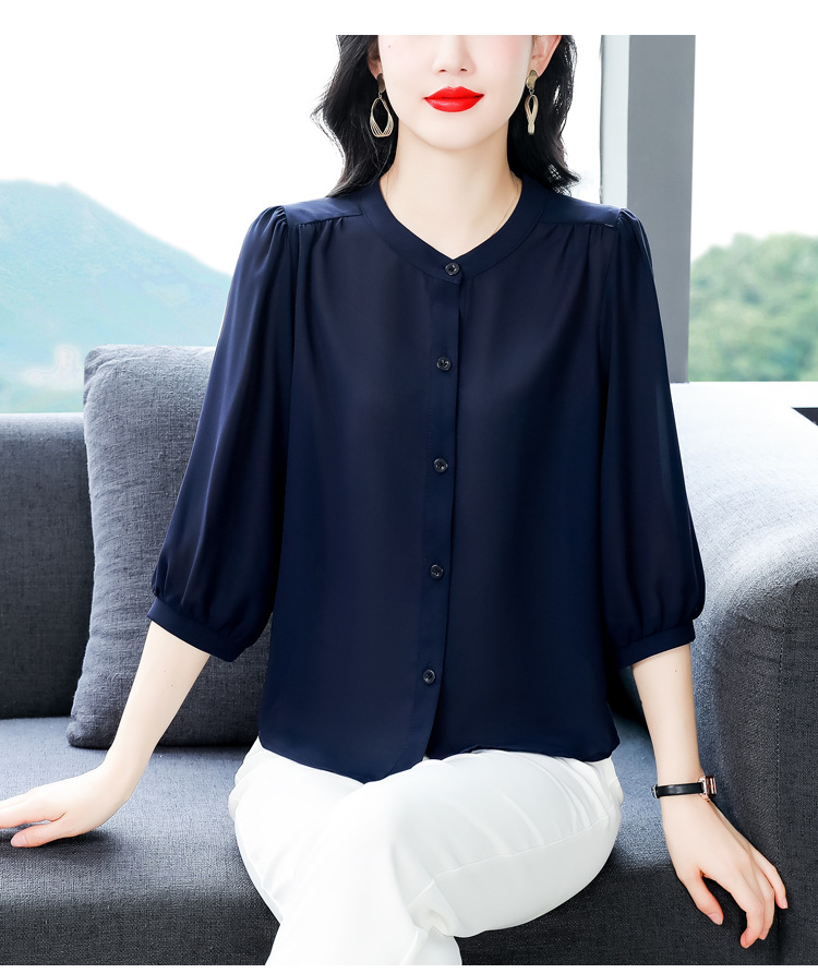 2024 새로운 여름 스타일 여성용 중간 소매 탑, 7부 소매 느슨한 배를 덮는 쉬폰 셔츠, 기질 및 연령 감소 셔츠