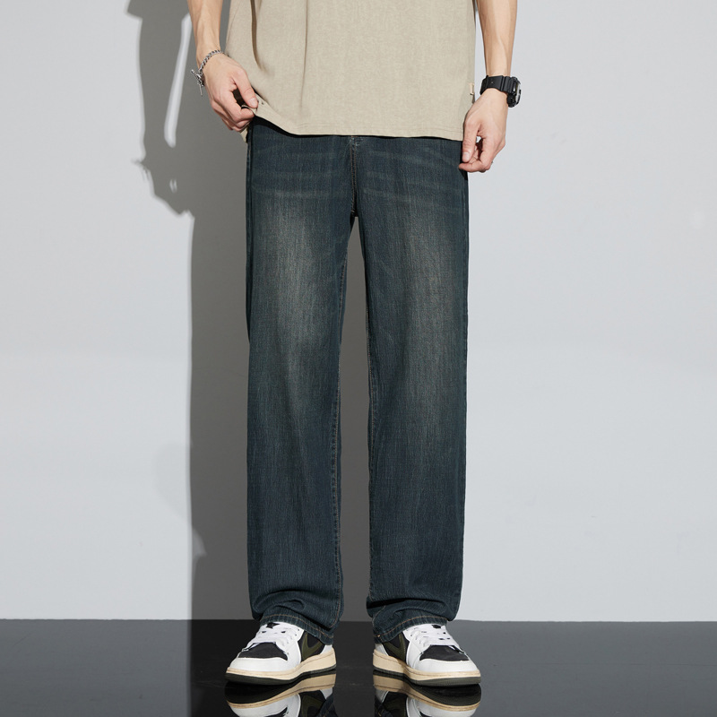 바지 남성 여름 아메리칸 스타일 레트로 남성 의류 텐셀 스트레치 남성 바지 얇은 걸레 바지 스트레이트 남성용 청바지