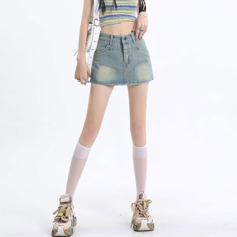 밝은 색 반 길이 데님 스커트 여성 패션 인 스타일 스파이스 소녀 틈새 안티 눈부심 A 라인 스커트 바지 높은 허리 힙 랩 스커트스토어 가기