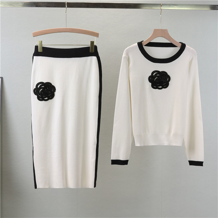 가을 겨울 신상 동백꽃 니트 세트 여성 패션 라운드넥 상의 배색 힙 스커트 투피스 세트