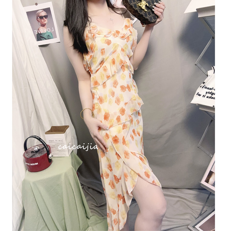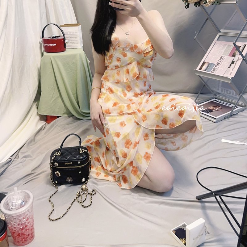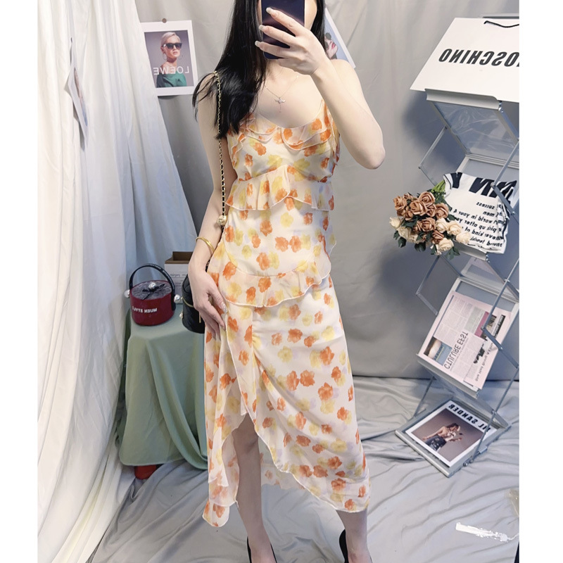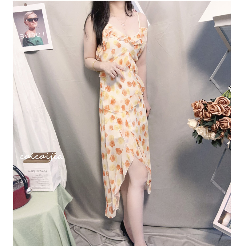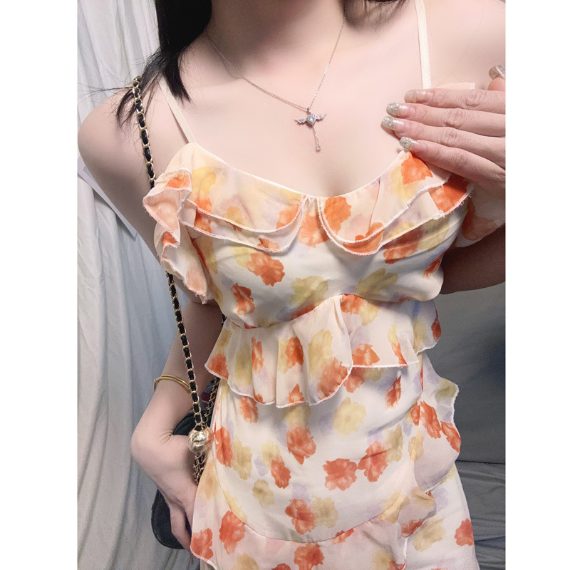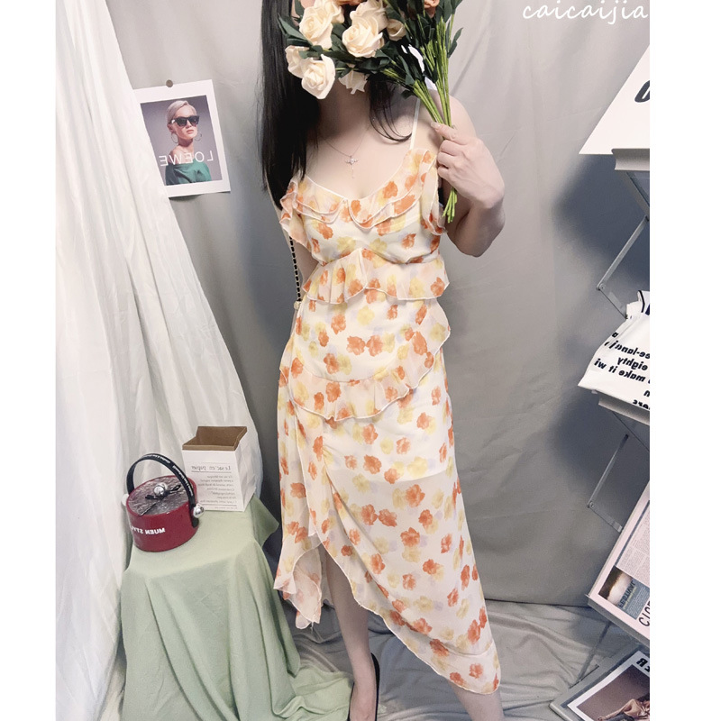 꽃 원피스 요정 우아한 중간 길이의 틈새 디자인 센스 러플 비대칭 컬러 슬링 원피스스토어 가기
