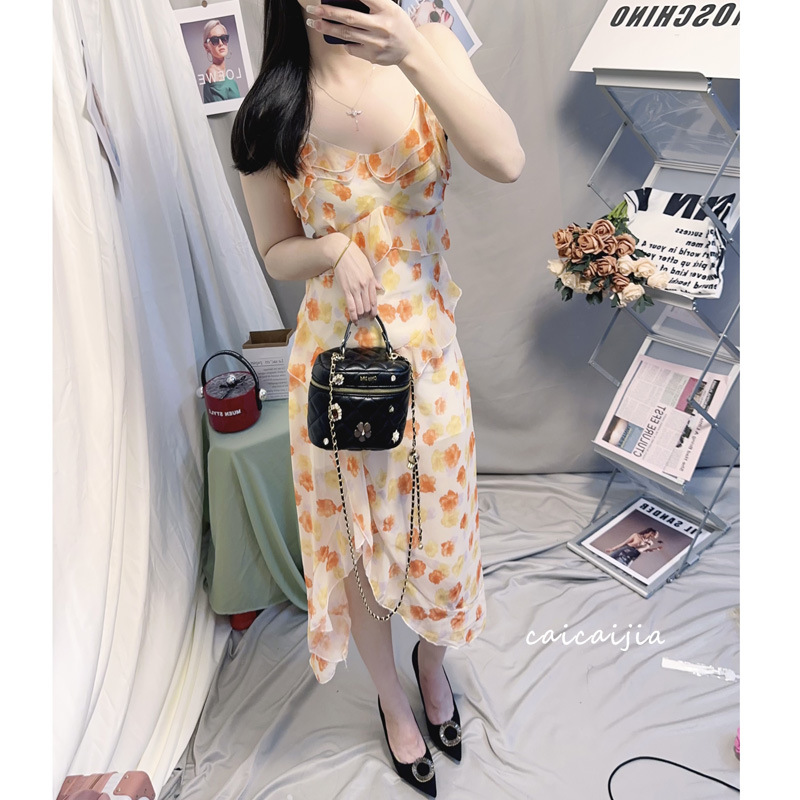 꽃 원피스 요정 우아한 중간 길이의 틈새 디자인 센스 러플 비대칭 컬러 슬링 원피스