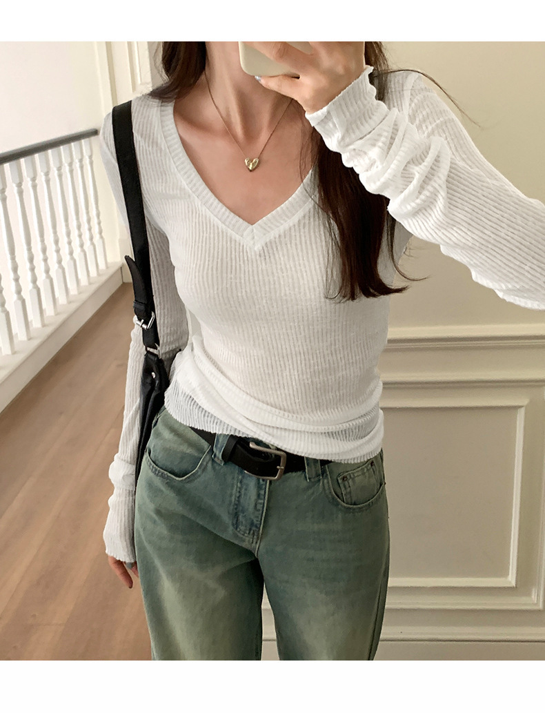 봄과 여름 새로운 미국 V 넥 얇은 슬림 핏 슬리밍 긴 소매 여성의 순수한 욕망 스타일 디자인 센스 마이크로 투명 오버 셔츠스토어 가기