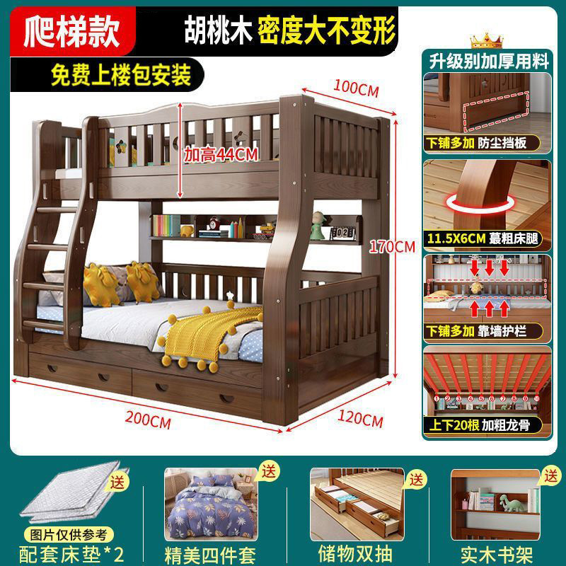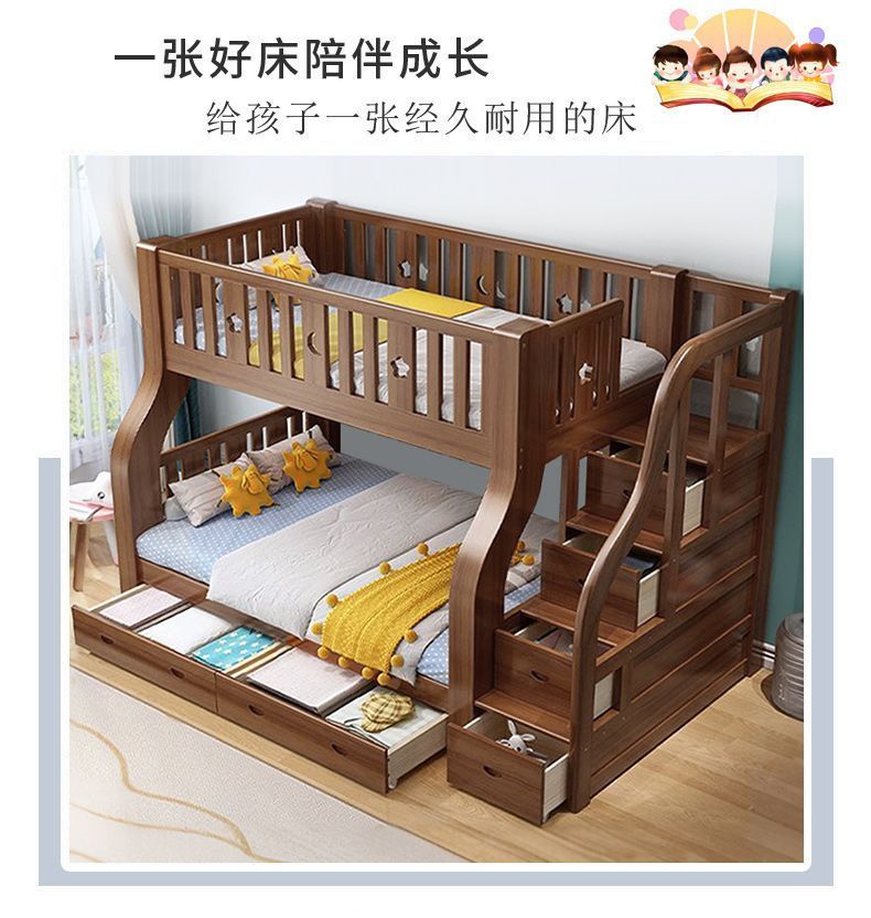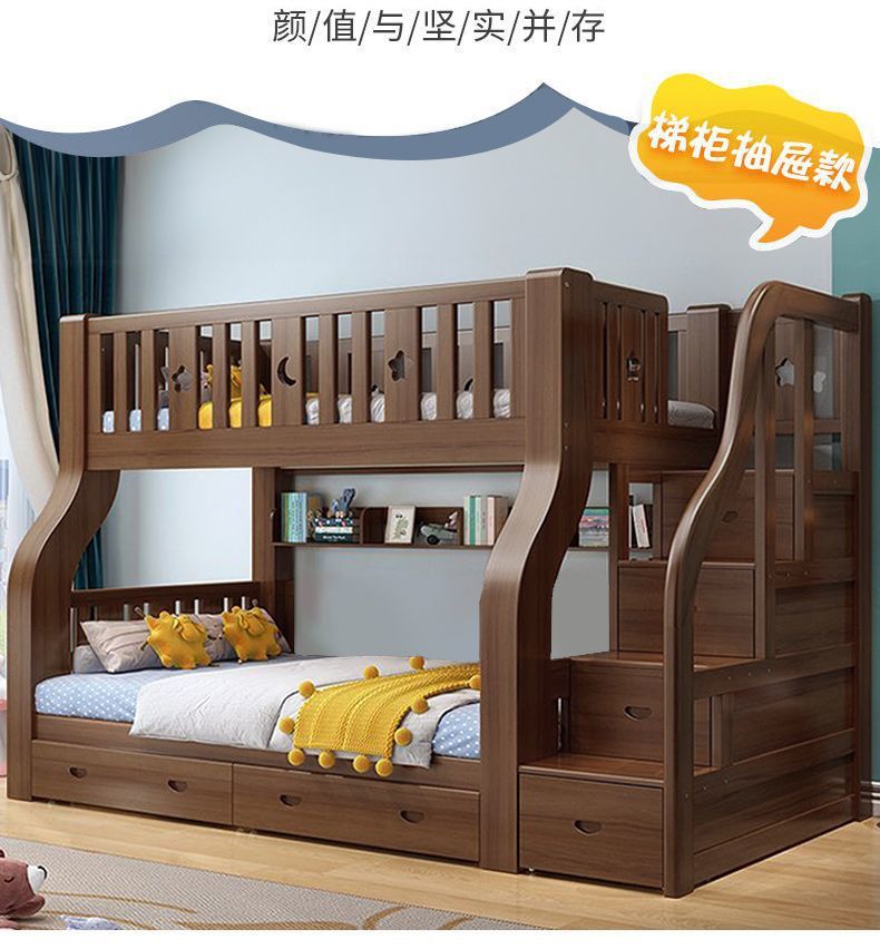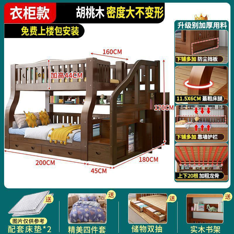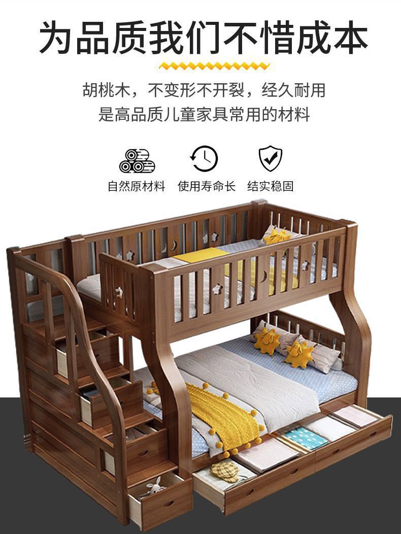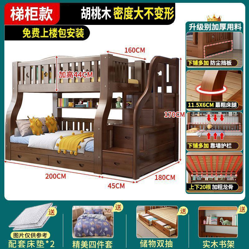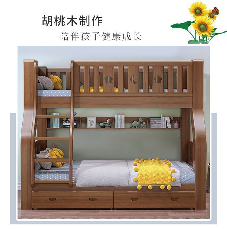 호두 모든 단단한 나무 어린이 침대 아이들의 높고 낮은 침대 벙크 침대 2 층 저장 다기능 상부 및 하부 벙크 나무 침대