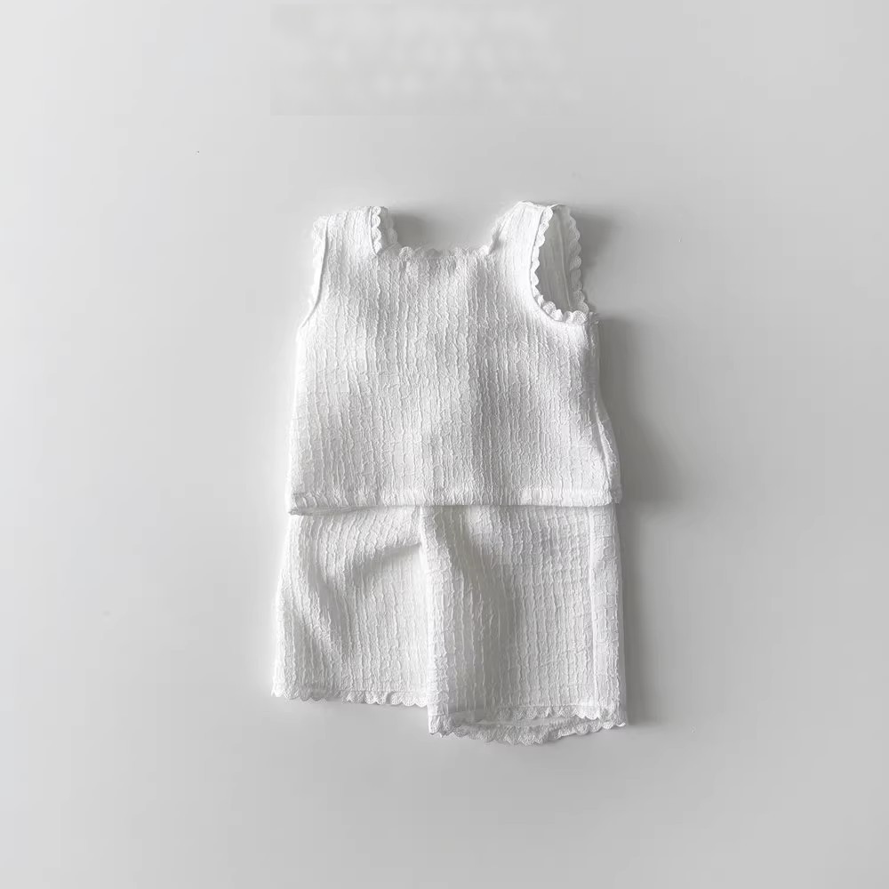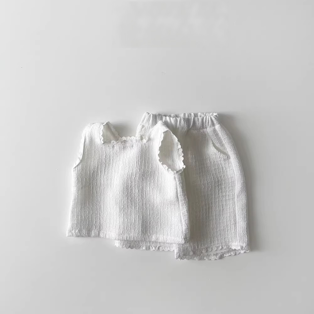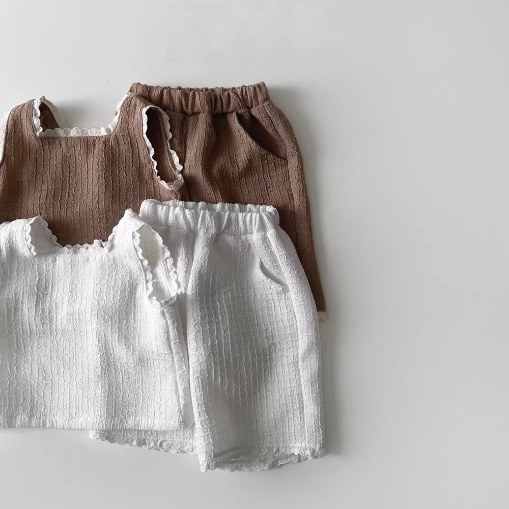 Ins 한국 스타일 소녀 아기 소프트 레이스 카디건 조끼 캐주얼 바지 세트 느슨한 외출 의류