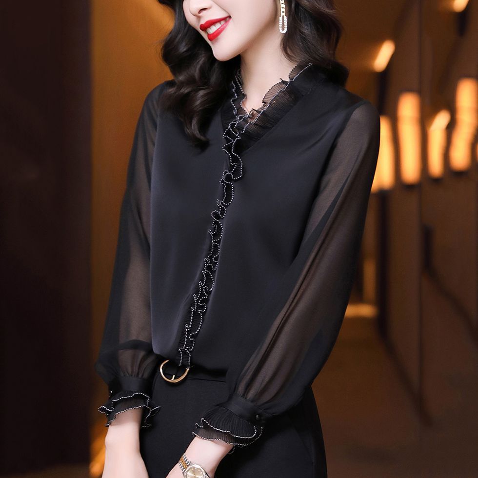 2024 봄과 가을 새로운 프랑스 스타일 셔츠 짧은 쉬폰 탑 여성용 긴팔 세련된 아름다운 서양식 러플 셔츠