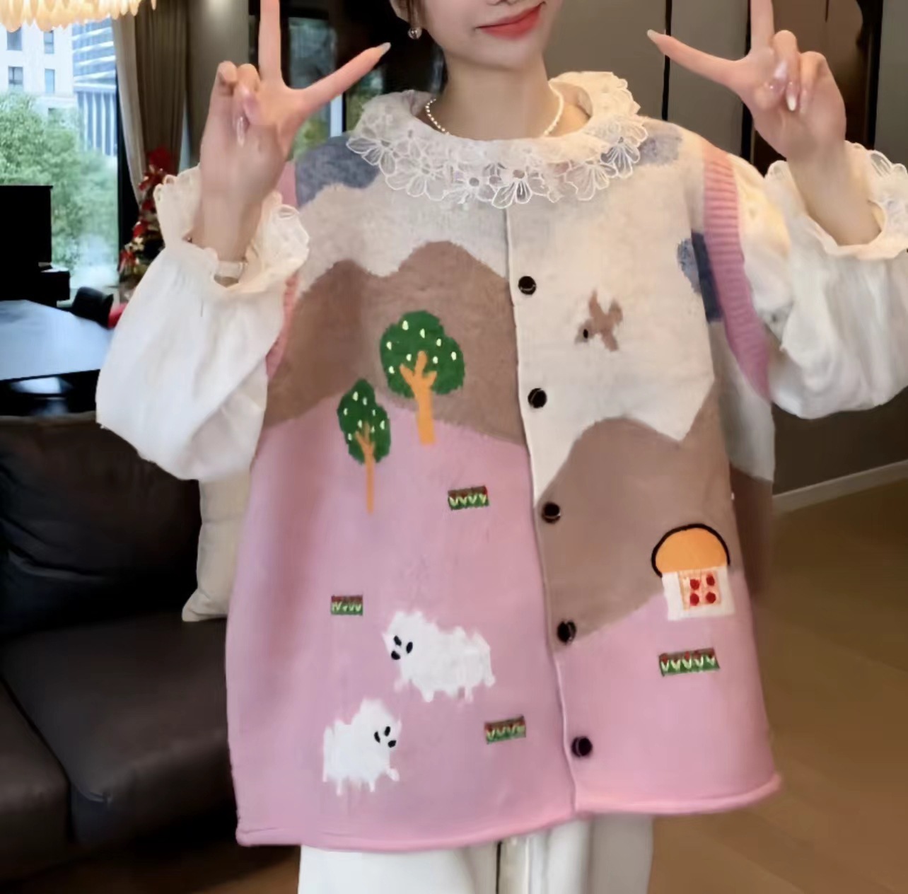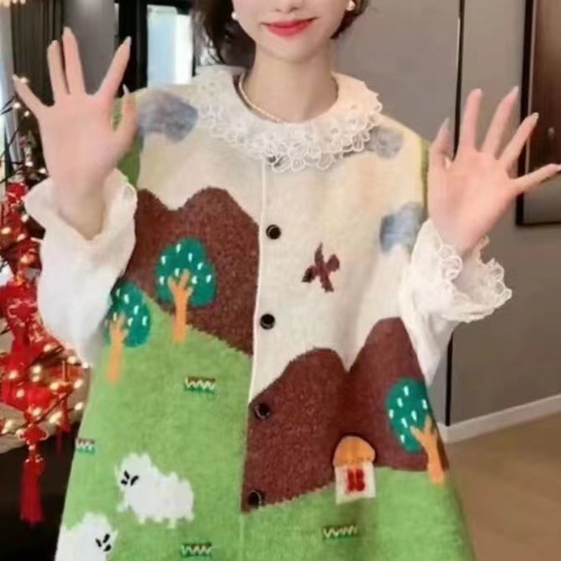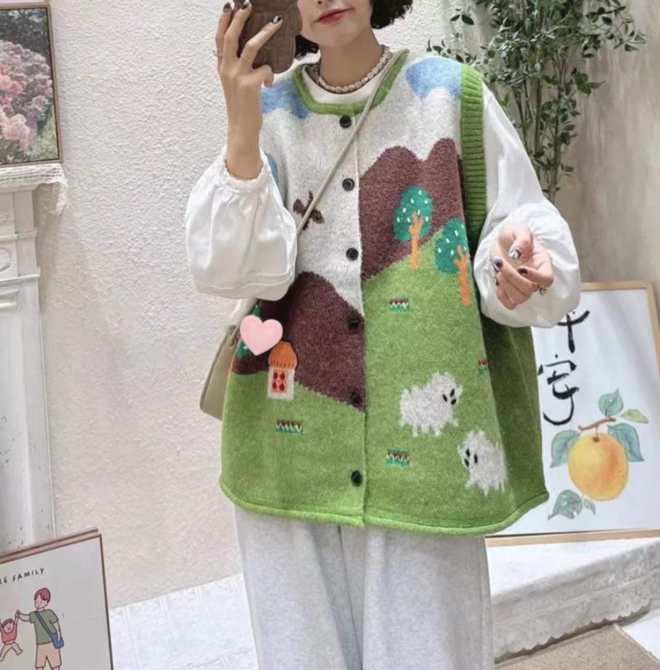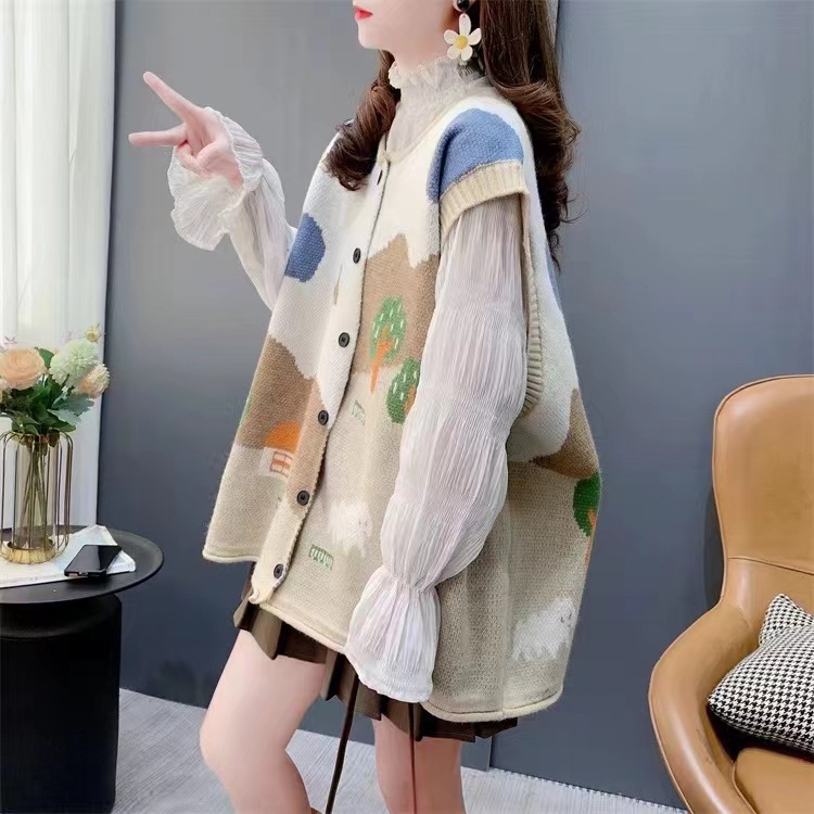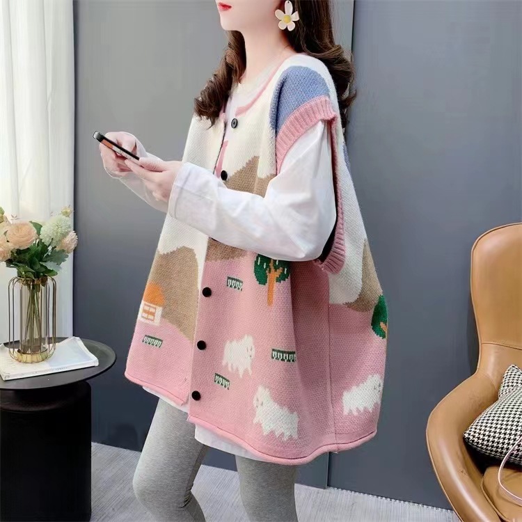 한국식 어린이 자카드 니트 조끼 카디건 여성 봄 · 가을 새 느슨한 플러스 사이즈 소프트 왁스 쌓인 스웨터 조끼스토어 가기