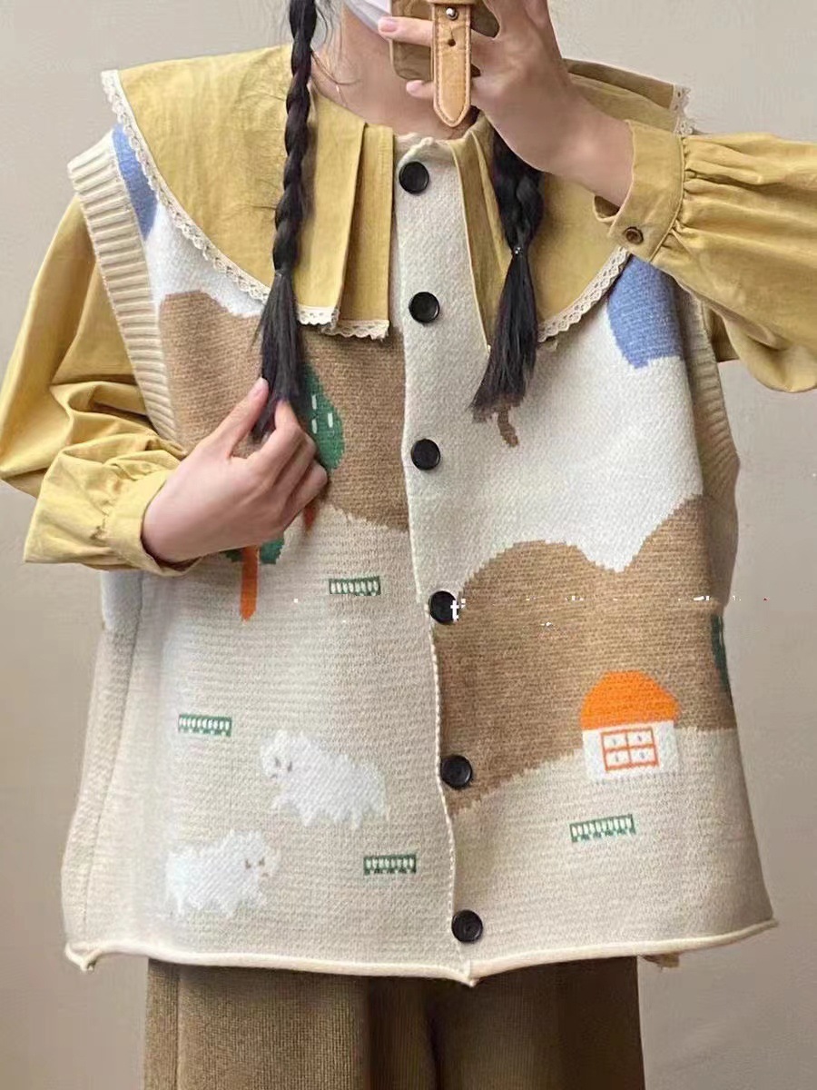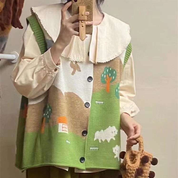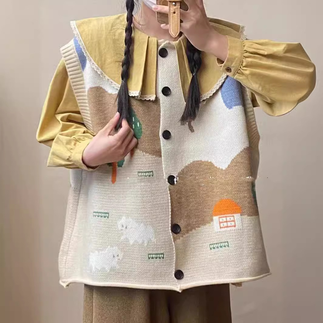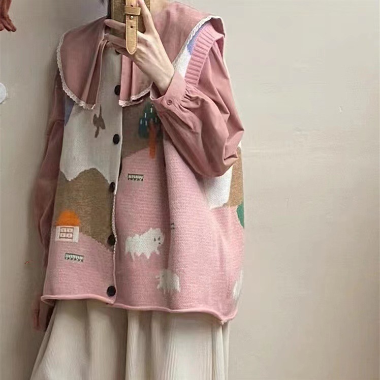한국식 어린이 자카드 니트 조끼 카디건 여성 봄 · 가을 새 느슨한 플러스 사이즈 소프트 왁스 쌓인 스웨터 조끼
