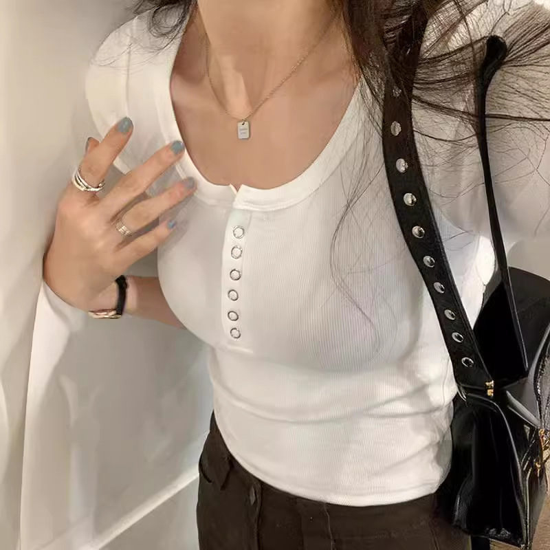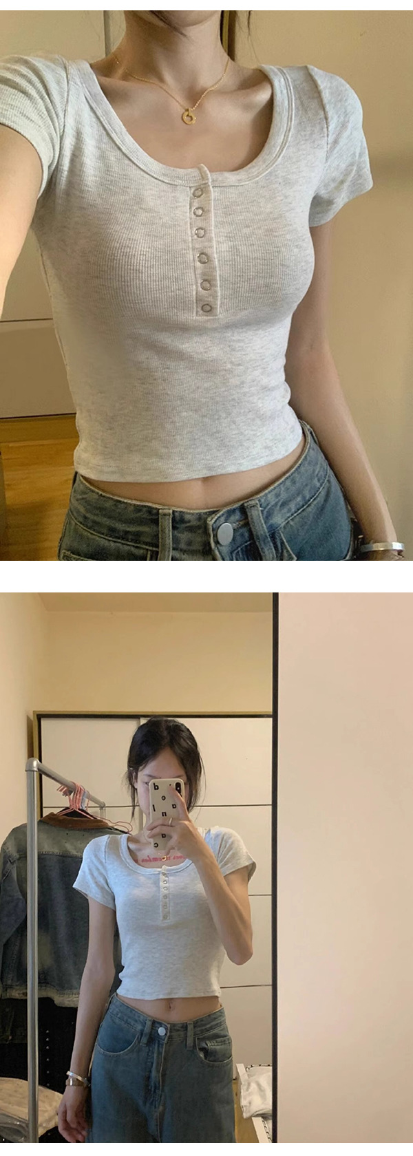 TikTok Daifa 여름 어깨 쌀 회색 버클 크루 넥 디자인 느낌 배꼽 최고 반팔 티셔츠 여성베이스 셔츠스토어 가기