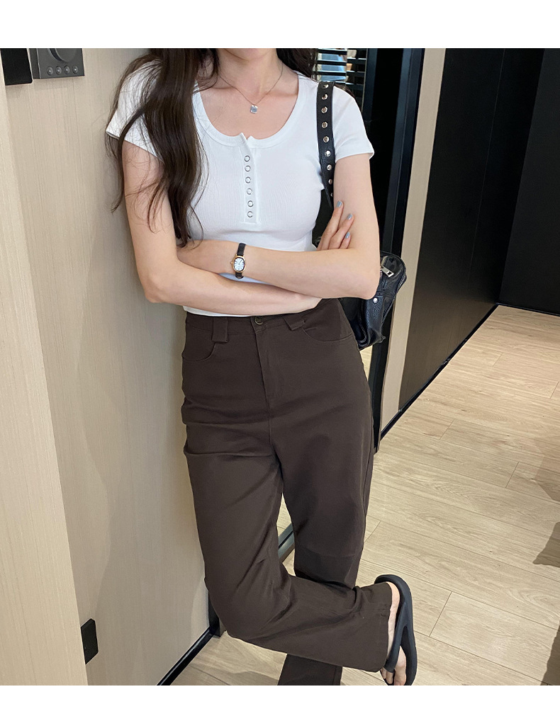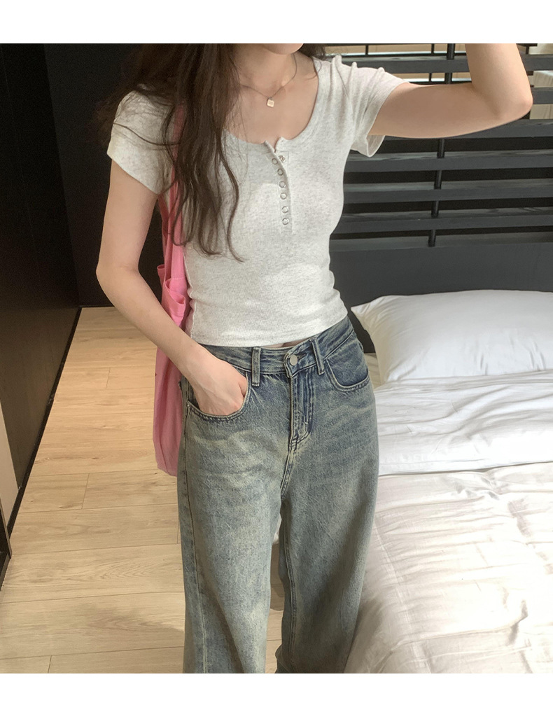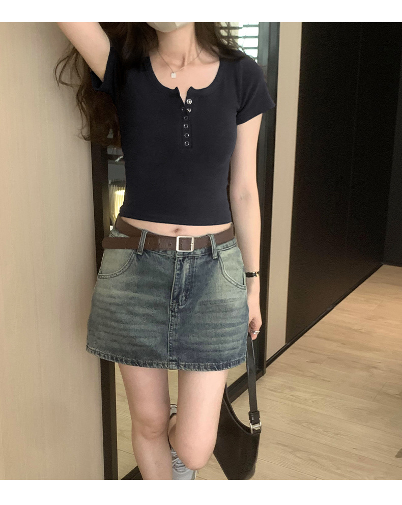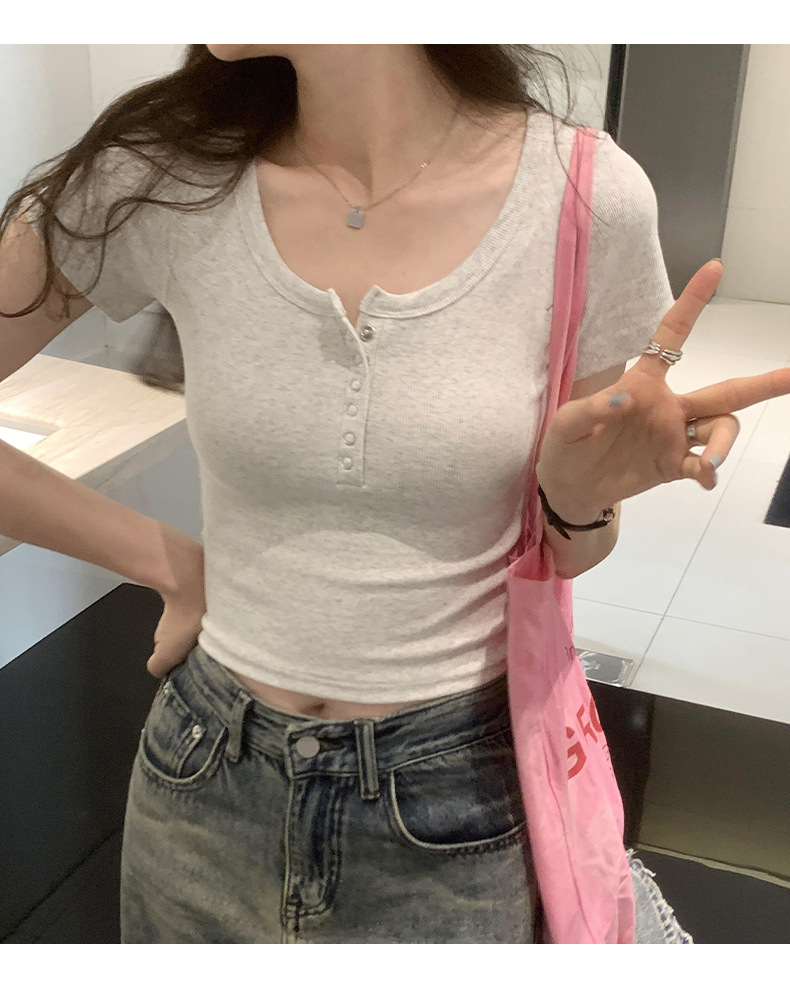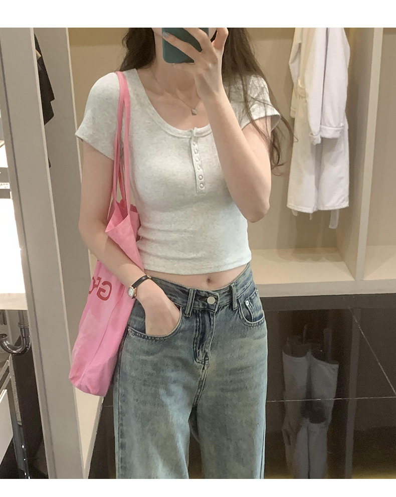 여름 버튼 크루 넥 반팔 티셔츠 여성용 어깨 슬림 디자인 짧은 바닥 재킷 흔들어스토어 가기
