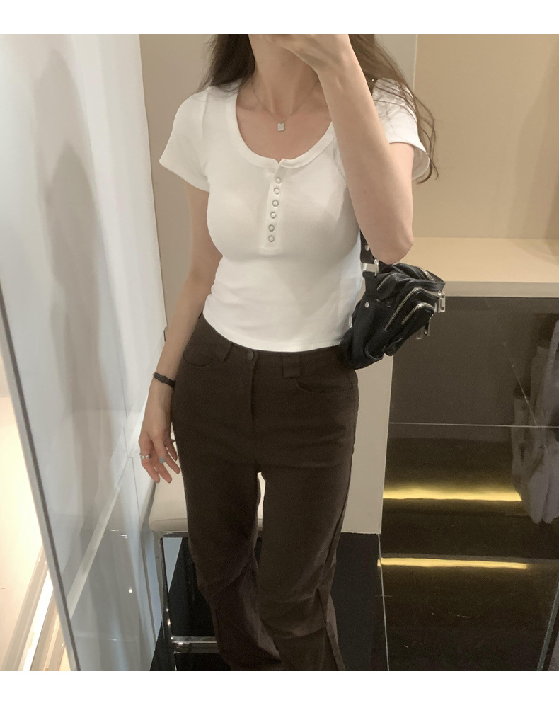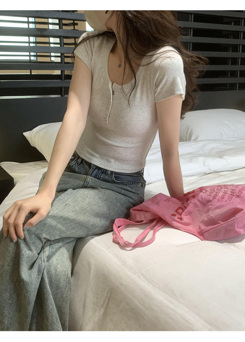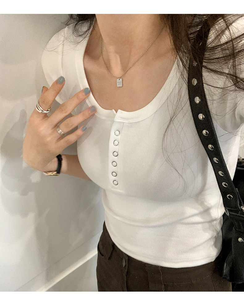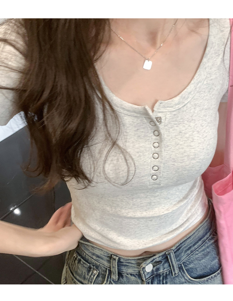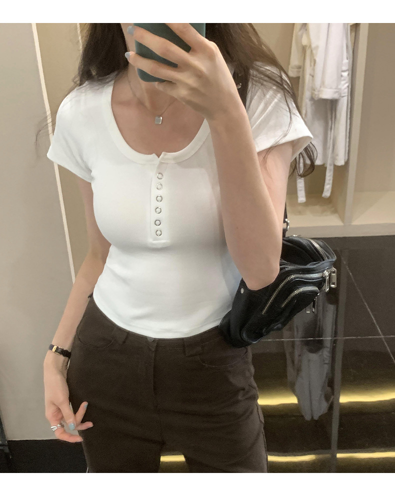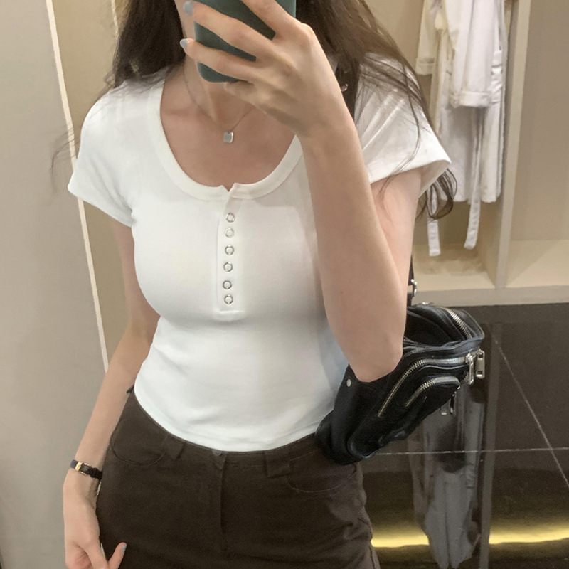 여름 버튼 크루 넥 반팔 티셔츠 여성용 어깨 슬림 디자인 짧은 바닥 재킷 흔들어
