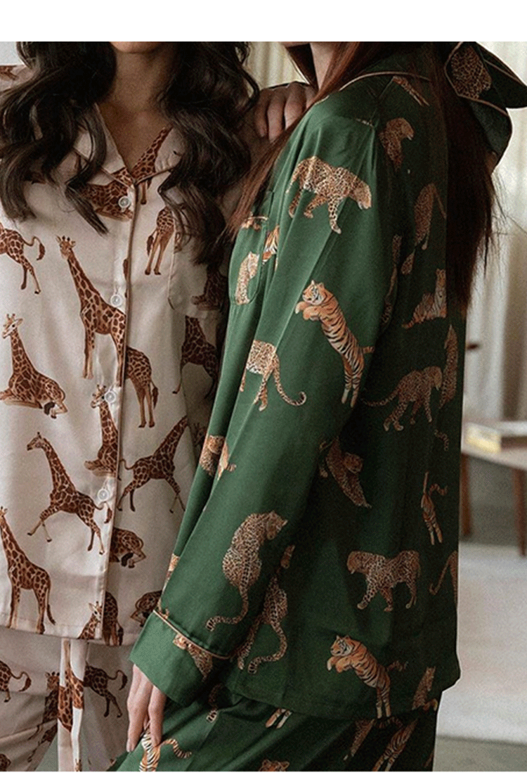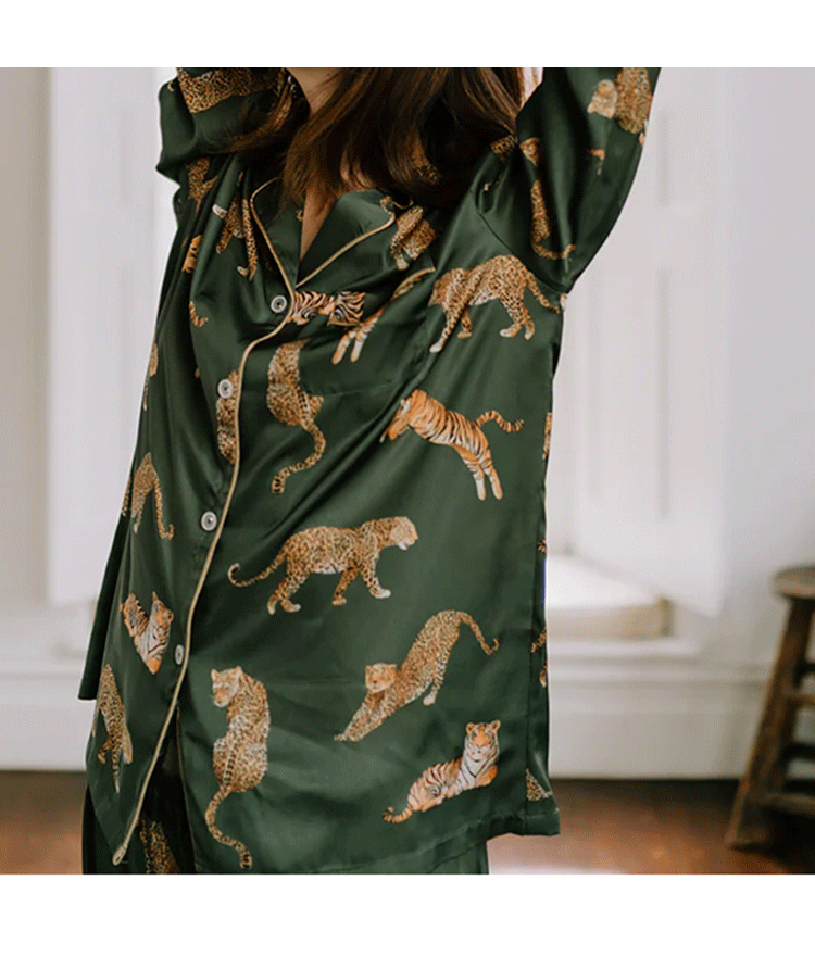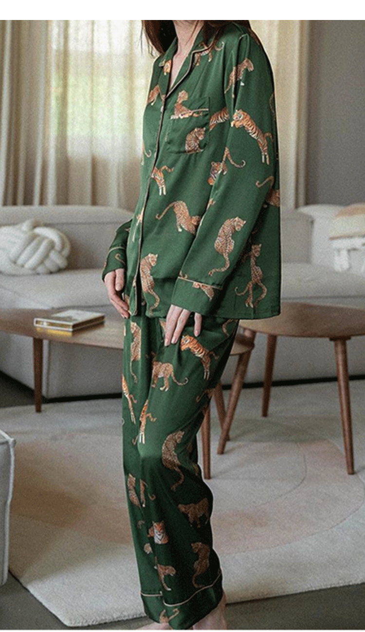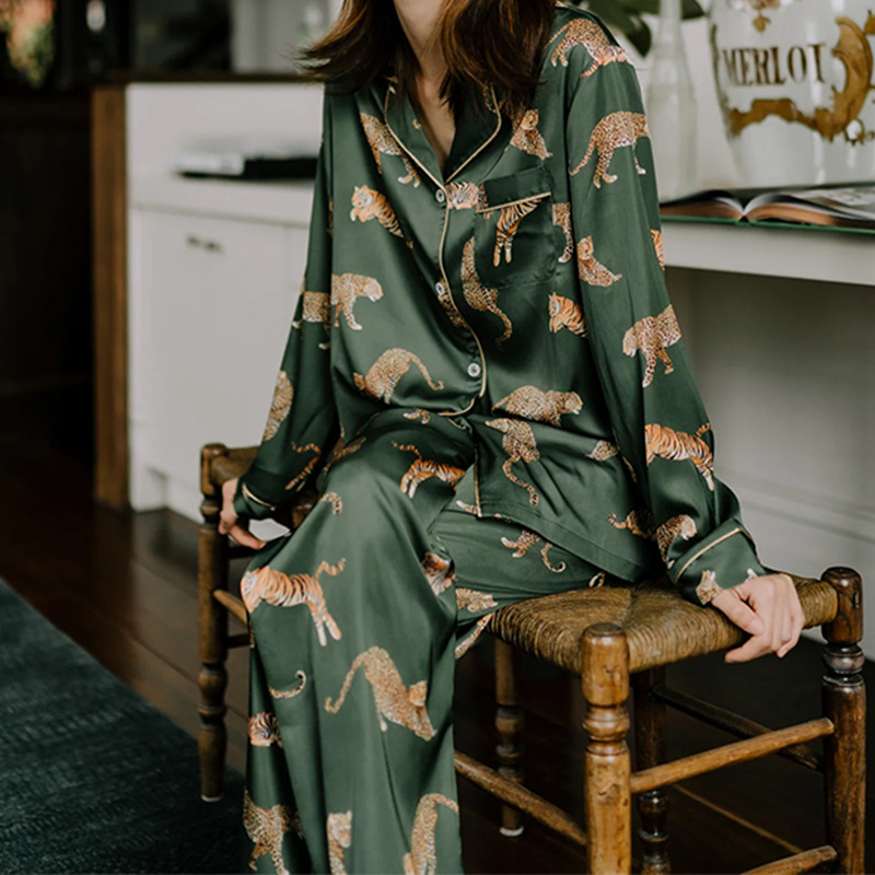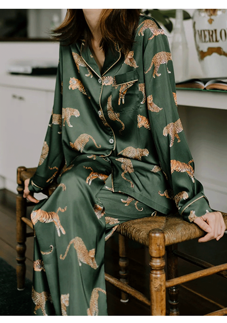 상하이 스토리 Mishiti 같은 스타일 유행 브랜드 대외 무역 틈새 숲 호랑이 패션 아이스 실크 긴 소매 바지 여성용 파자마