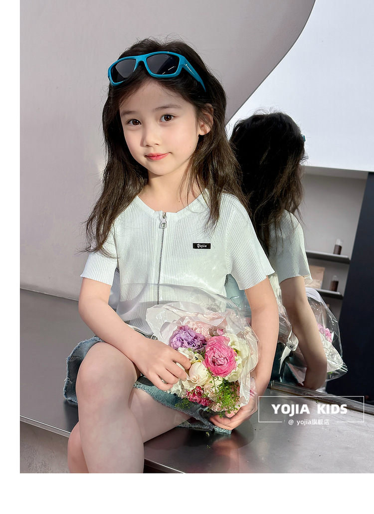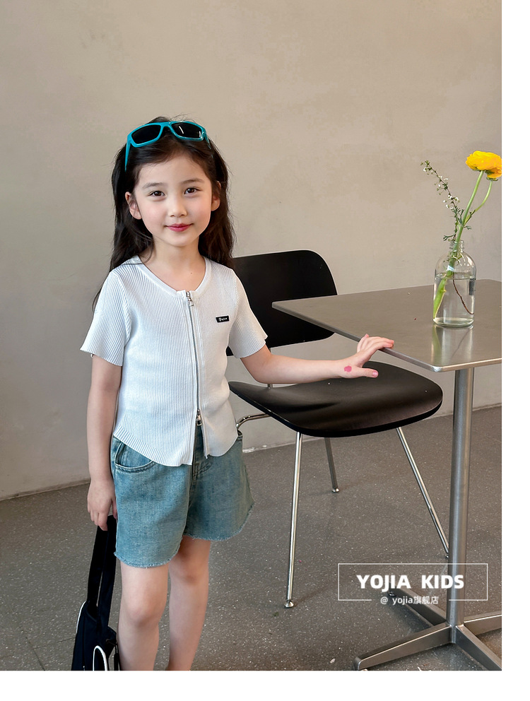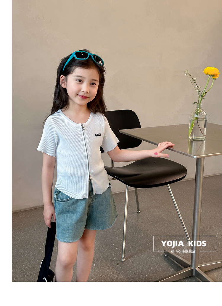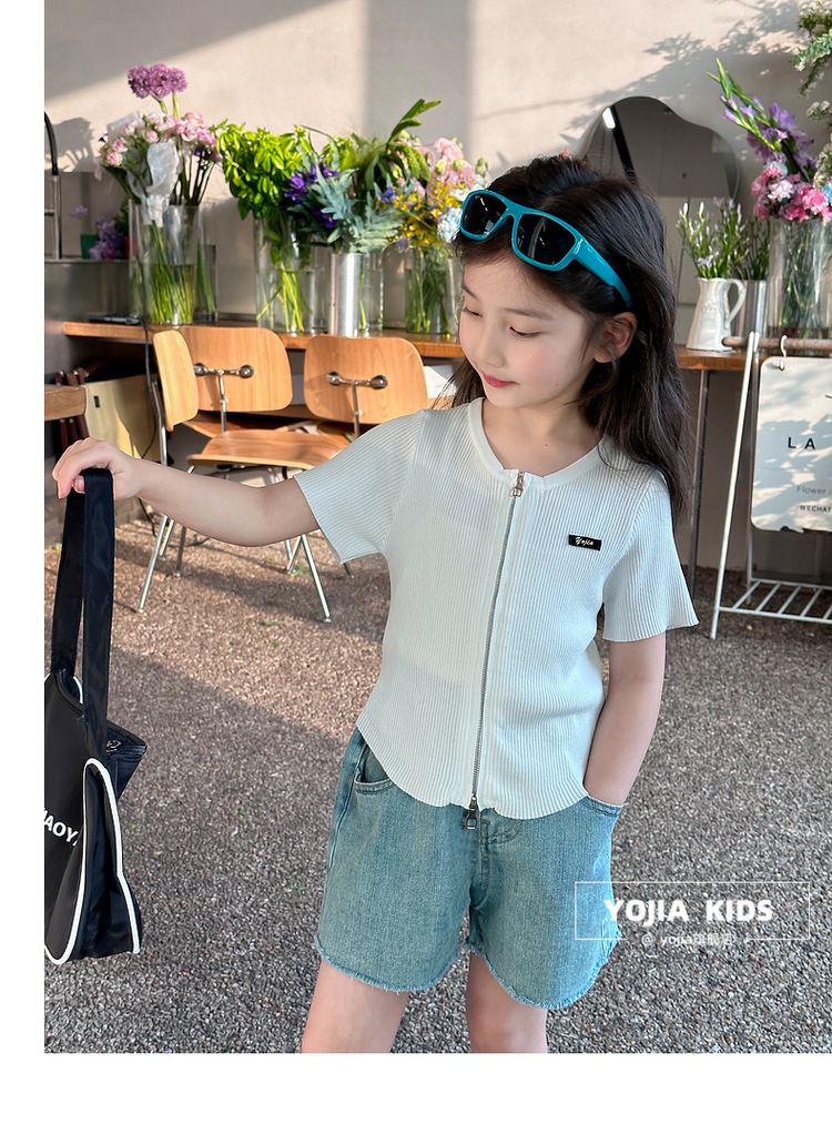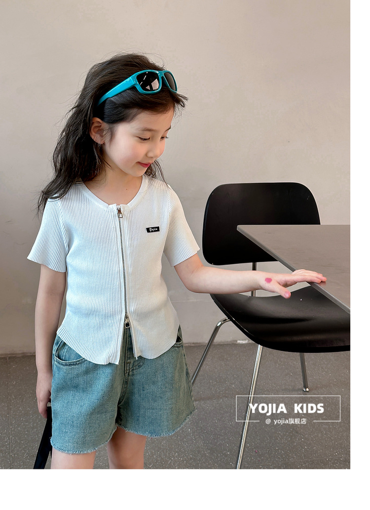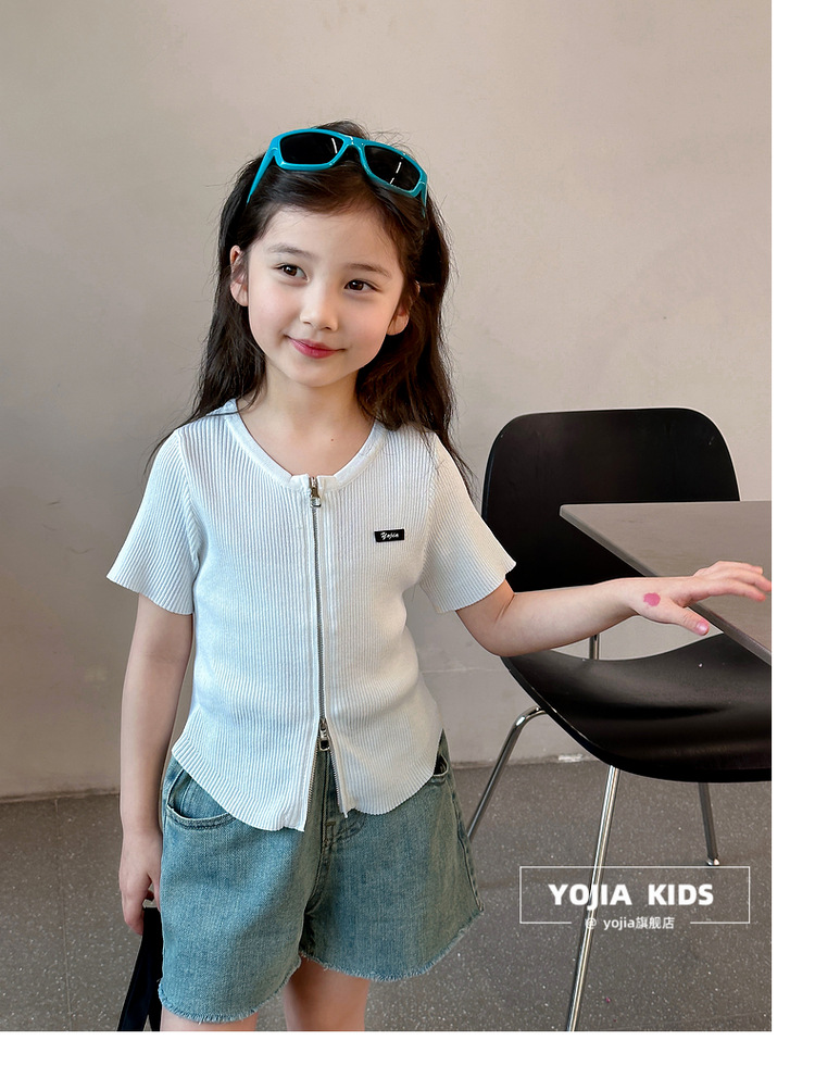 YOJIA 아동복 소녀 아이스 실크 반팔 여름 2024 새로운 한국 소녀 탑 어린이 니트 지퍼 티셔츠