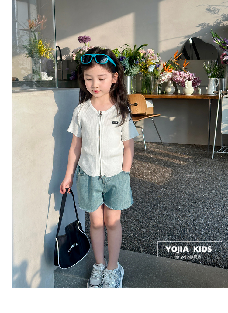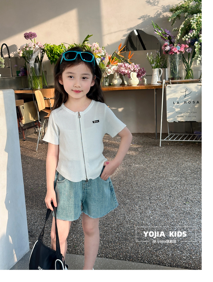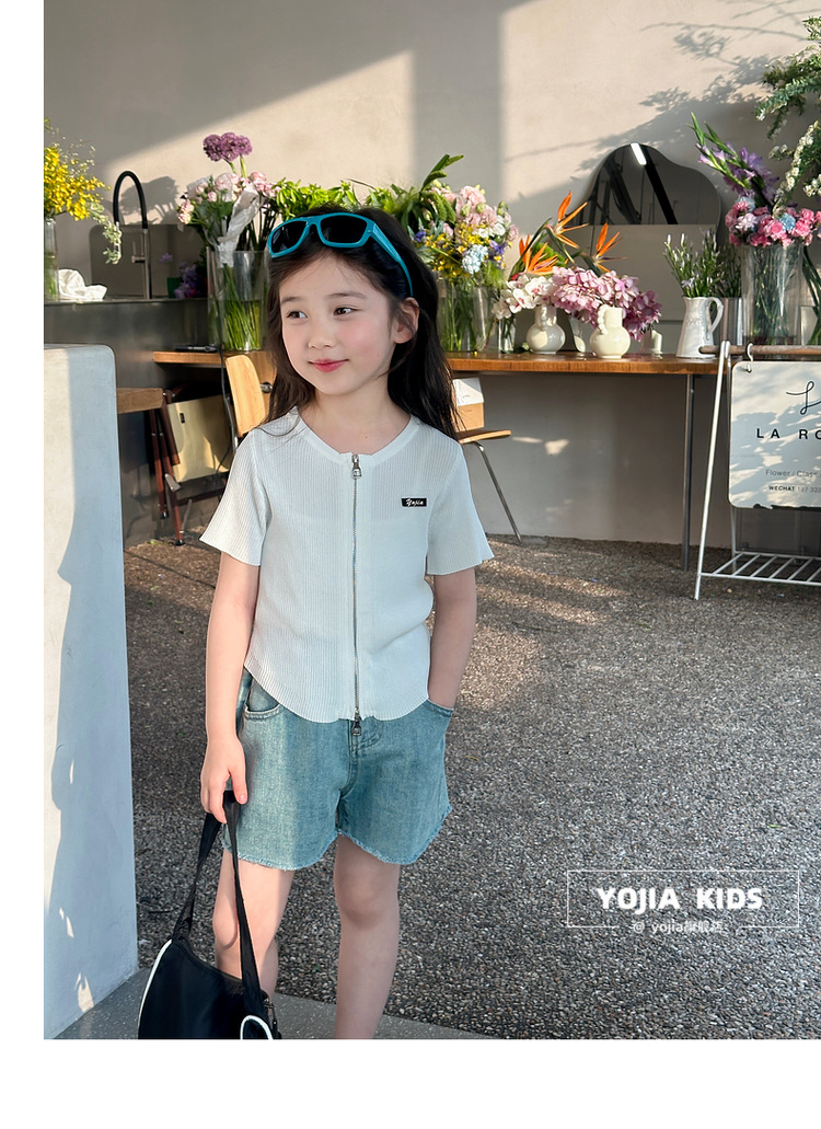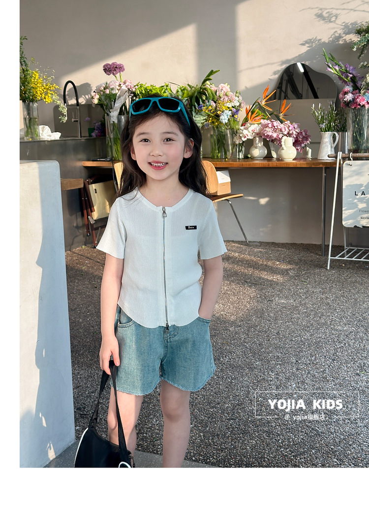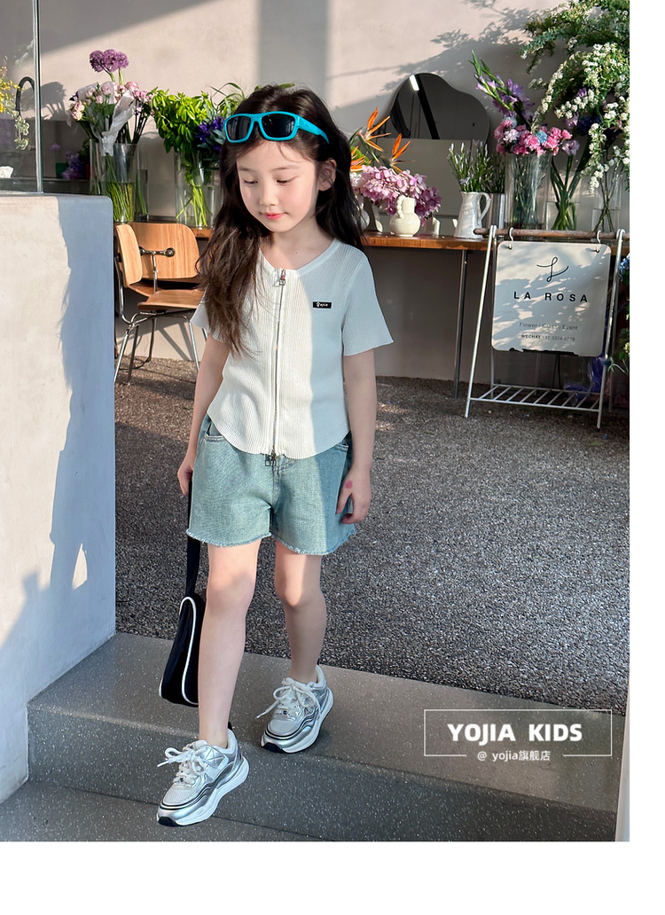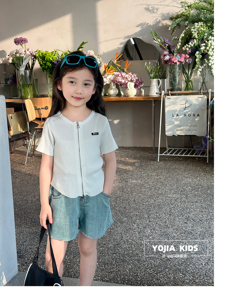 YOJIA 아동복 소녀 아이스 실크 반팔 여름 2024 새로운 한국 소녀 탑 어린이 니트 지퍼 티셔츠