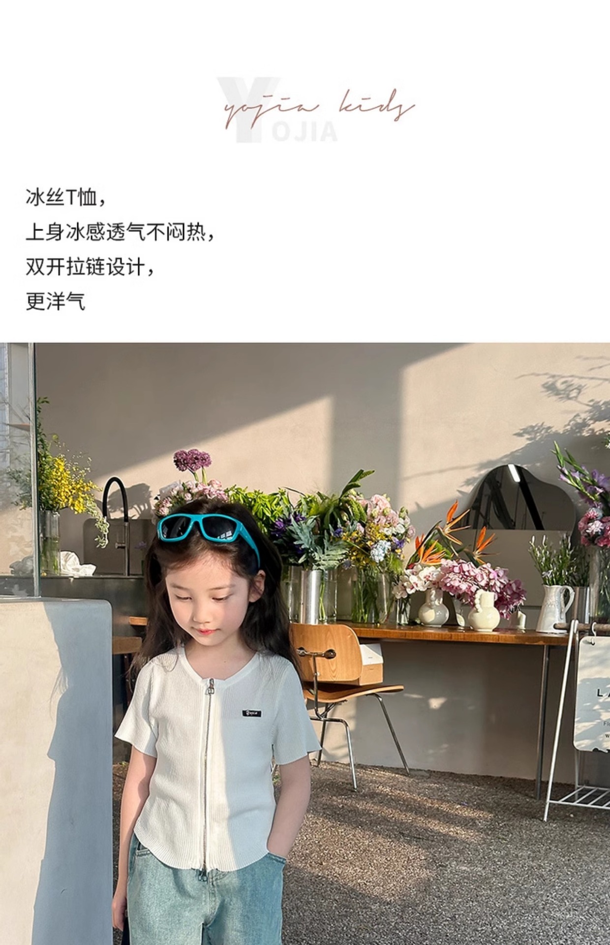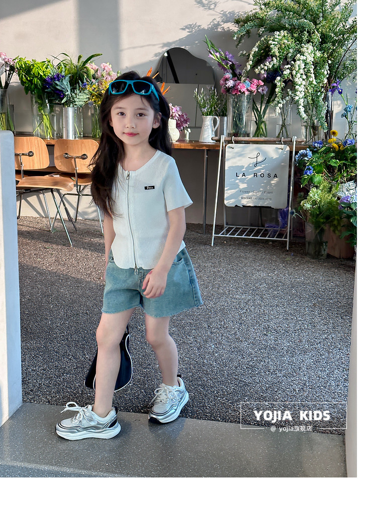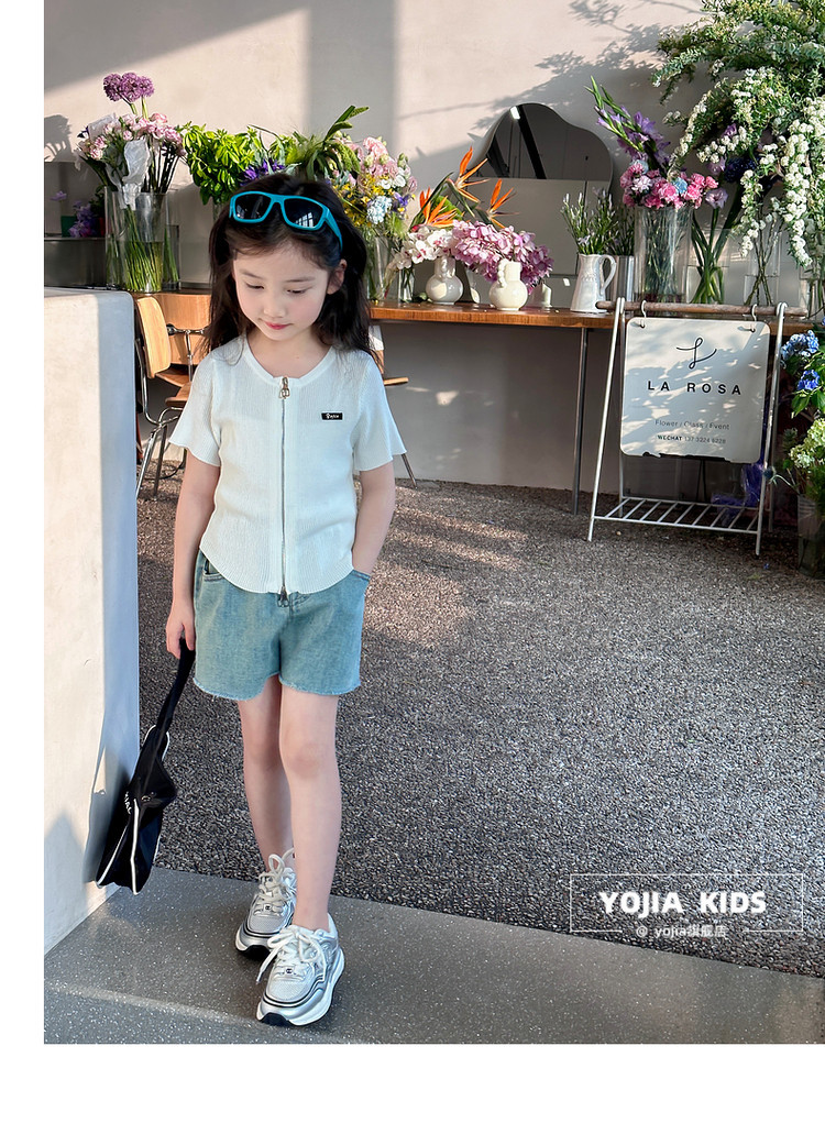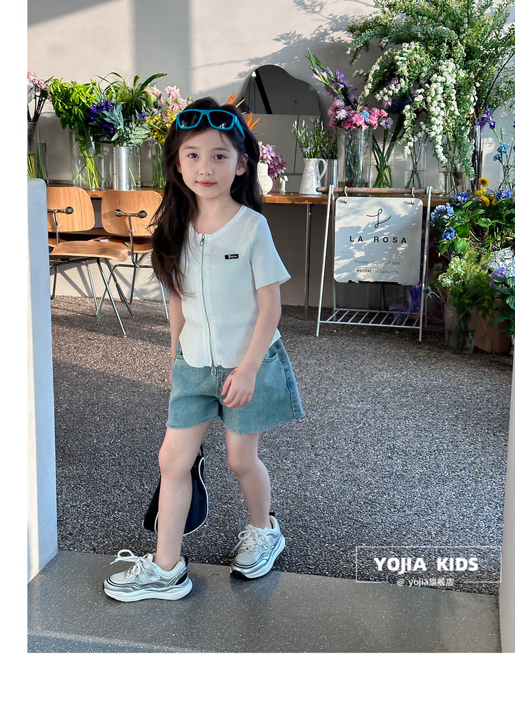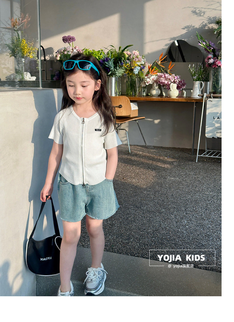 YOJIA 아동복 소녀 아이스 실크 반팔 여름 2024 새로운 한국 소녀 탑 어린이 니트 지퍼 티셔츠