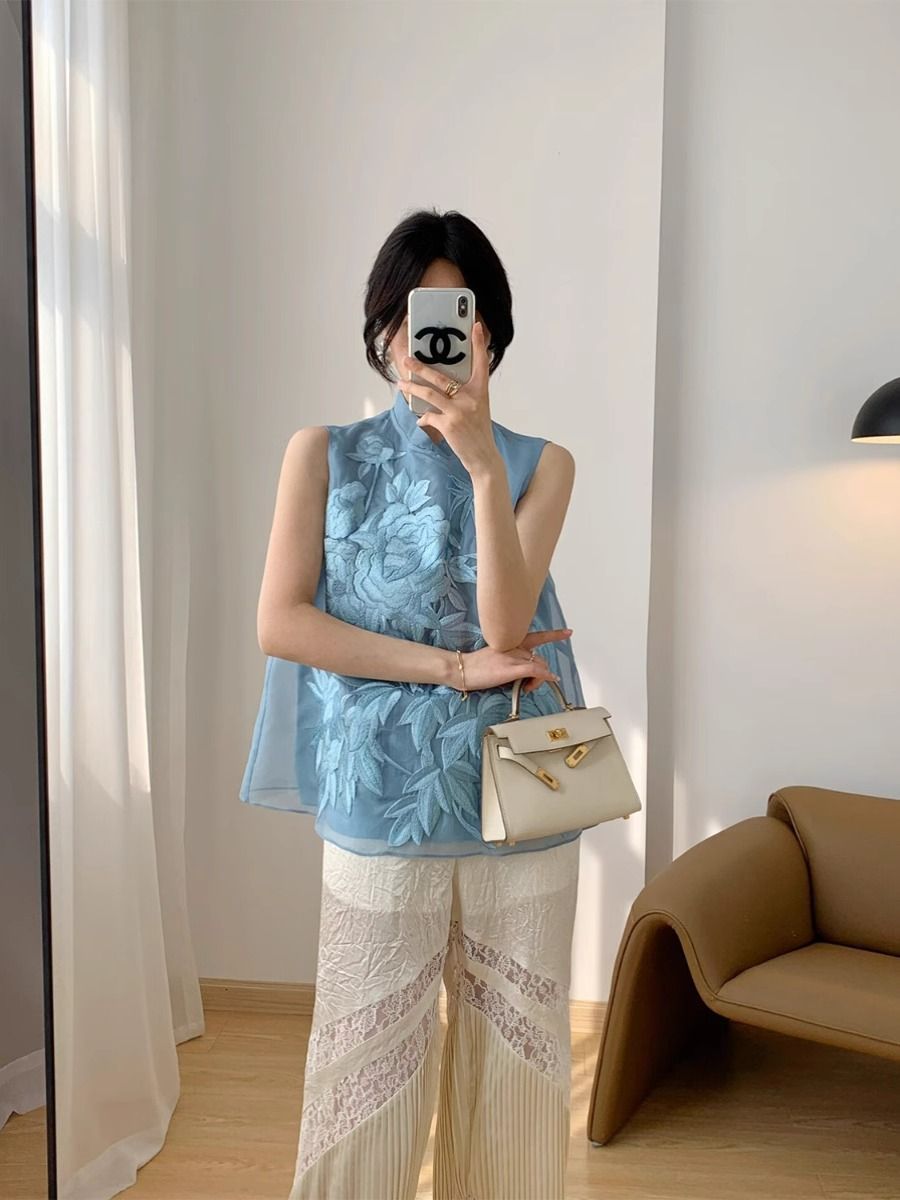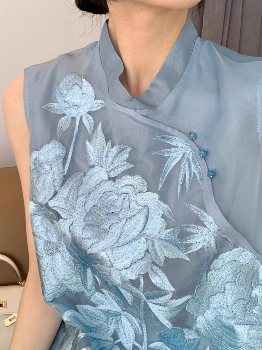 새로운 중국 스타일 중공업 자수 경사 칼라 쉬폰 블루 셔츠 여름 새로운 국가 스타일 세련된 민소매 셔츠