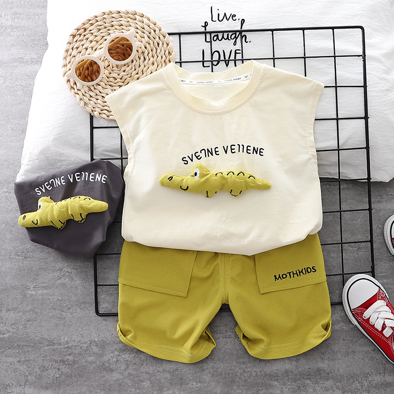 유행 잘 생긴 소년의 클래식 여름 얇은 투피스 아동복 소년의 새로운 3 차원 공룡 조끼 투피스 세트