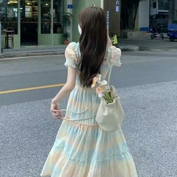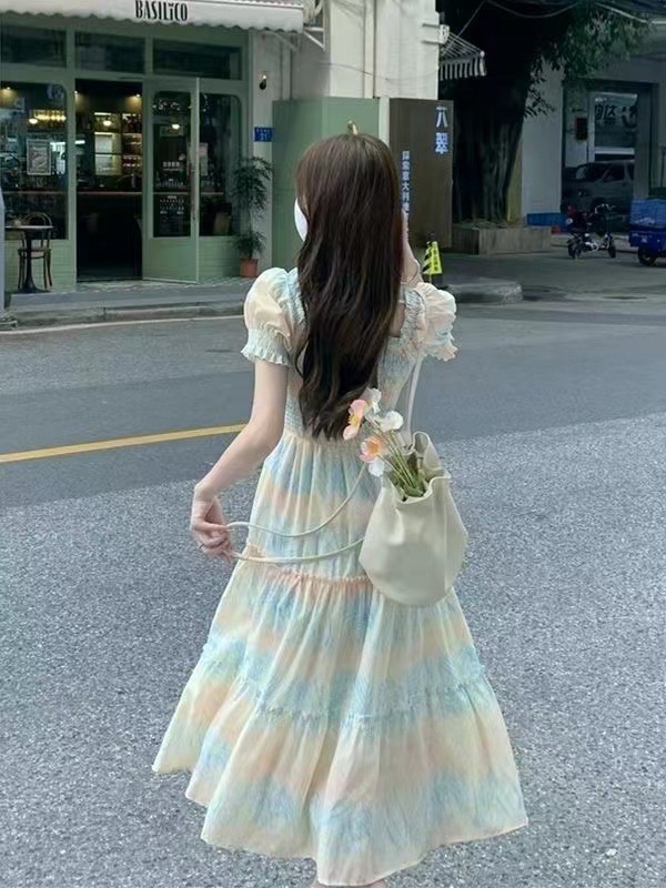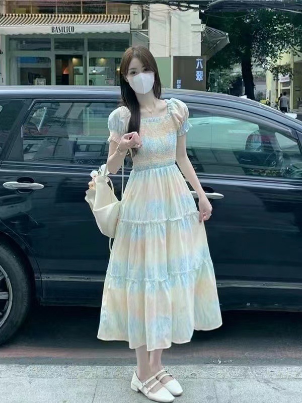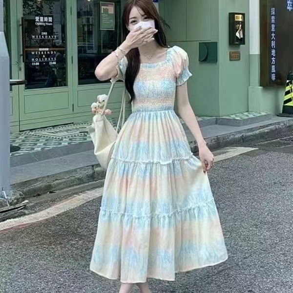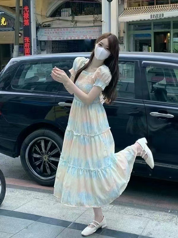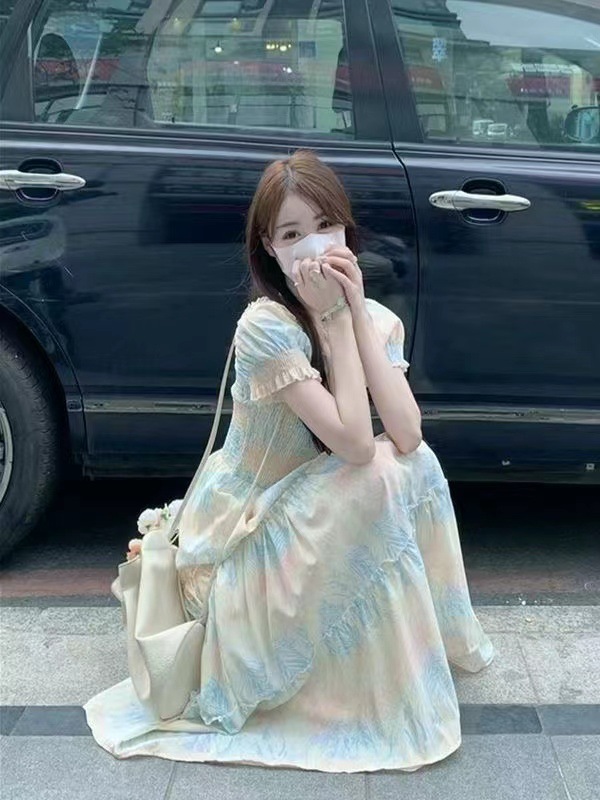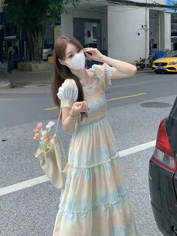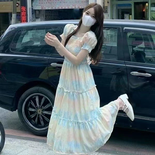 프랑스 스타일 Platycodon Grandiflorum Floral 원피스 여성 2024 년 여름 새 스타일 우아한 고급 타이트 허리 슬리밍 오버 더 무릎 중간 길이 스커트스토어 가기