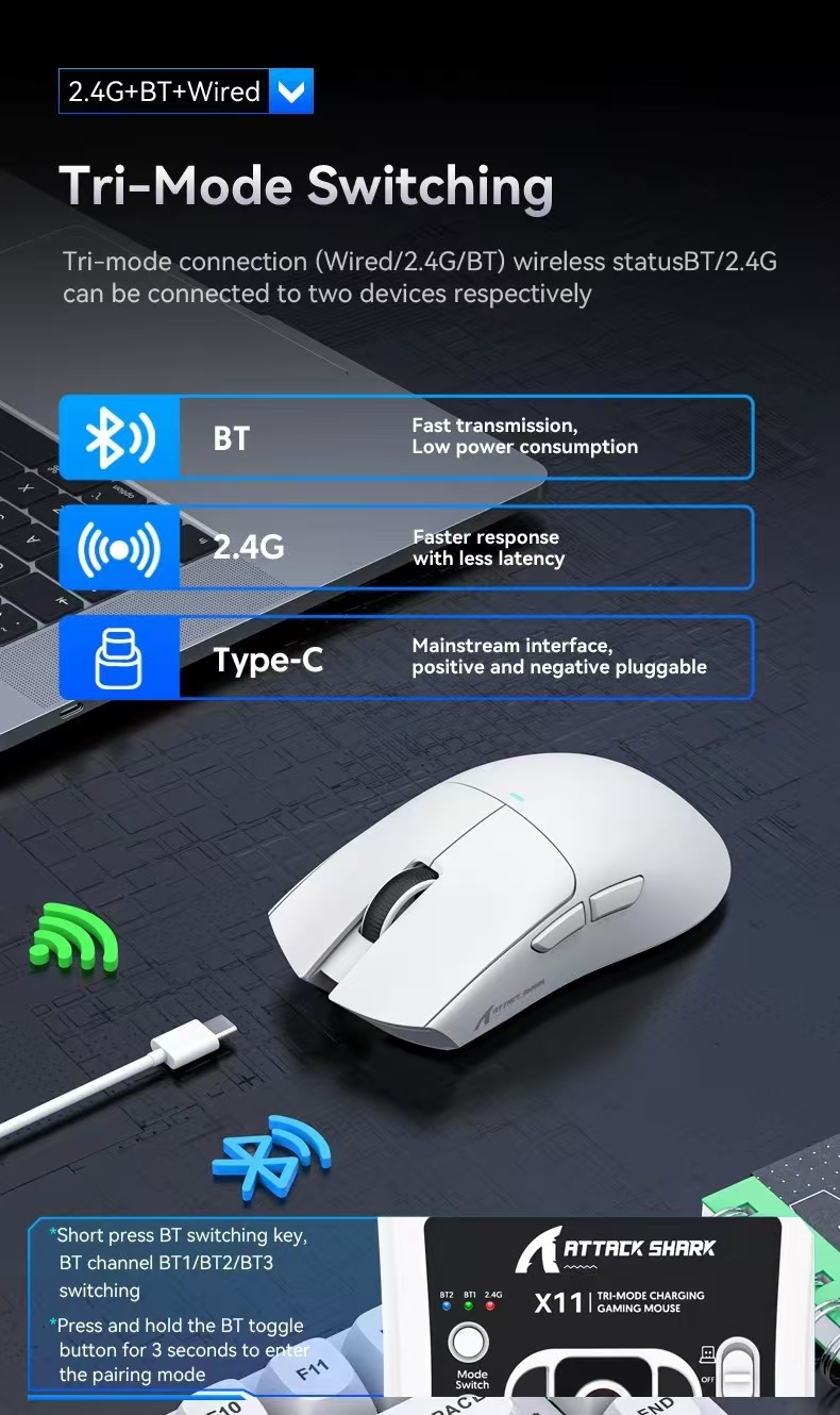 连接方式:2.4G无线+蓝牙5.0+TYPE-C有线