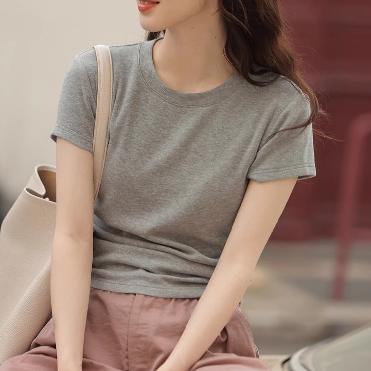 [재고] 1313 사이드 주름 회색 디자인 틈새 티셔츠 어깨 캐주얼 짧은 소매 스파이스 걸스 슬림 탑스토어 가기