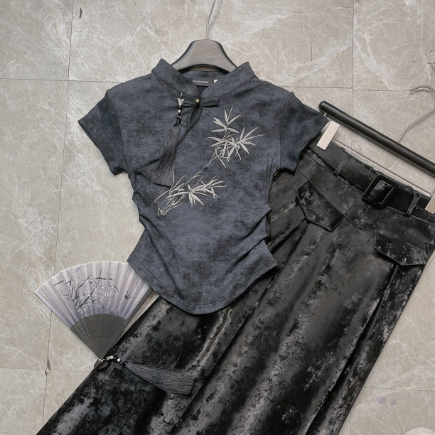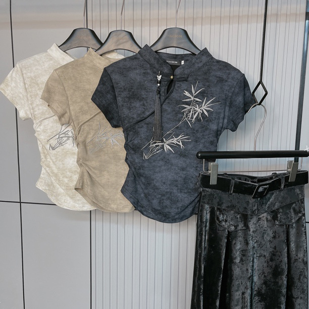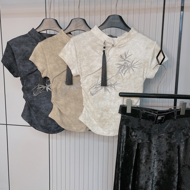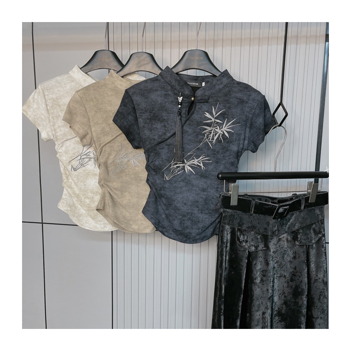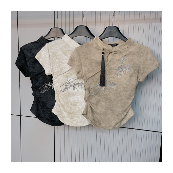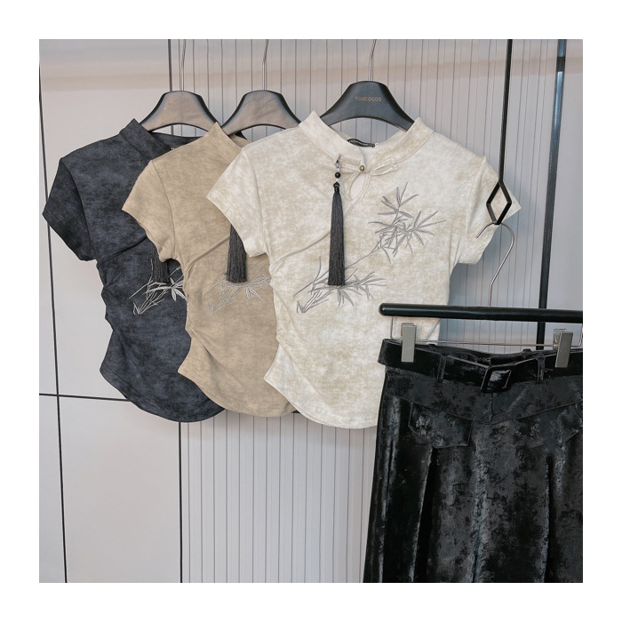 새로운 중국 스타일 국가 스타일 자수 반팔 티셔츠 2024 여름 새로운 디자인 센스 니쉬 버클 수직 칼라 우아한 탑스토어 가기