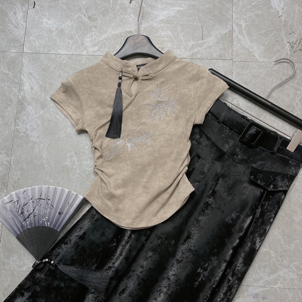 새로운 중국 스타일 국가 스타일 자수 반팔 티셔츠 2024 여름 새로운 디자인 센스 니쉬 버클 수직 칼라 우아한 탑