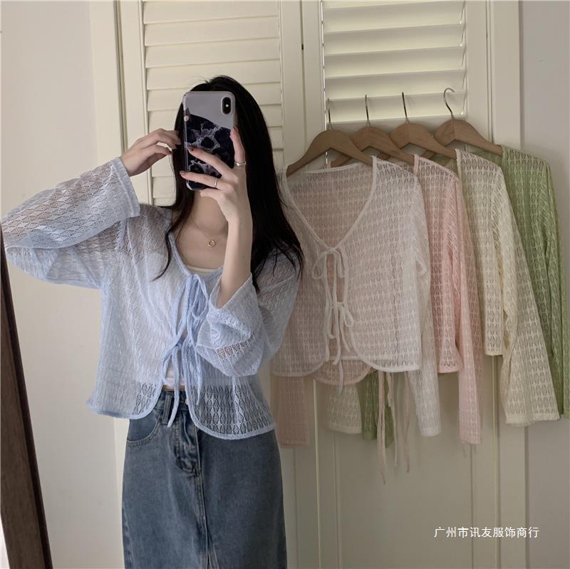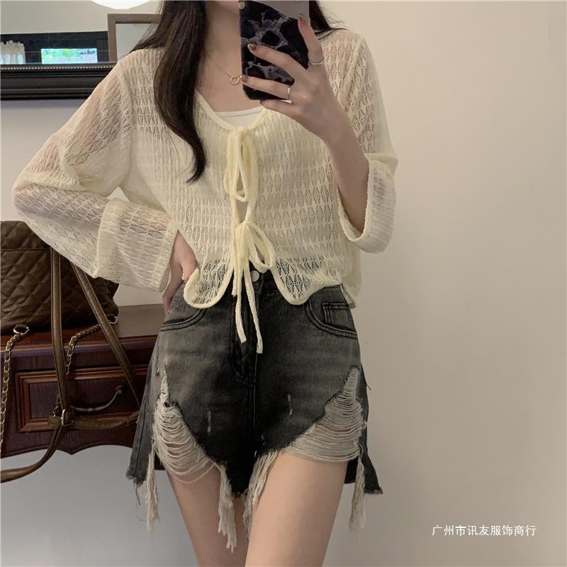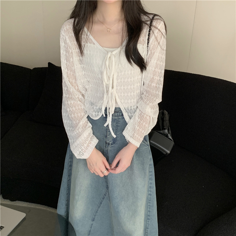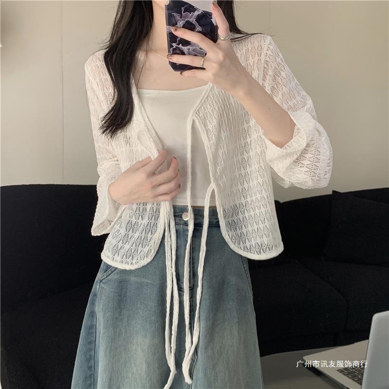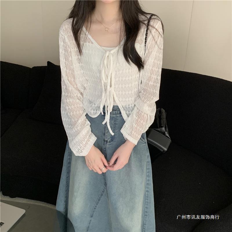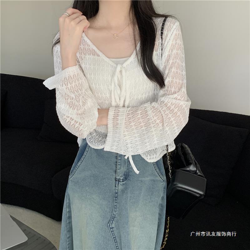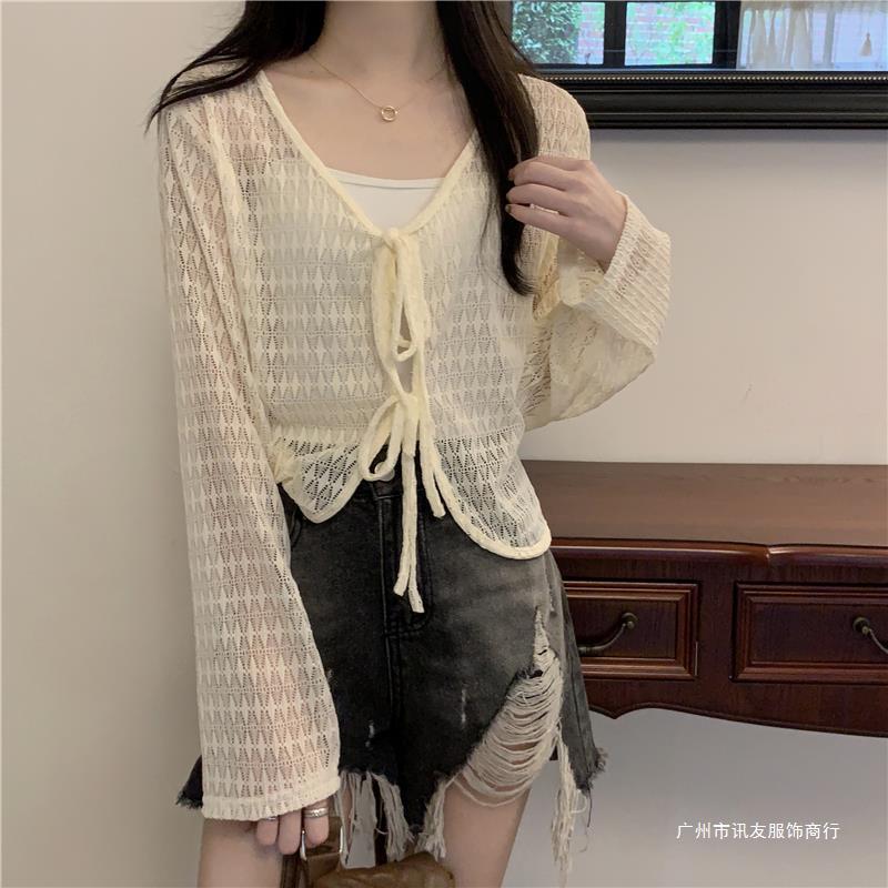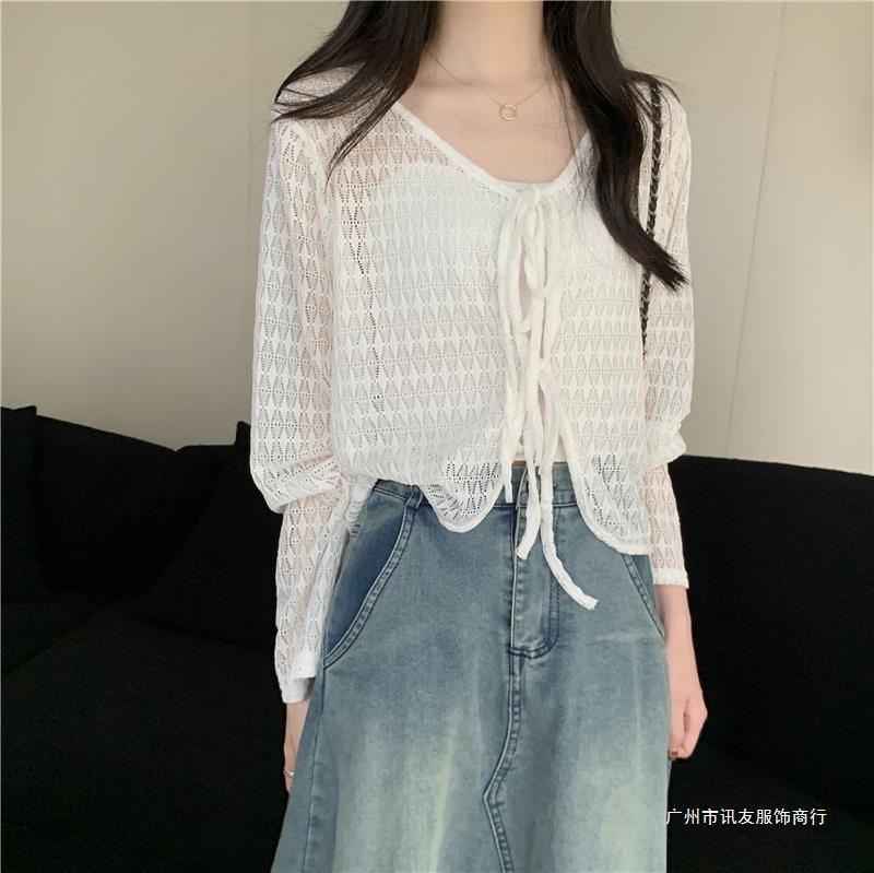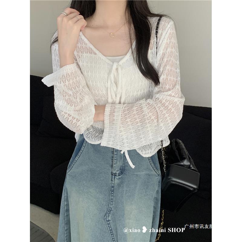 틈새 메쉬 연간 선스크린 탑 긴 소매 감각 느슨한 새 시즌 2024 디자인 니트 셔츠 여성의 여름 화이트 V-Neck스토어 가기