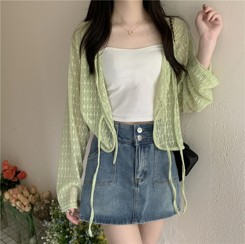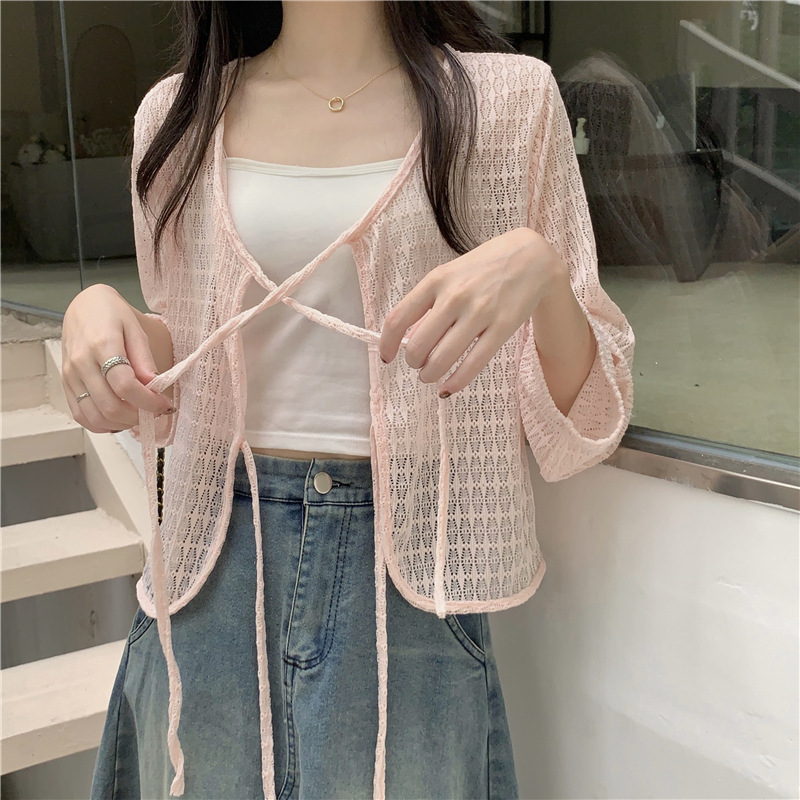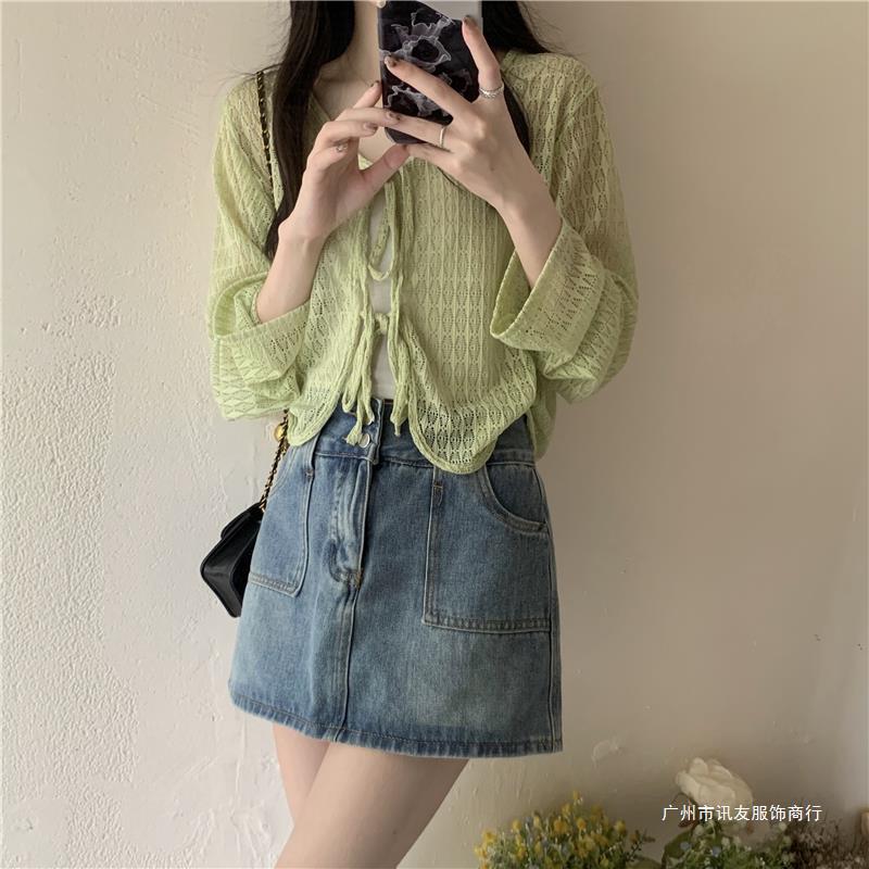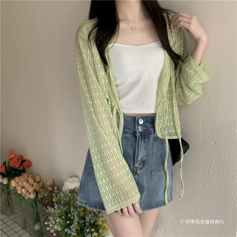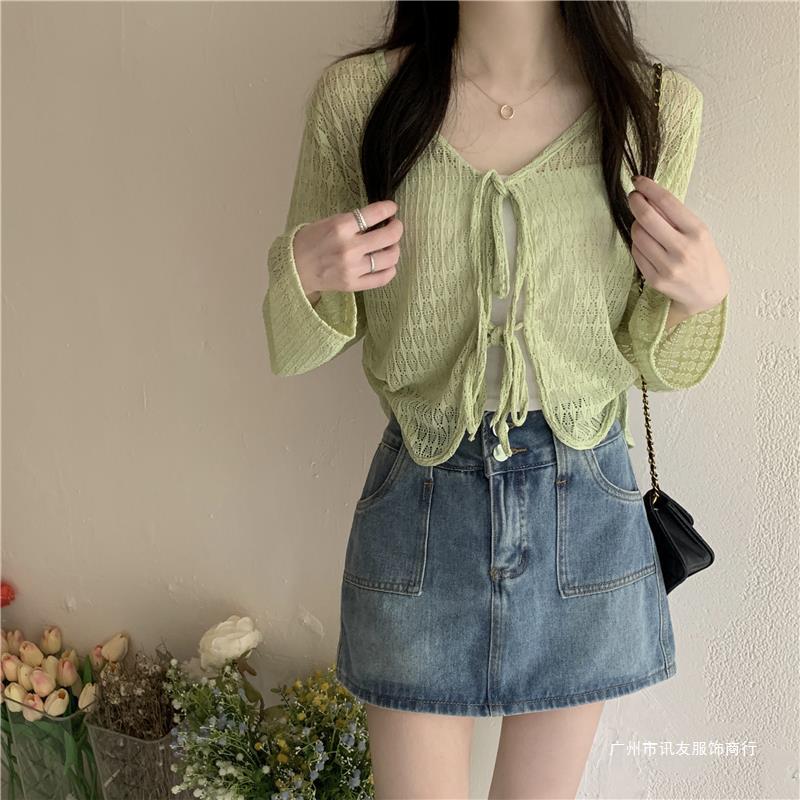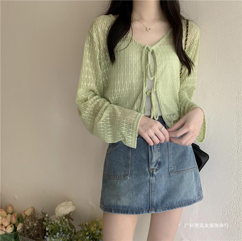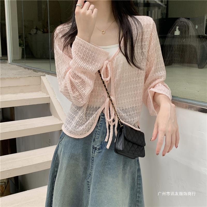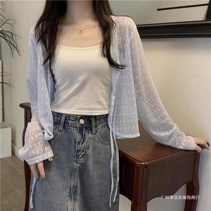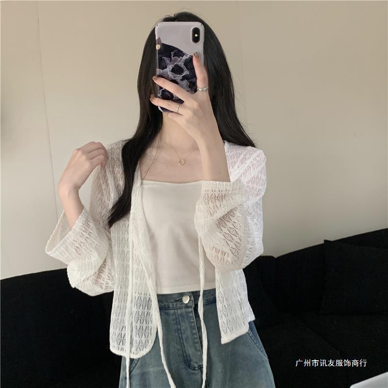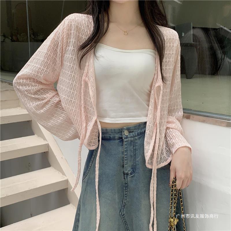 틈새 메쉬 연간 선스크린 탑 긴 소매 감각 느슨한 새 시즌 2024 디자인 니트 셔츠 여성의 여름 화이트 V-Neck스토어 가기