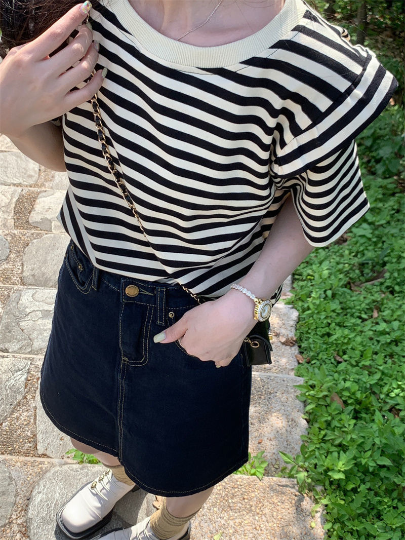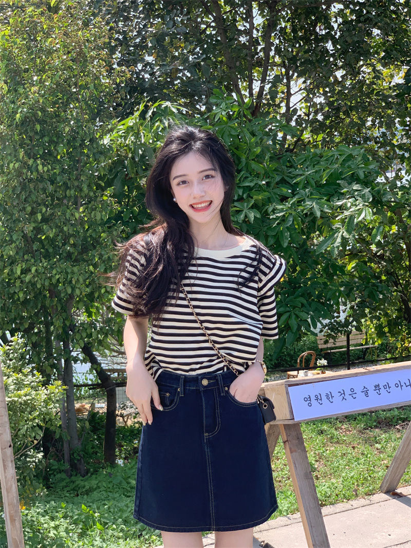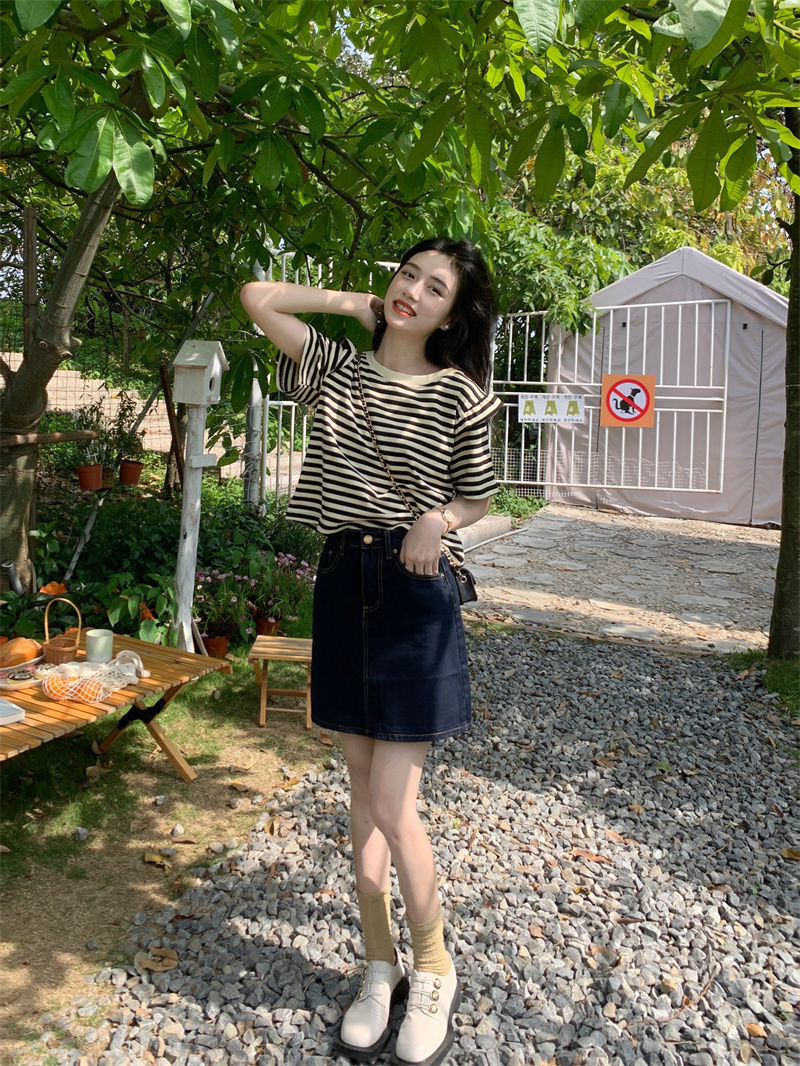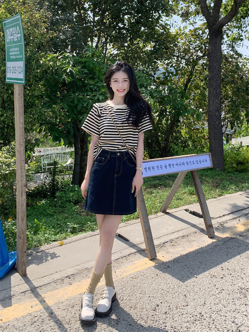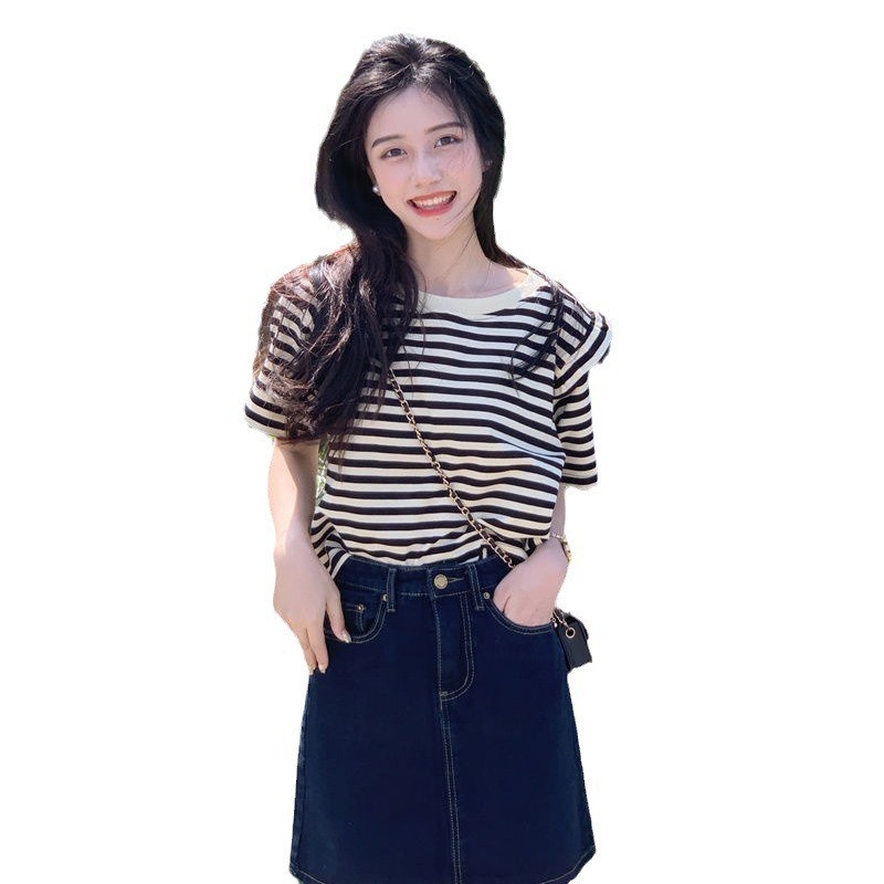 여성을위한 순수 코튼 곰팡이 스트라이프 반팔 티셔츠 여름 2025 새로운 한국 스타일 라운드 넥 디자인 데님 스커트 정장스토어 가기