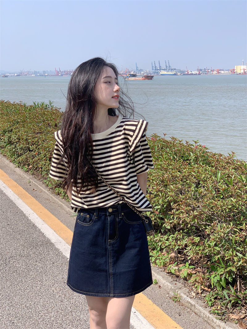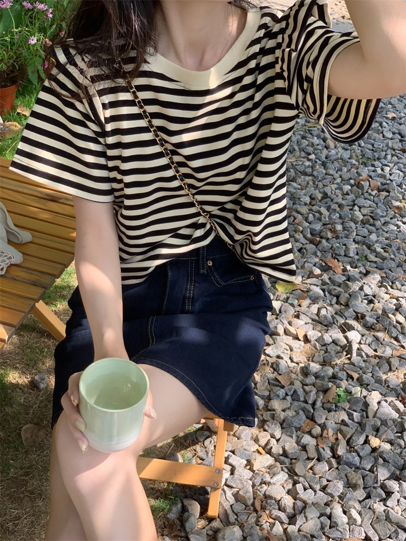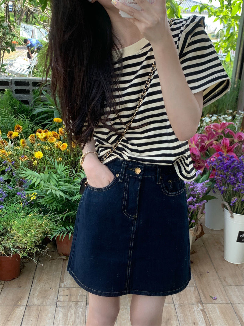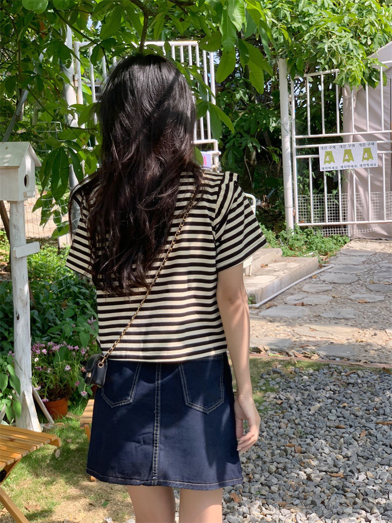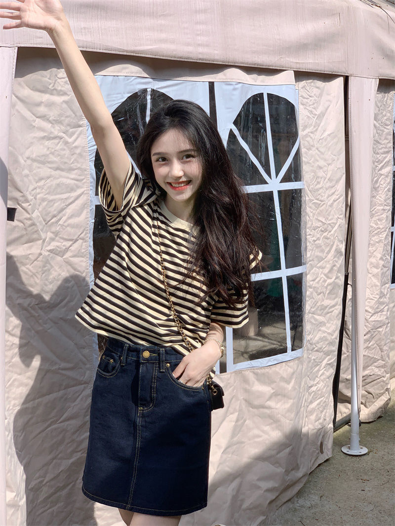 여성을위한 순수 코튼 곰팡이 스트라이프 반팔 티셔츠 여름 2025 새로운 한국 스타일 라운드 넥 디자인 데님 스커트 정장스토어 가기