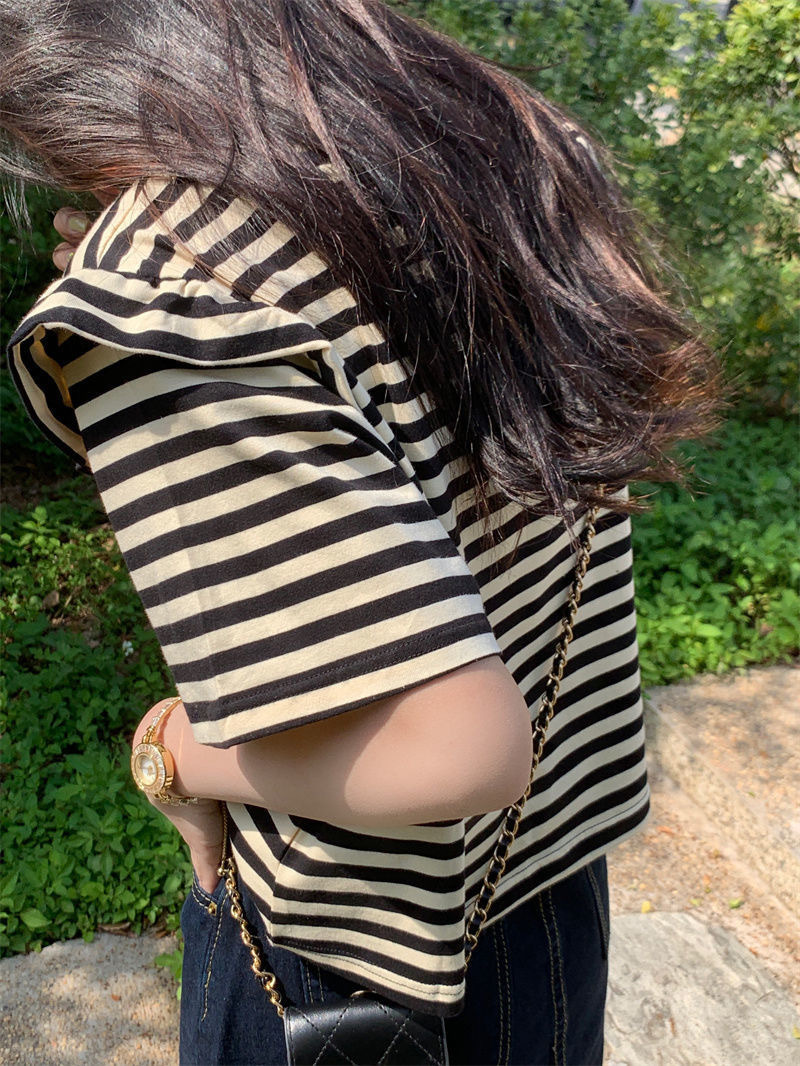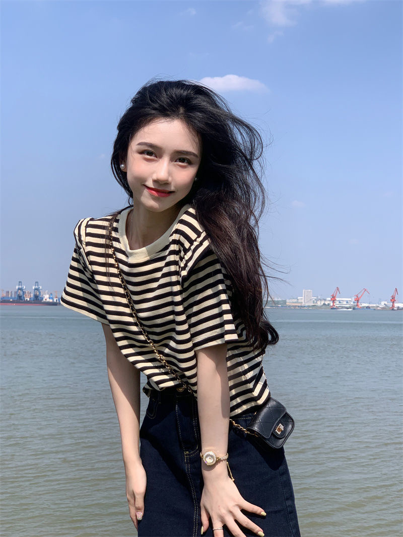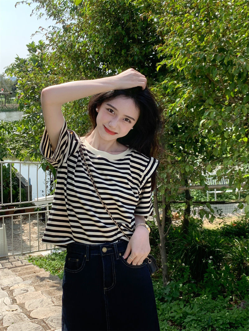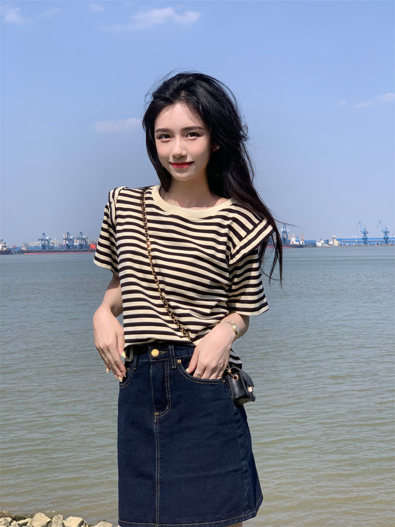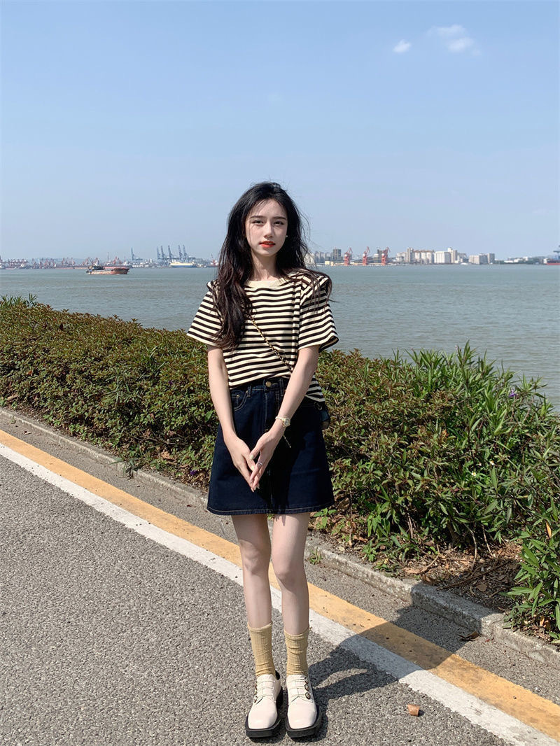 여성을위한 순수 코튼 곰팡이 스트라이프 반팔 티셔츠 여름 2025 새로운 한국 스타일 라운드 넥 디자인 데님 스커트 정장스토어 가기