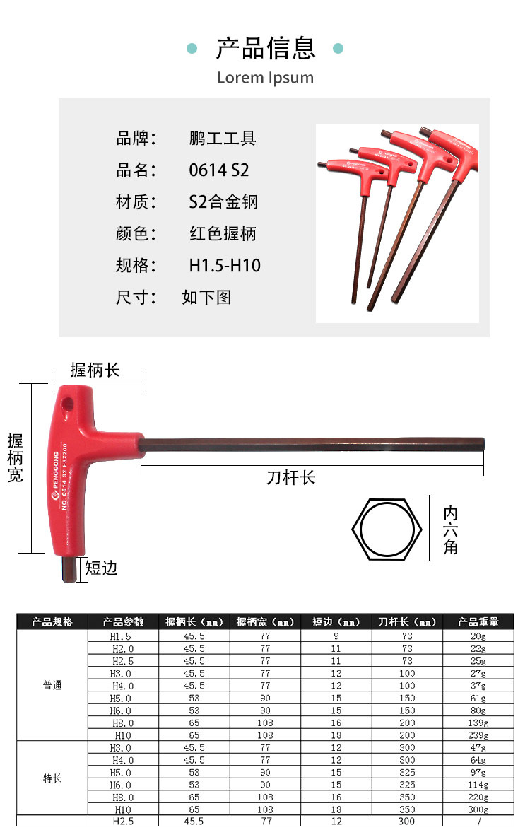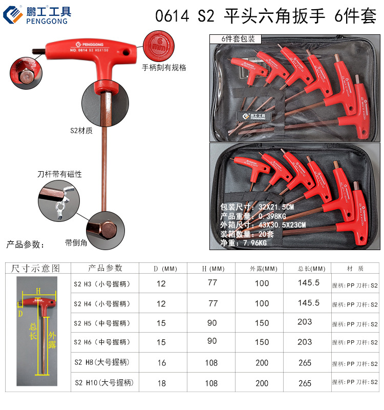 손잡이가 있는 S2 지팡이 육각 렌치/드라이버 Penggong T자형 육각 렌치 빨간색 육각형 0614 세트