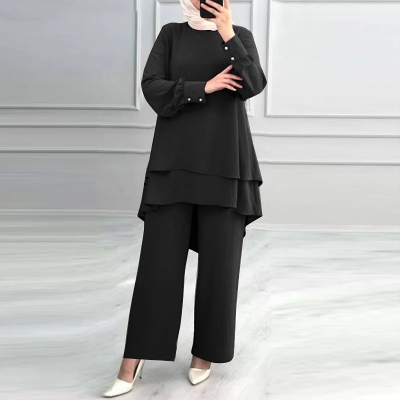 재고 있음 H731 이슬람 신작 여성복 솔리드 컬러 더블 레이어 탑 세련되고 우아한 루즈 와이드 레그 팬츠 슈트스토어 가기