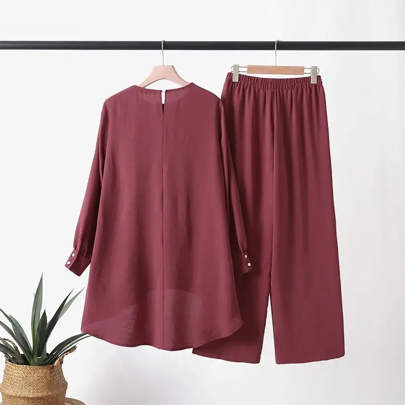 재고 있음 H731 이슬람 신작 여성복 솔리드 컬러 더블 레이어 탑 세련되고 우아한 루즈 와이드 레그 팬츠 슈트