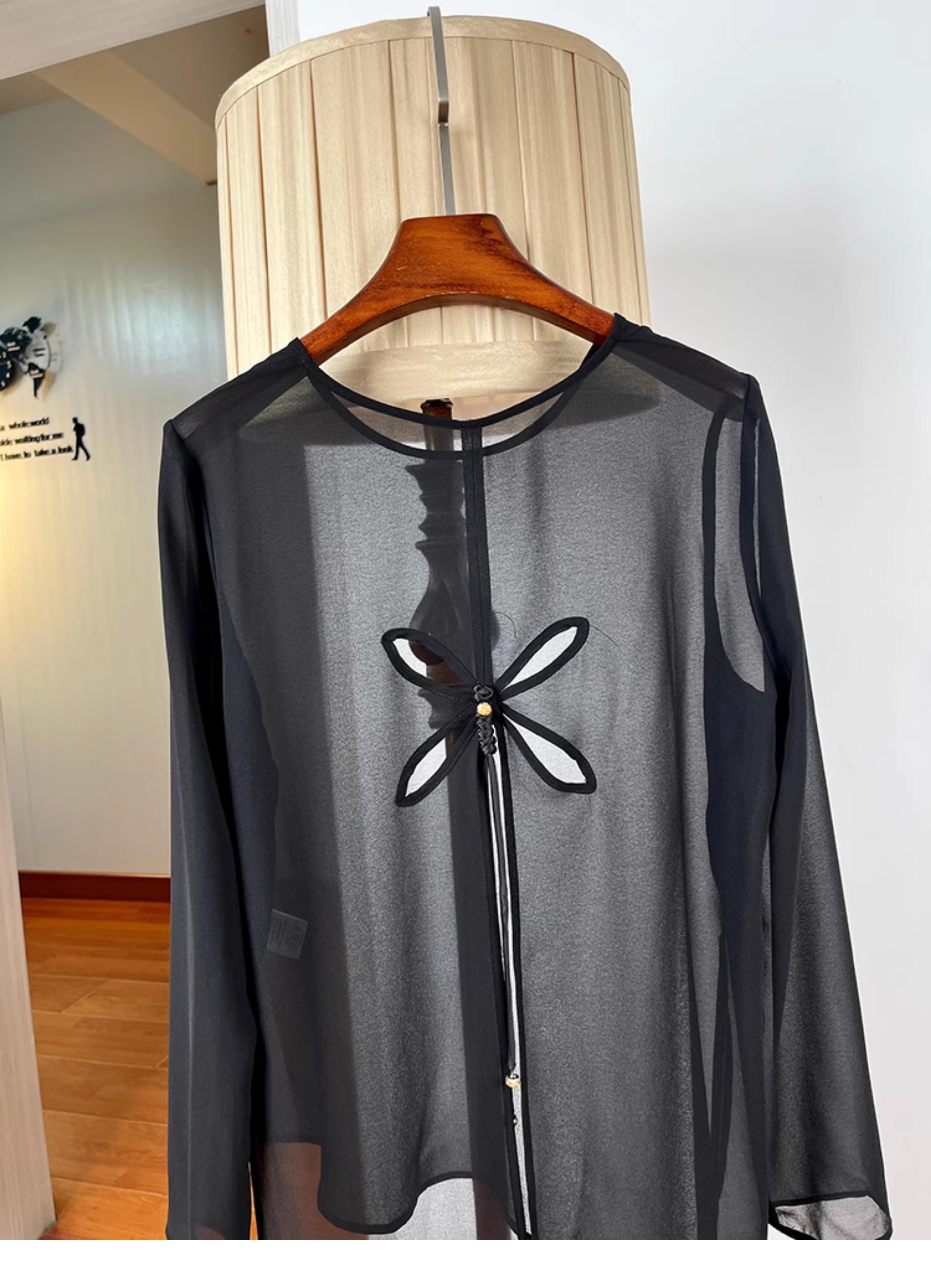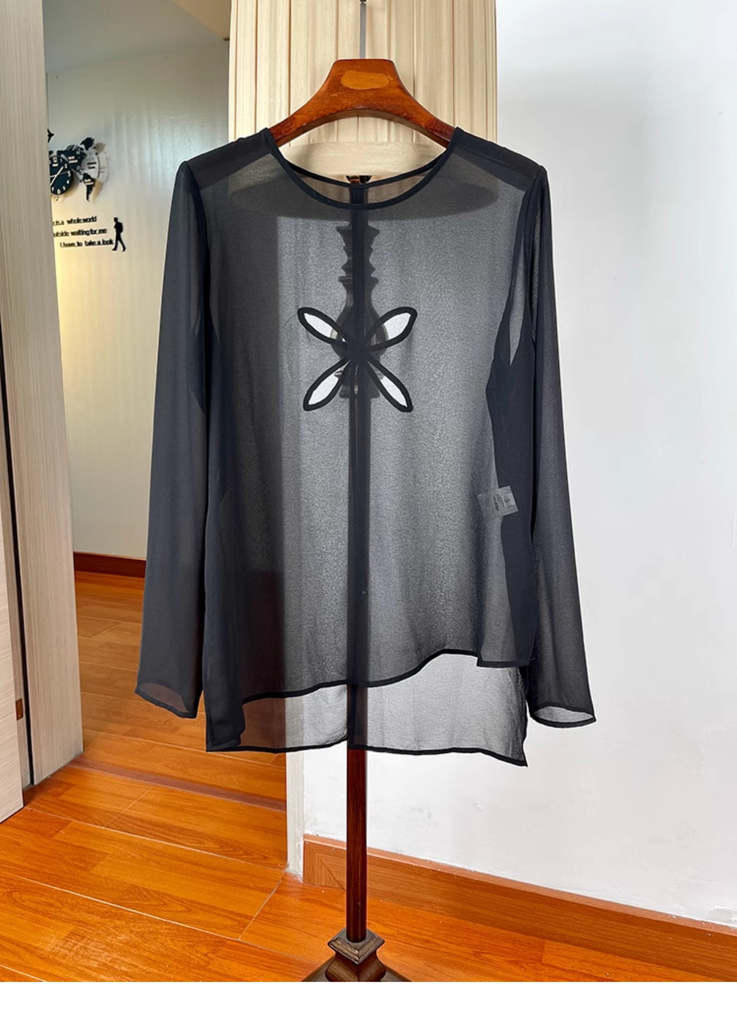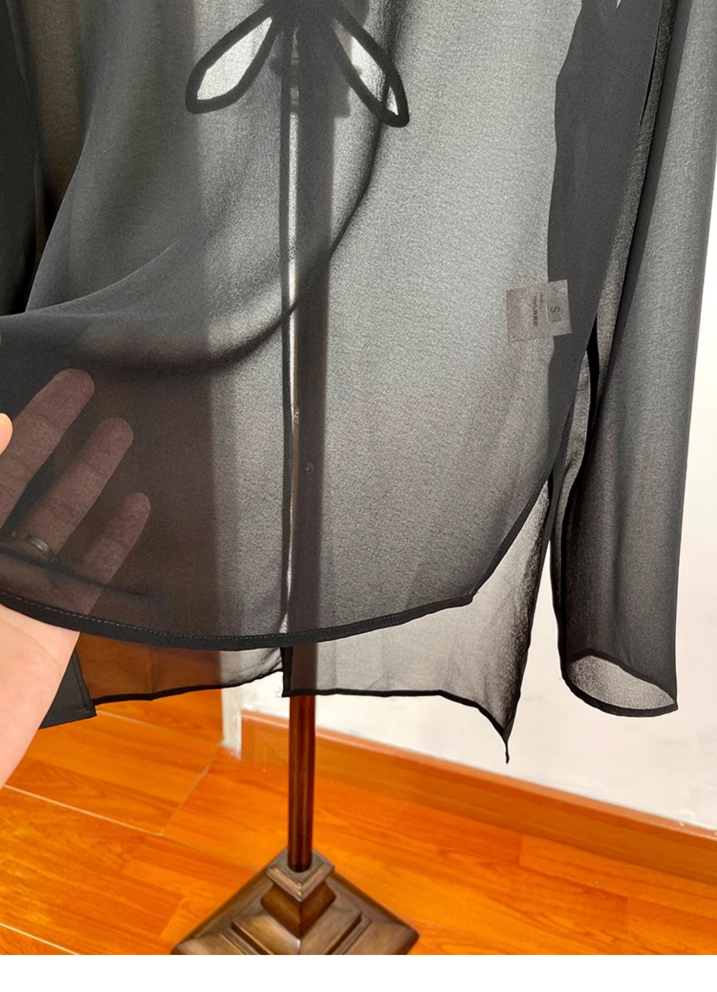 Perspective Tulle Blouse 느슨한 배꼽 커버 쉬폰 블라우스 여성의 여름 얇은 불규칙 Hem Georgette 선 스크린 탑