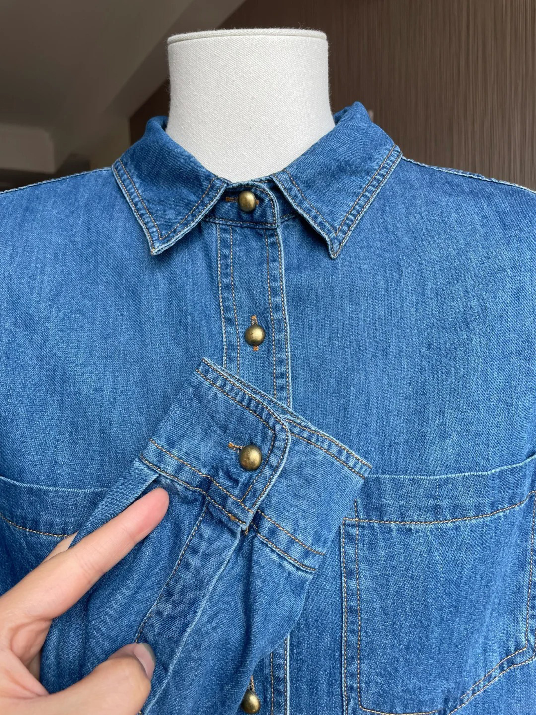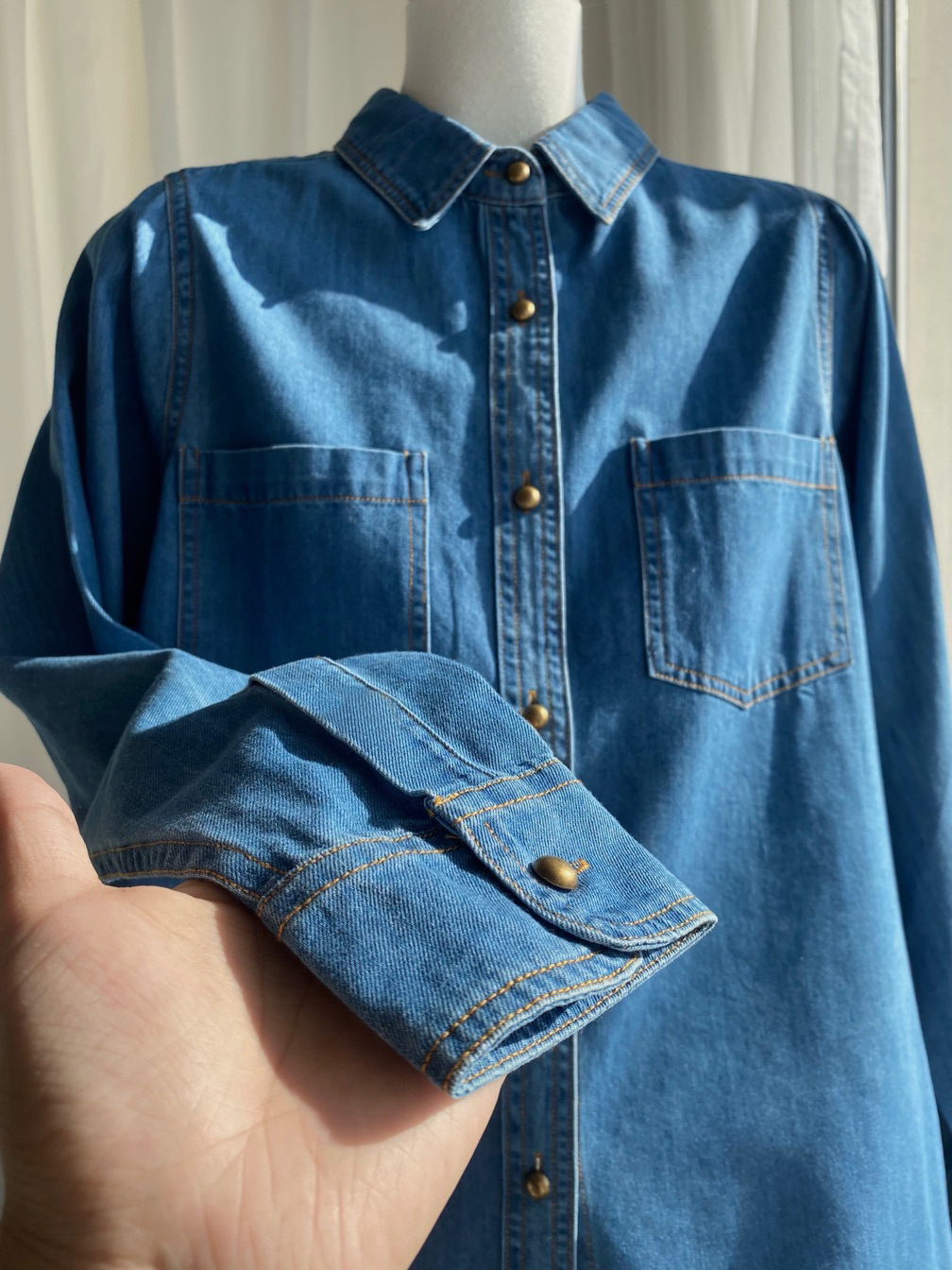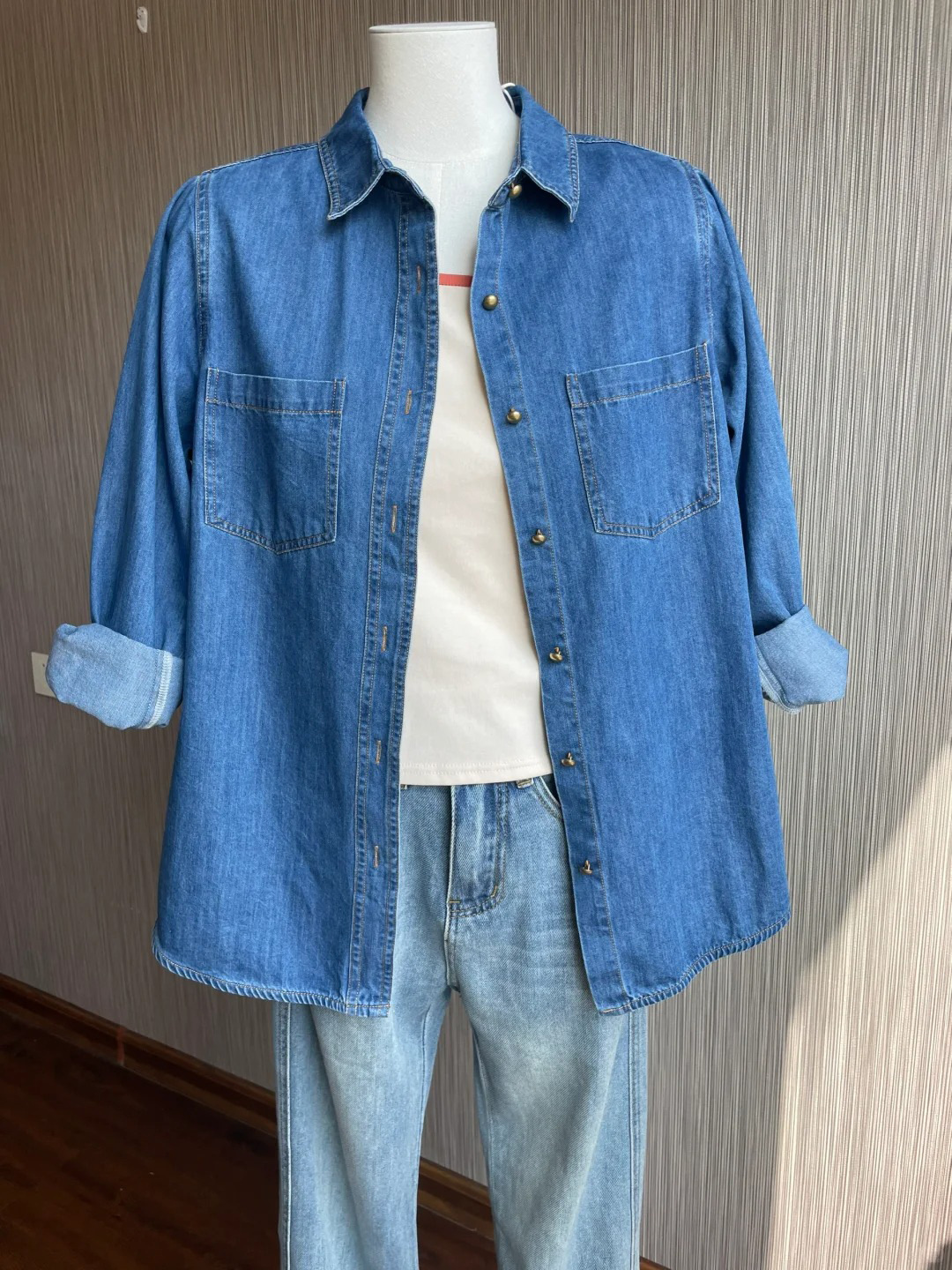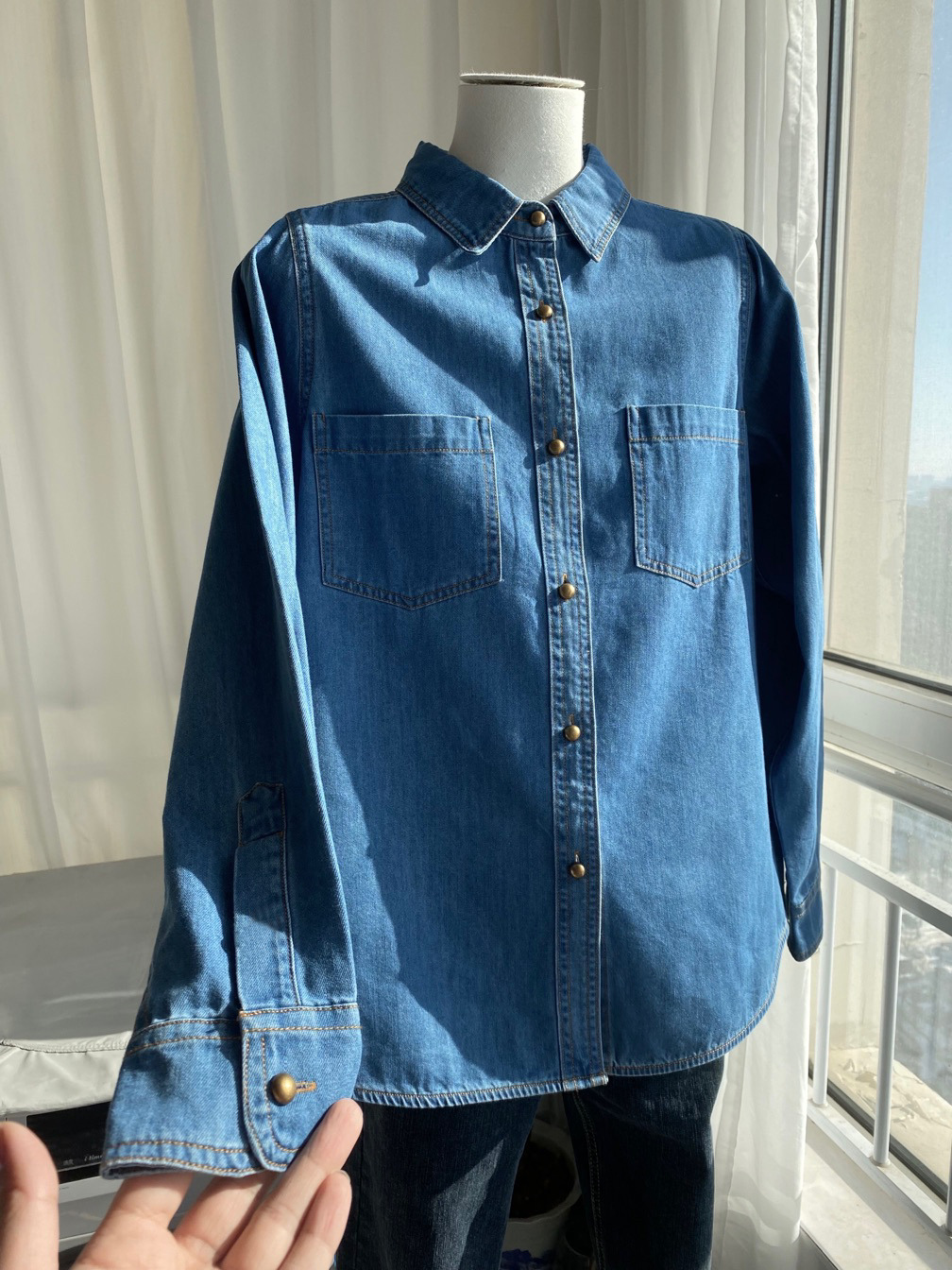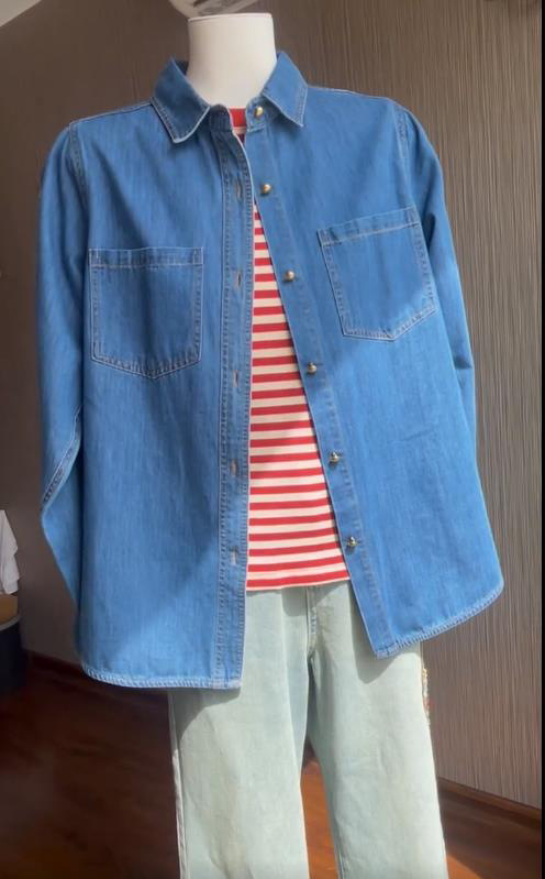 여성 데님 셔츠 봄 홍콩 스타일 블루 캐주얼 루즈핏 어깨 노출 셔츠 슬림핏 이너웨어스토어 가기