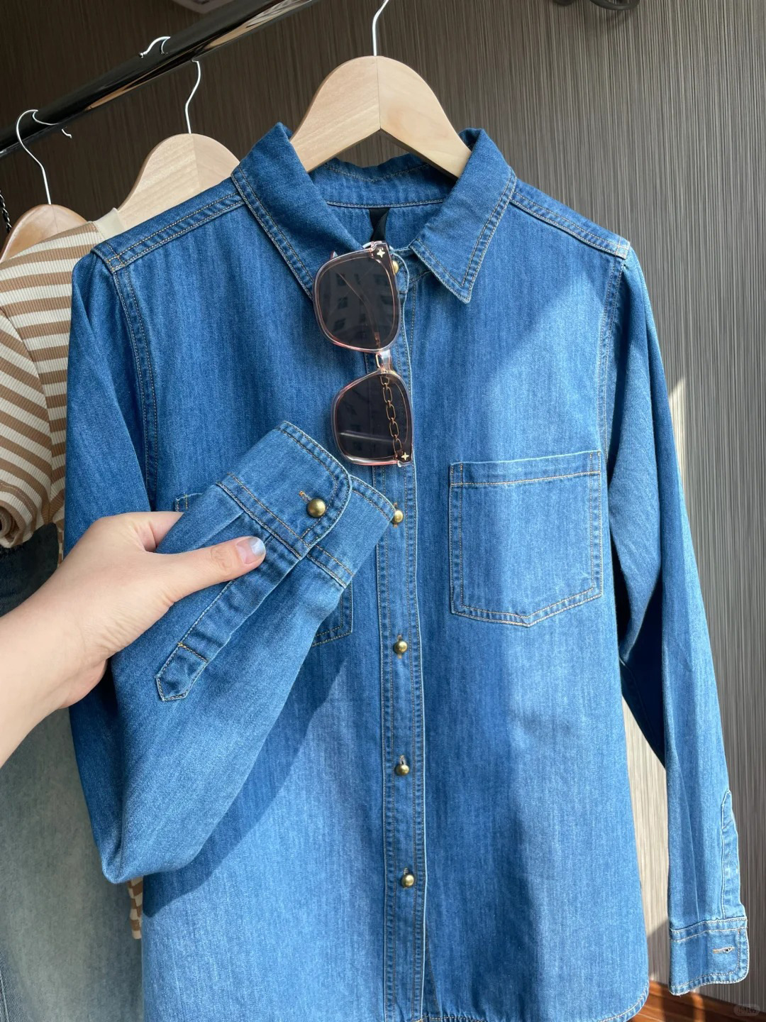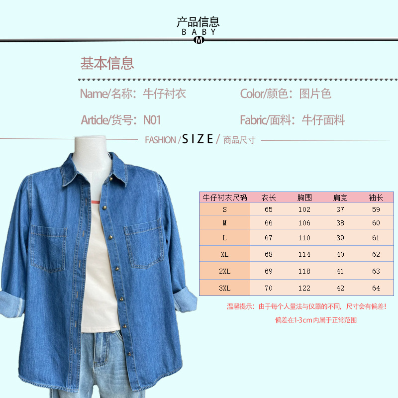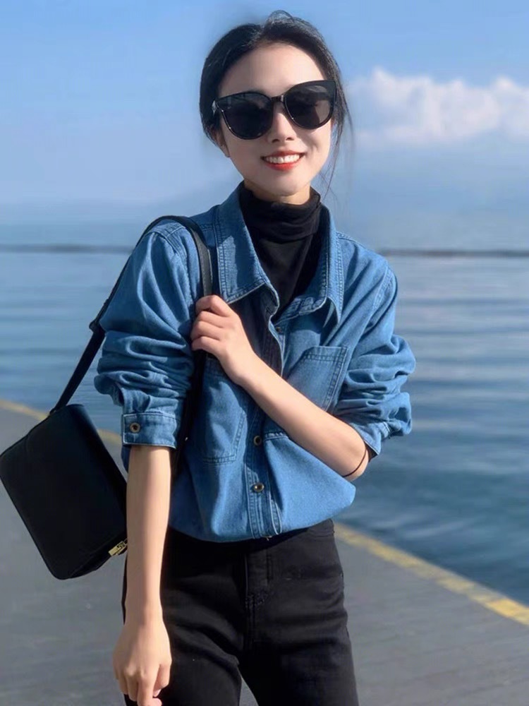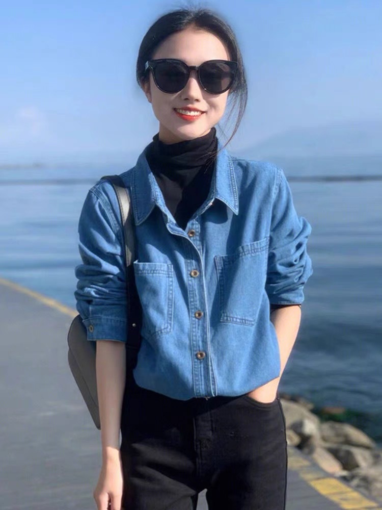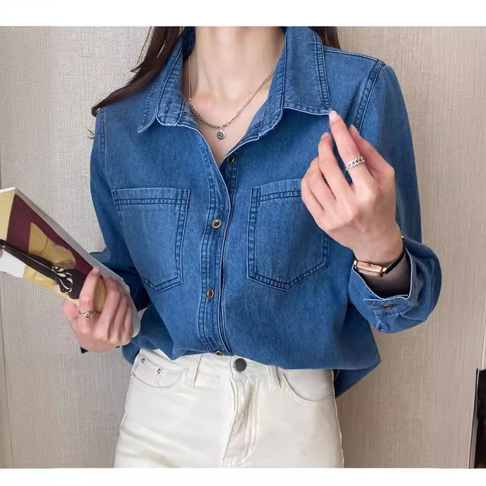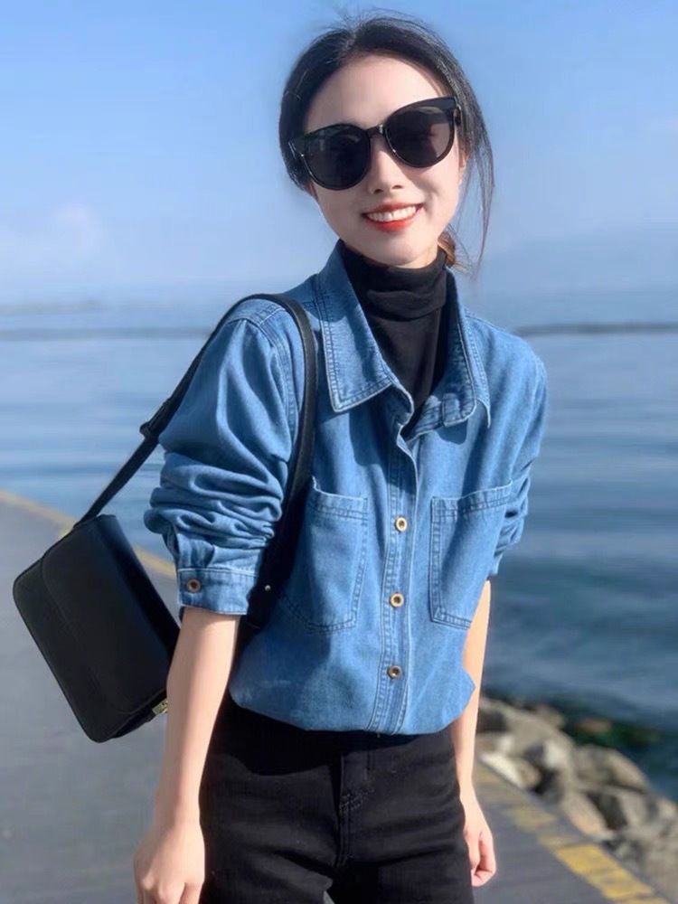 여성 데님 셔츠 봄 홍콩 스타일 블루 캐주얼 루즈핏 어깨 노출 셔츠 슬림핏 이너웨어
