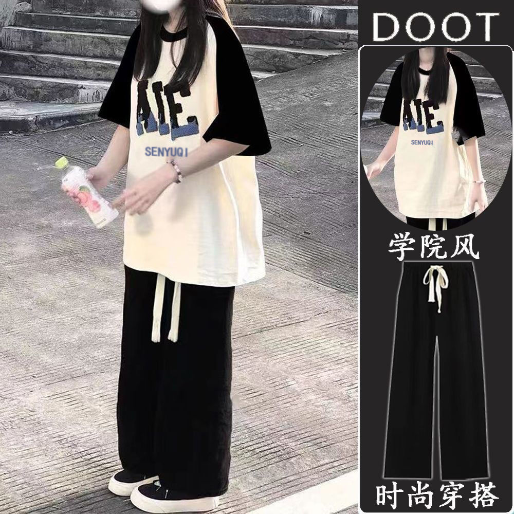 소녀 세트 여름 반팔 큰 소년 학생 스타일 티셔츠 느슨한 캐주얼 와이드 레그 바지 인터넷 인기 투피스 패셔너블스토어 가기