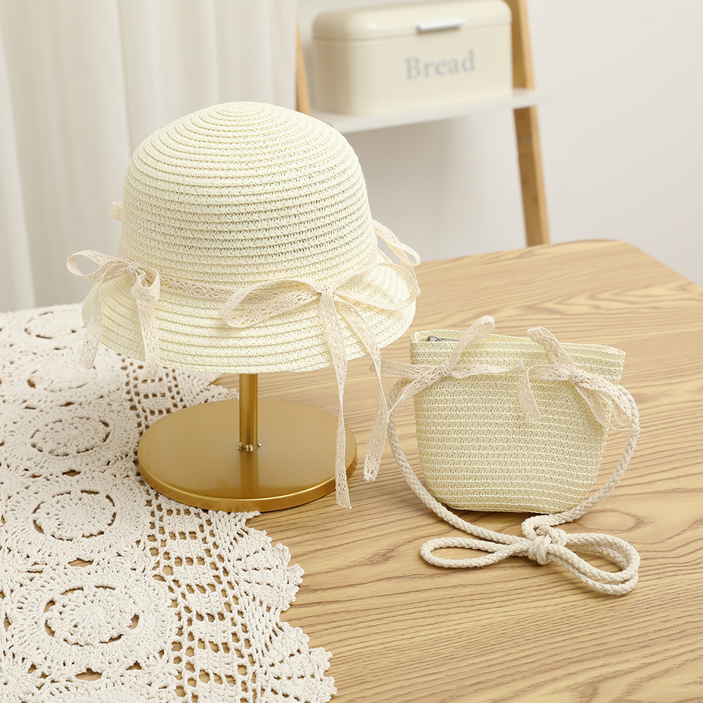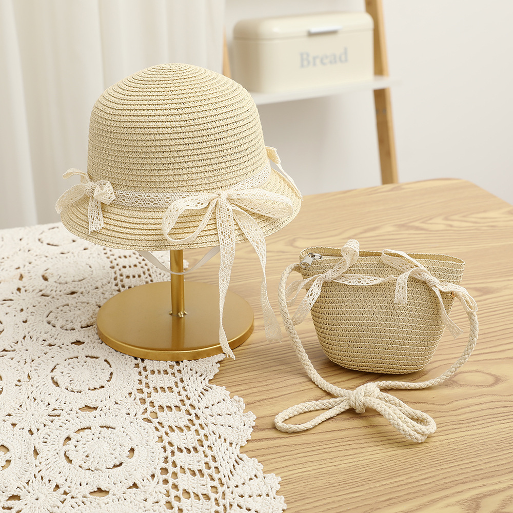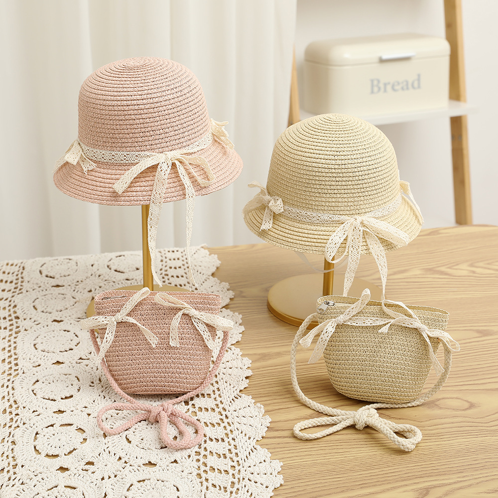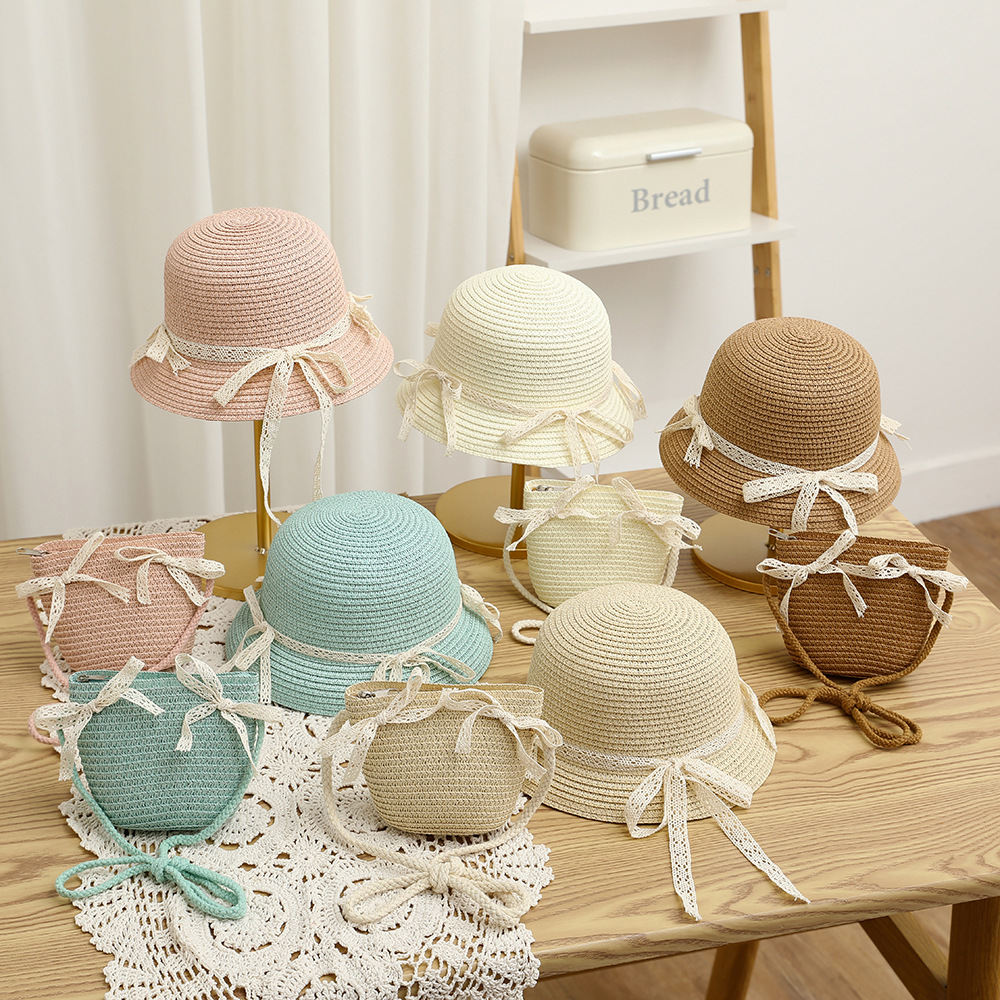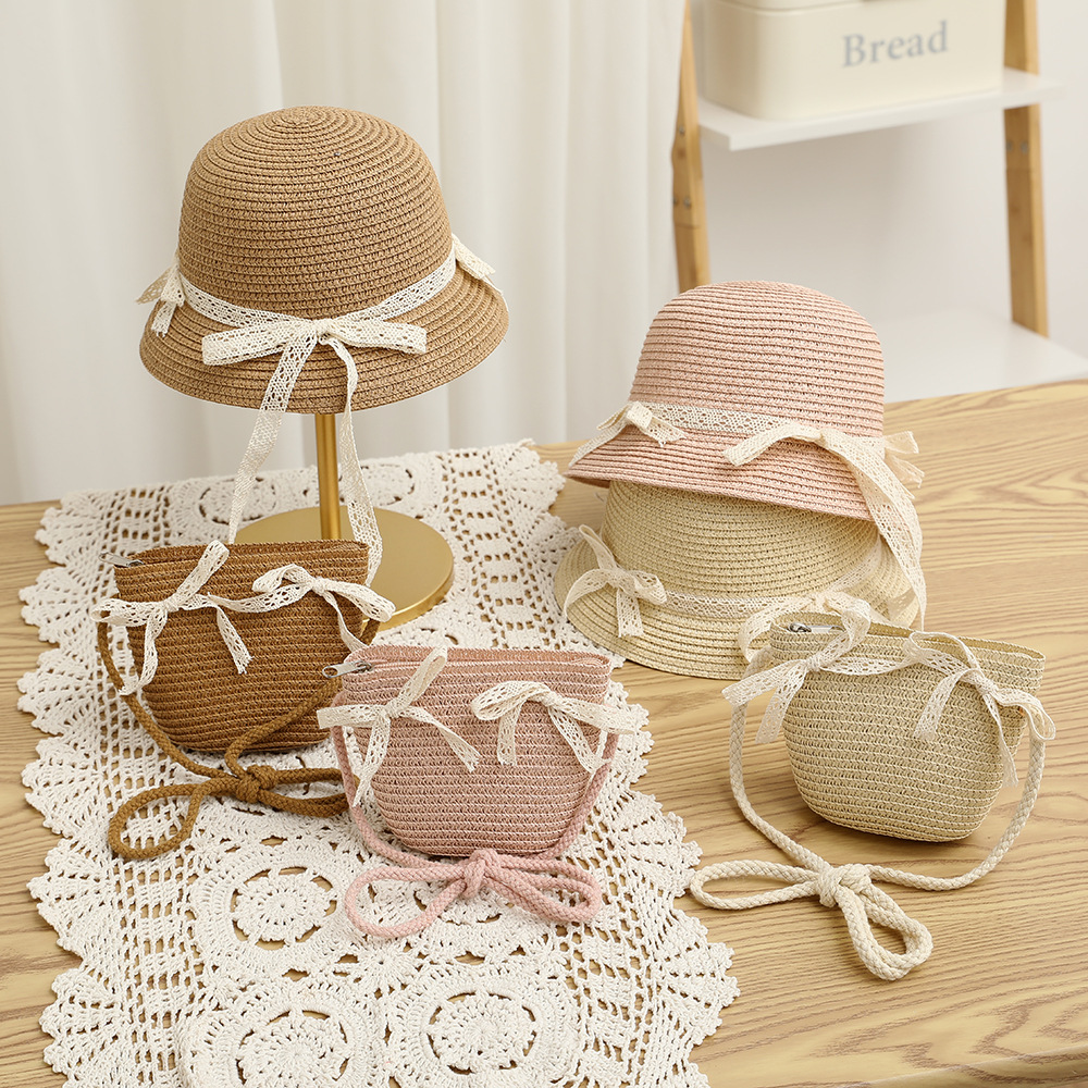 여름 어린이 밀짚 모자 물결 레이스 밀짚 모자 가방 2 종 세트 외국식 귀여운 나비 선 스크린 태양 모자