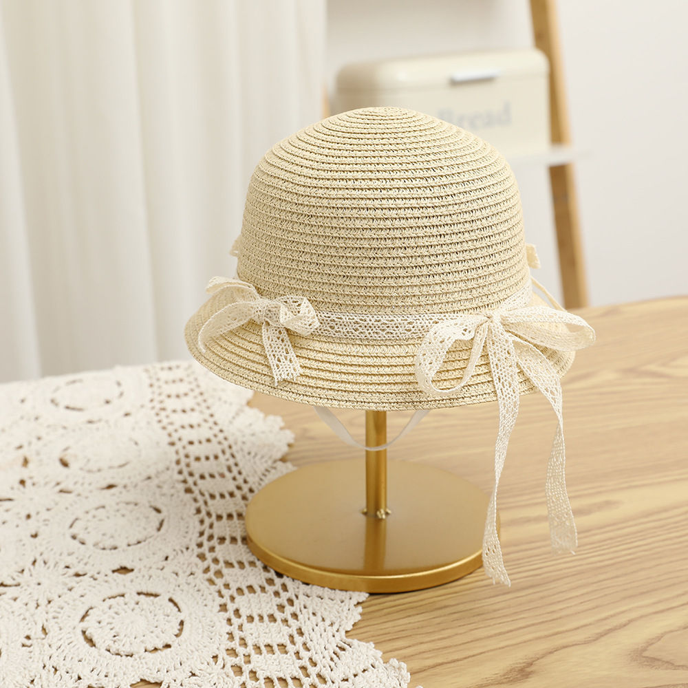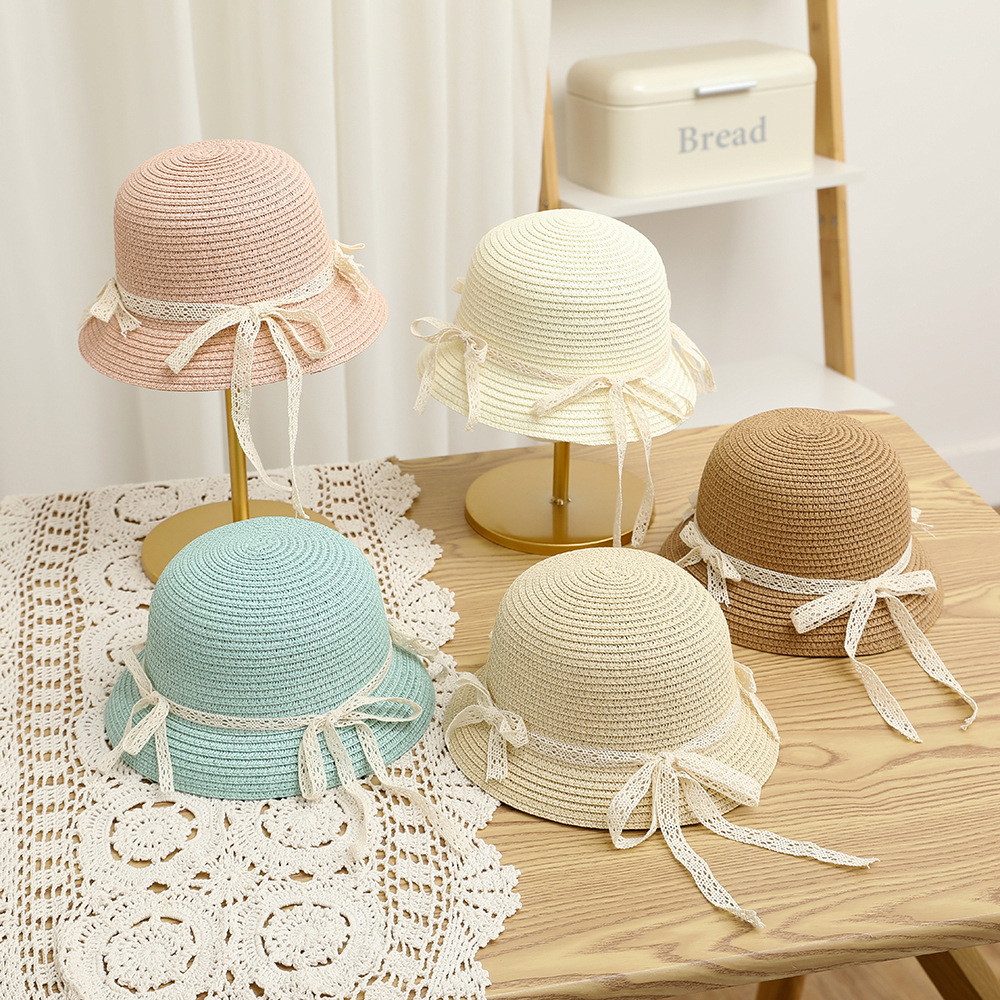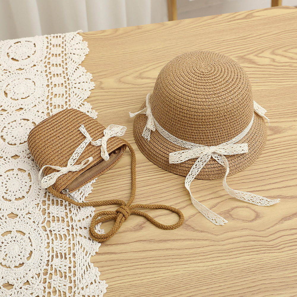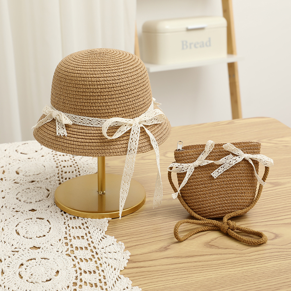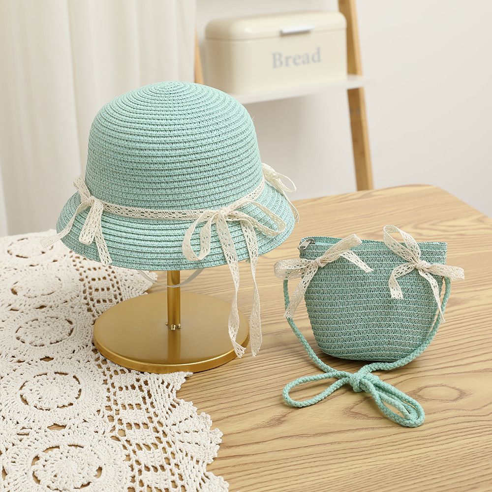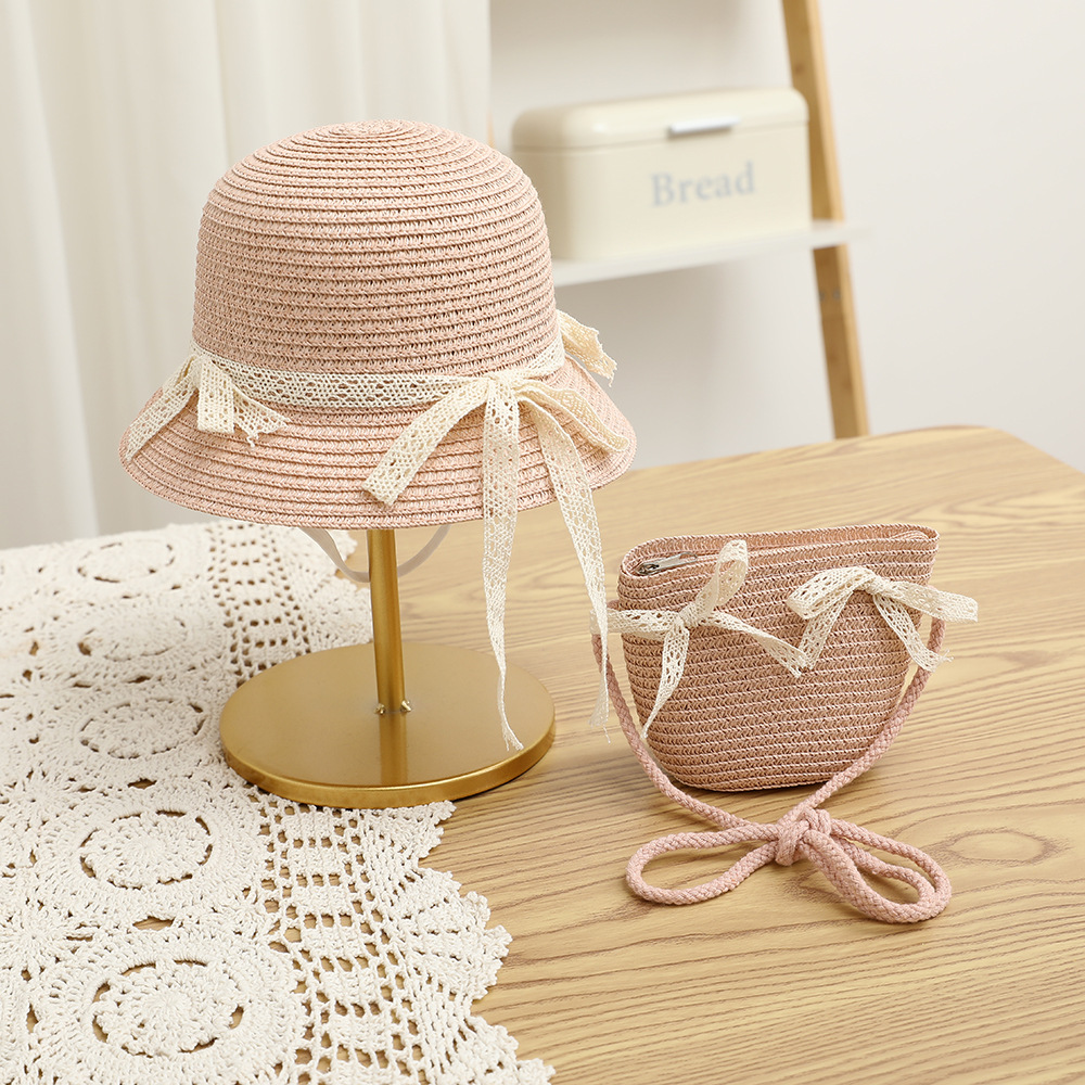 여름 어린이 밀짚 모자 물결 레이스 밀짚 모자 가방 2 종 세트 외국식 귀여운 나비 선 스크린 태양 모자